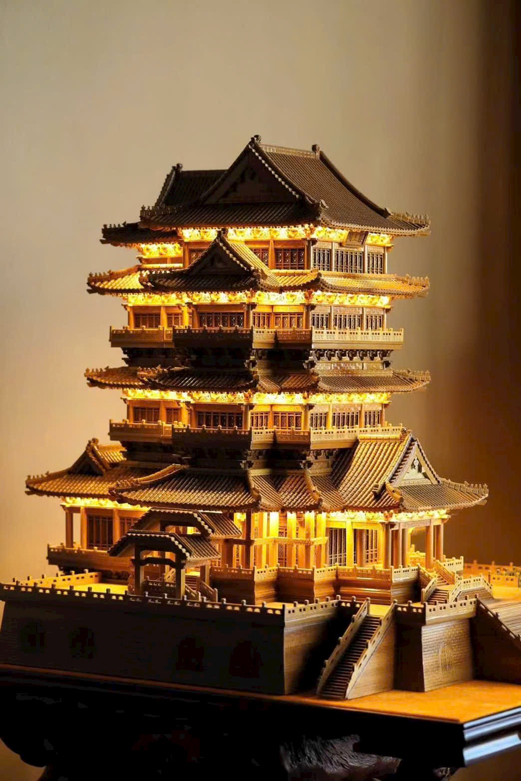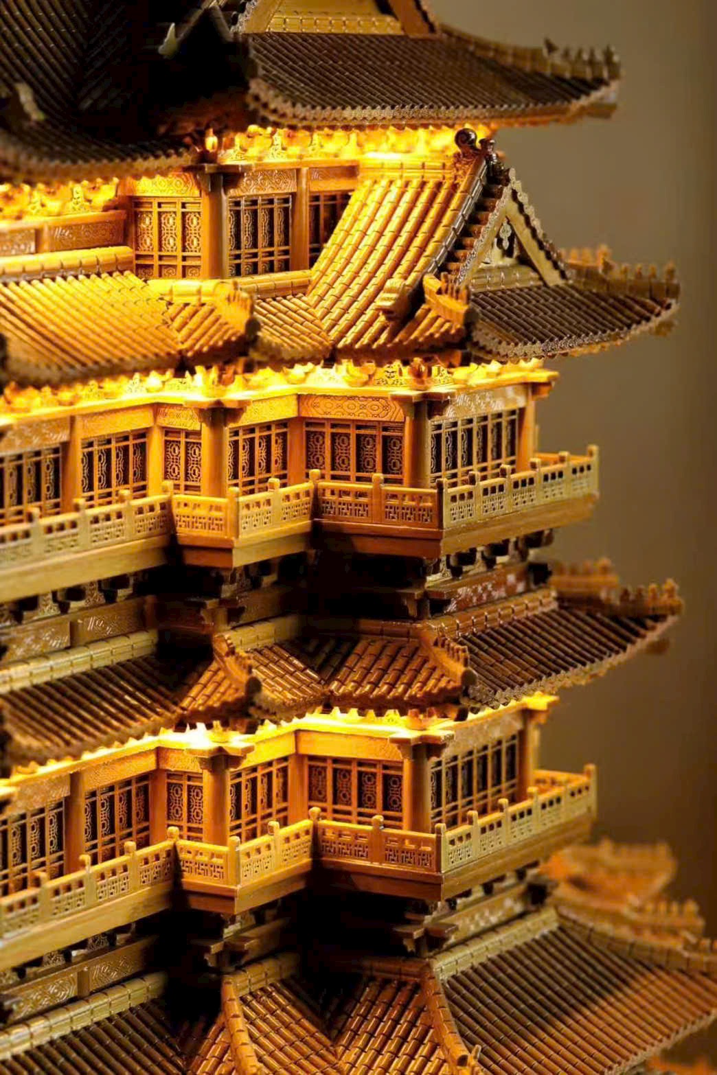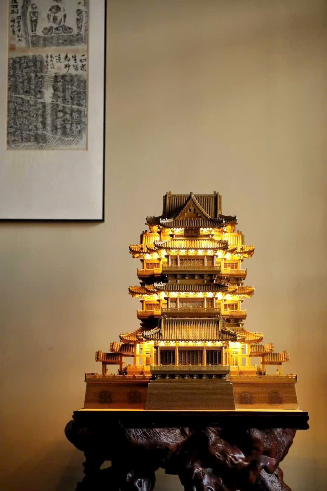 Tác phẩm được chế tác tinh xảo từ gỗ nam mộc, tái hiện nguyên mẫu kiến trúc cổ, dáng khối cân đối, đường chạm khắc tỉ mỉ. Phối hợp khéo léo hệ thống đèn trang trí ẩn, hiệu quả chiếu sáng nổi bật, tổng thể tinh tế, mang lại cảm giác hoài cổ, gợi nhớ trí tuệ, thiết kế và kỹ nghệ tuyệt vời của người xưa.