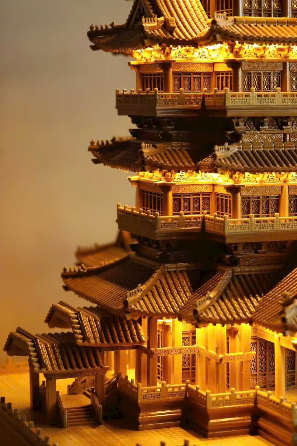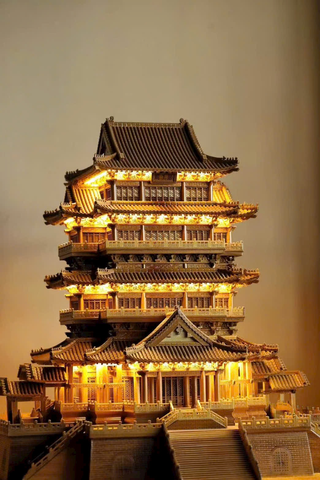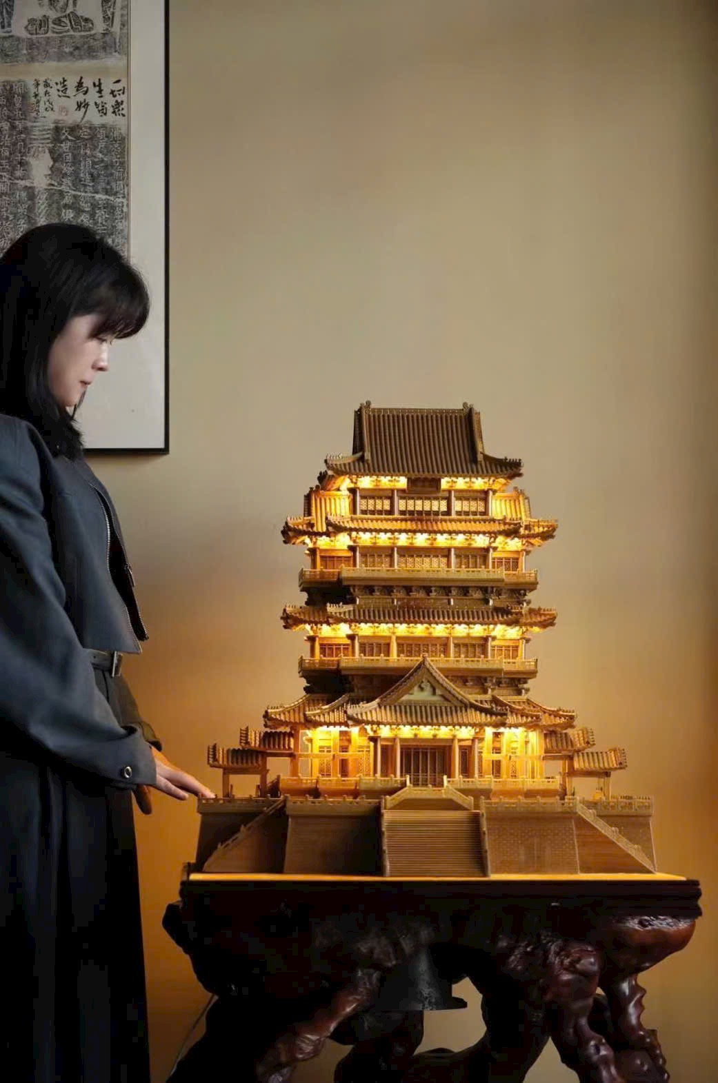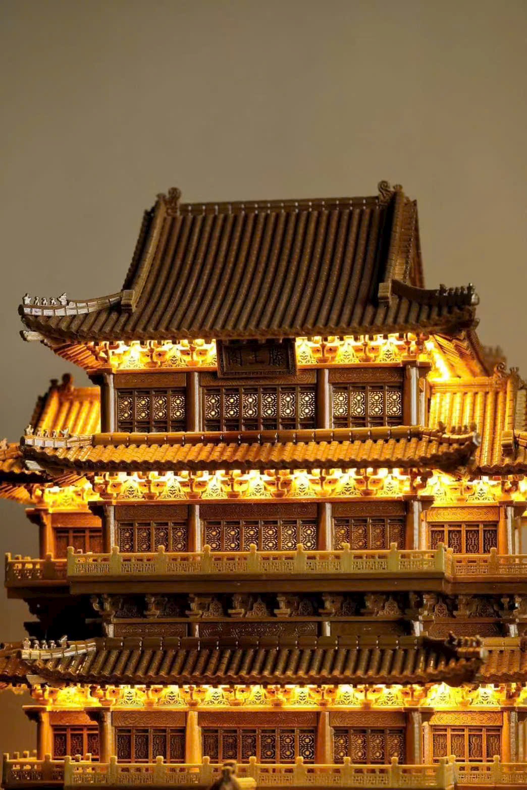 Tác phẩm được chế tác tinh xảo từ gỗ nam mộc, tái hiện nguyên mẫu kiến trúc cổ, dáng khối cân đối, đường chạm khắc tỉ mỉ. Phối hợp khéo léo hệ thống đèn trang trí ẩn, hiệu quả chiếu sáng nổi bật, tổng thể tinh tế, mang lại cảm giác hoài cổ, gợi nhớ trí tuệ, thiết kế và kỹ nghệ tuyệt vời của người xưa.