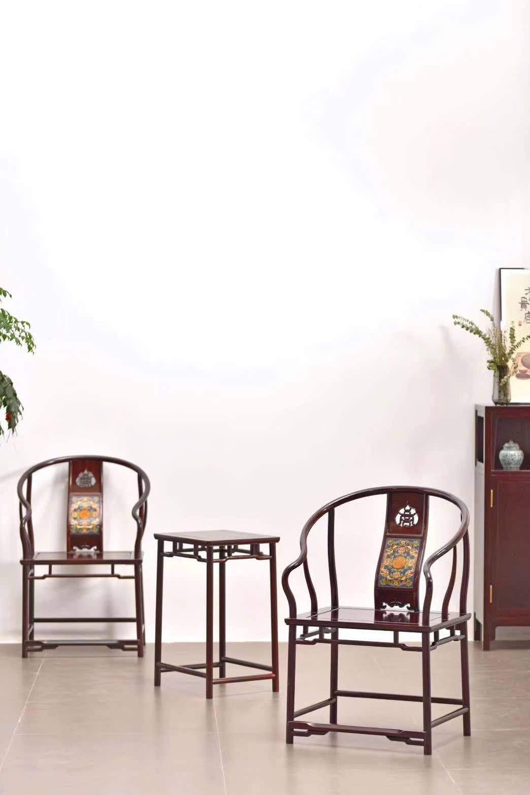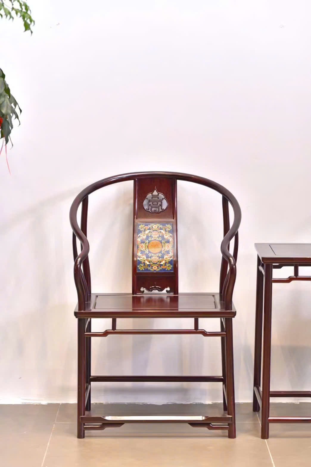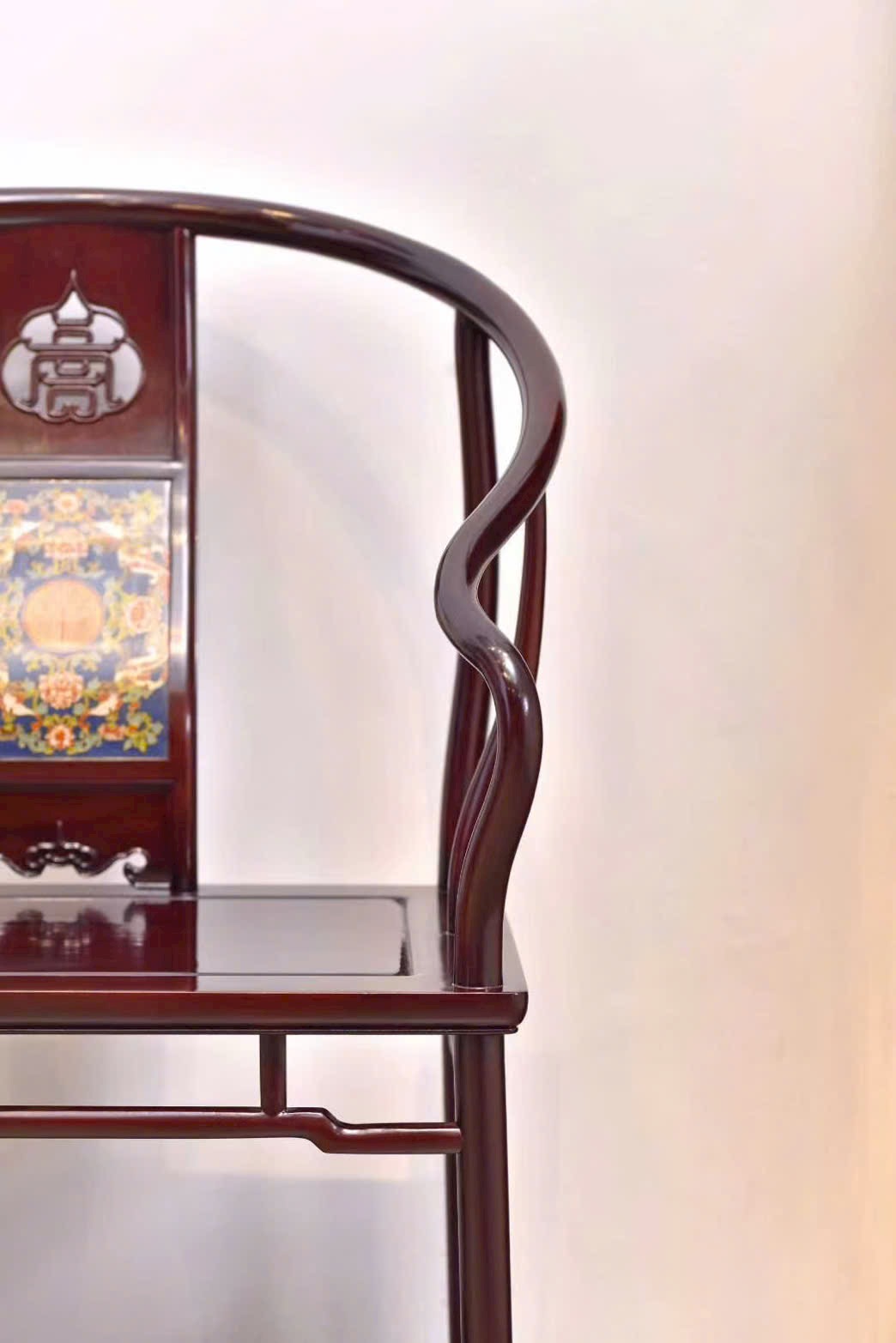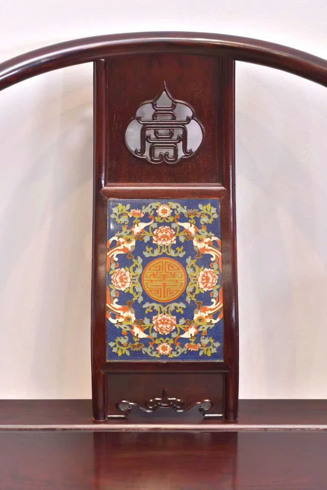Phần lưng ghế khảm Cảnh Thái Lam tinh xảo, sắc màu nổi bật trên nền gỗ tử đàn phi trầm ấm, tạo điểm nhấn đẳng cấp.
