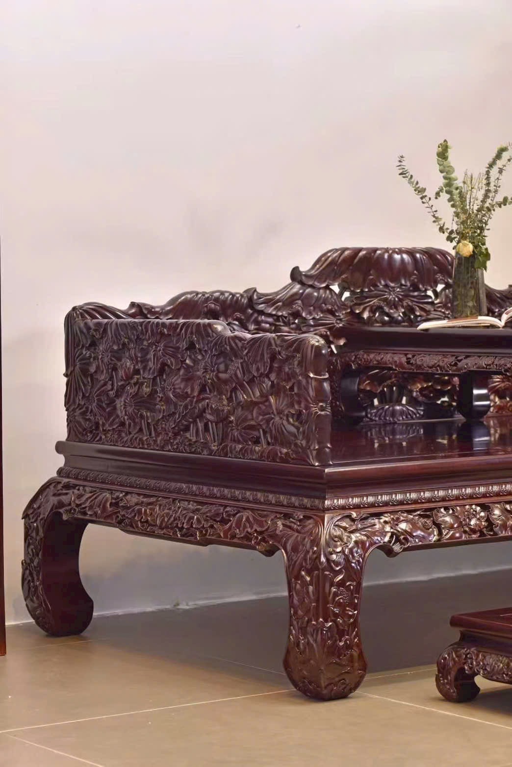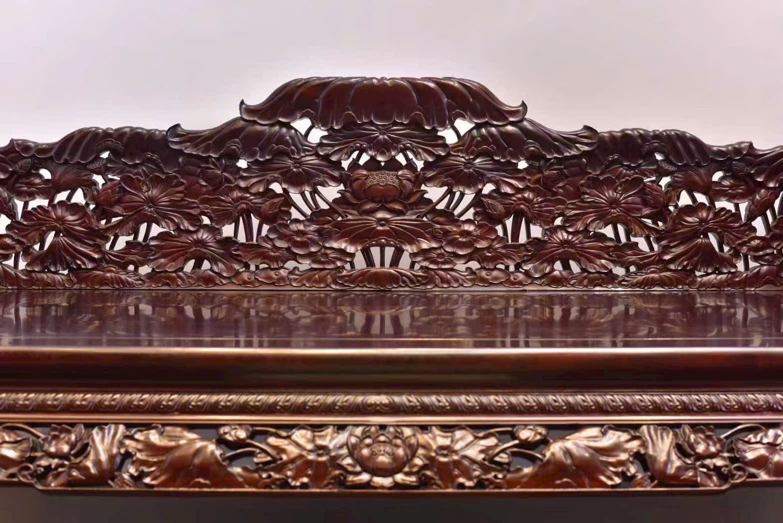 Toàn bộ chạm khắc kín họa tiết sen, bố cục sinh động, giàu chiều sâu thẩm mỹ.