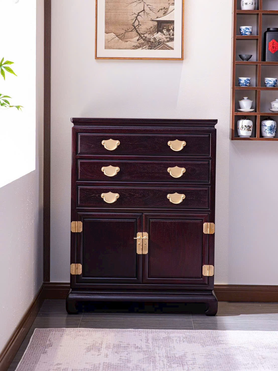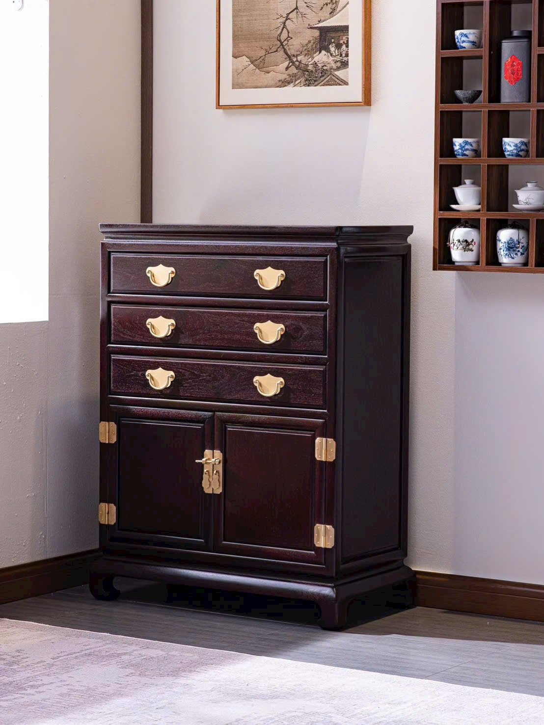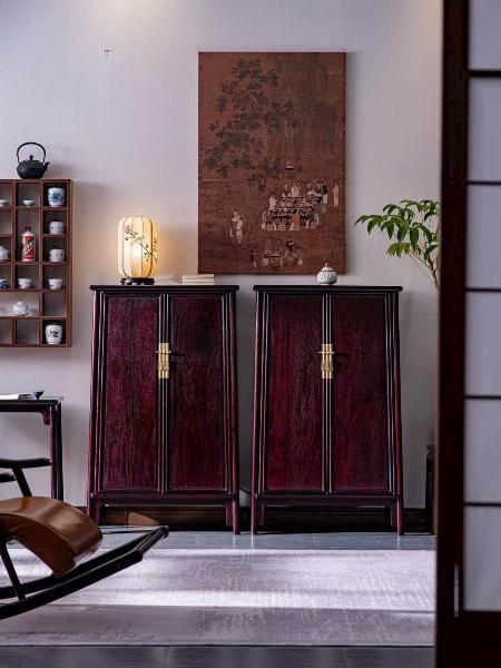 Chế tác từ tử đàn Zambia với sắc gỗ trầm ấm, vân gỗ tự nhiên rõ nét, kết cấu chắc chắn bền bỉ. Vừa đáp ứng nhu cầu lưu trữ, vừa tạo điểm nhấn thẩm mỹ mang phong vị Á Đông cho phòng khách, phòng ngủ hoặc không gian nội thất trang trọng.