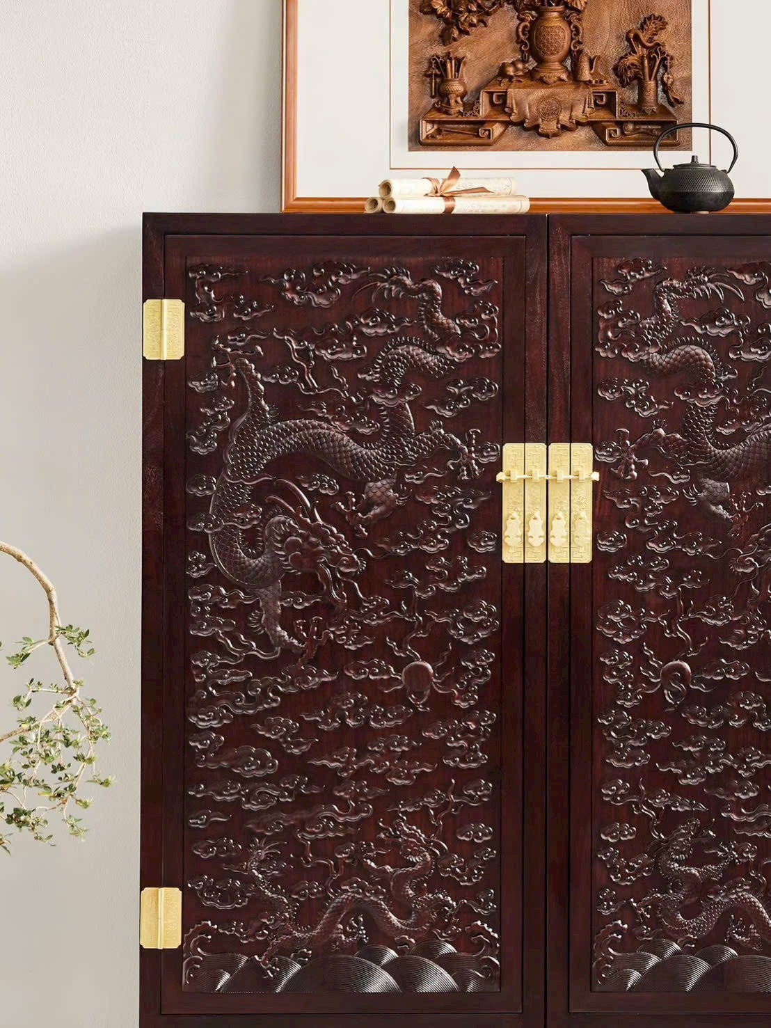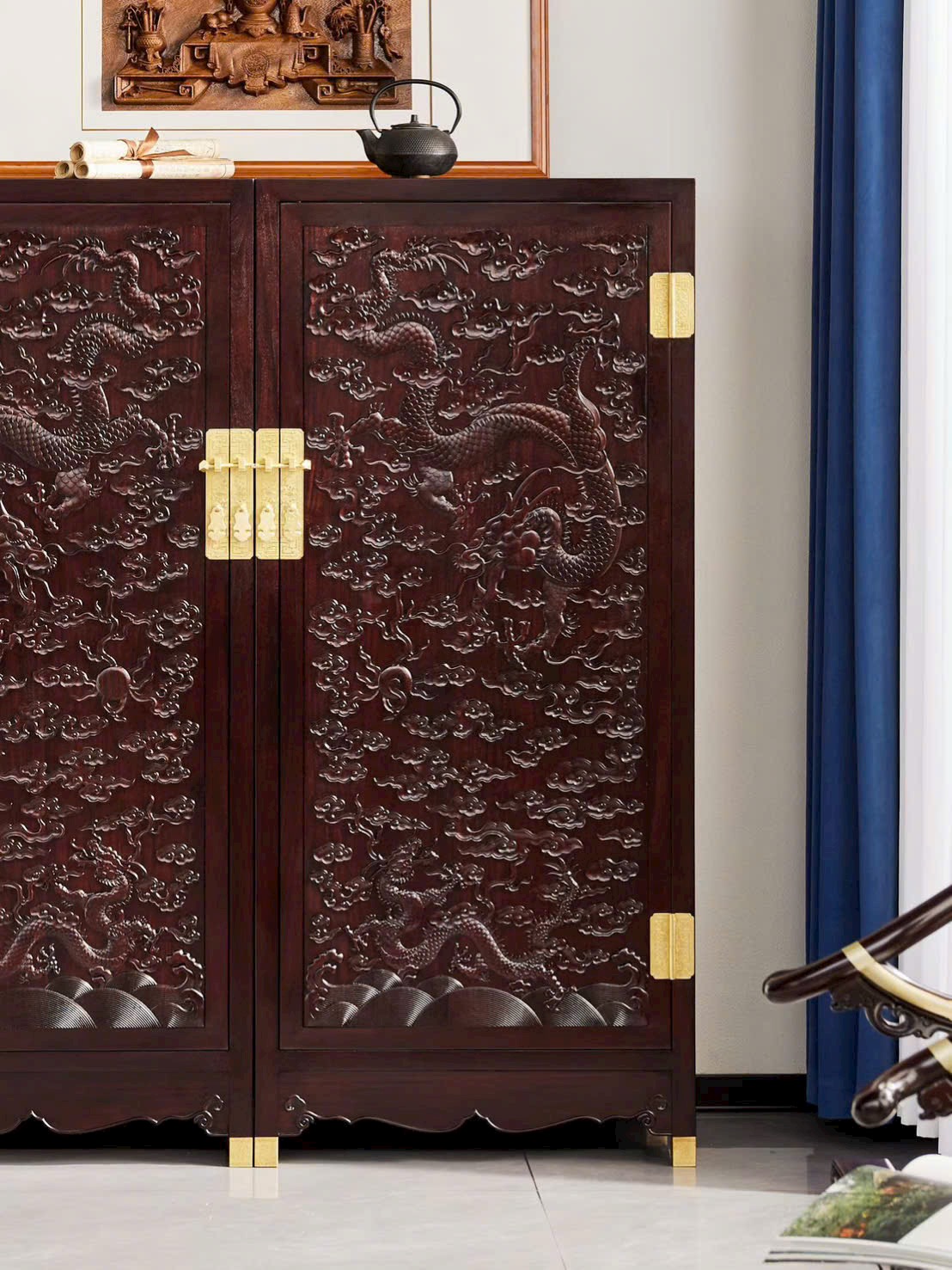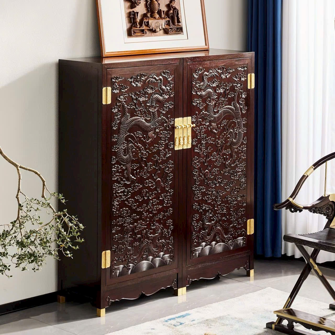 Thiết kế dáng tủ góc vuông cao thanh, đường nét cứng cáp, tỷ lệ cân đối trang nghiêm. Chủ đề chạm khắc “Thương Long Giáo Tử” mang ý nghĩa truyền thừa, dạy dỗ và kỳ vọng con cháu thành tài, tượng trưng gia phong hưng thịnh, thế hệ nối tiếp vẻ vang.