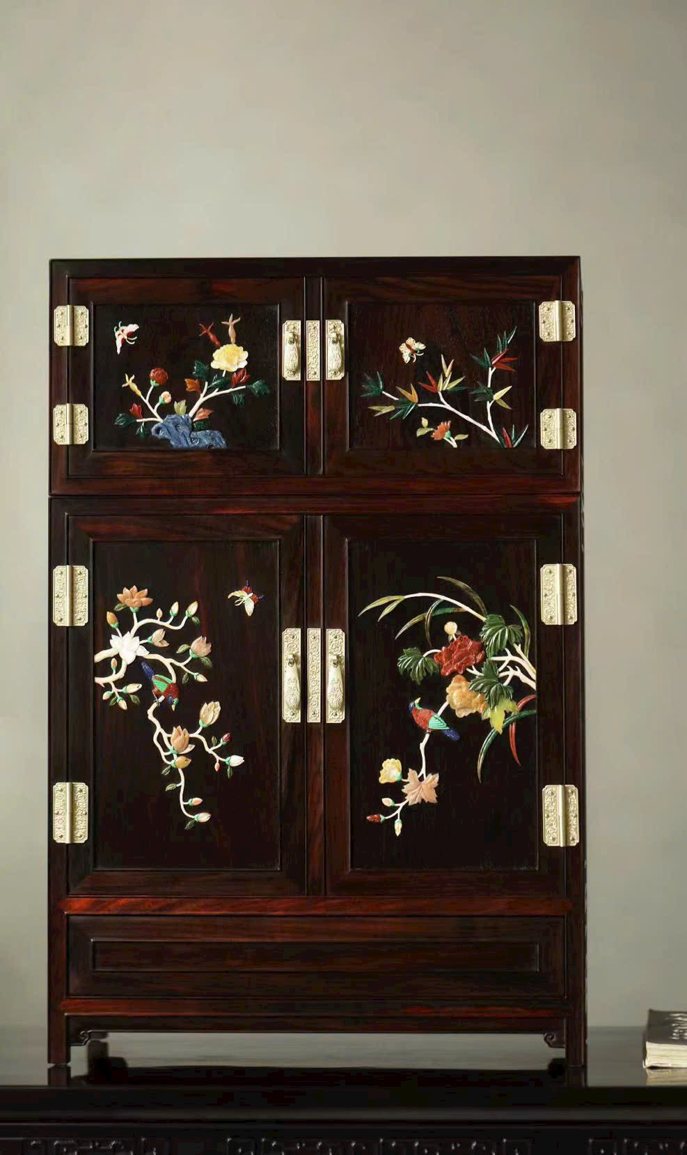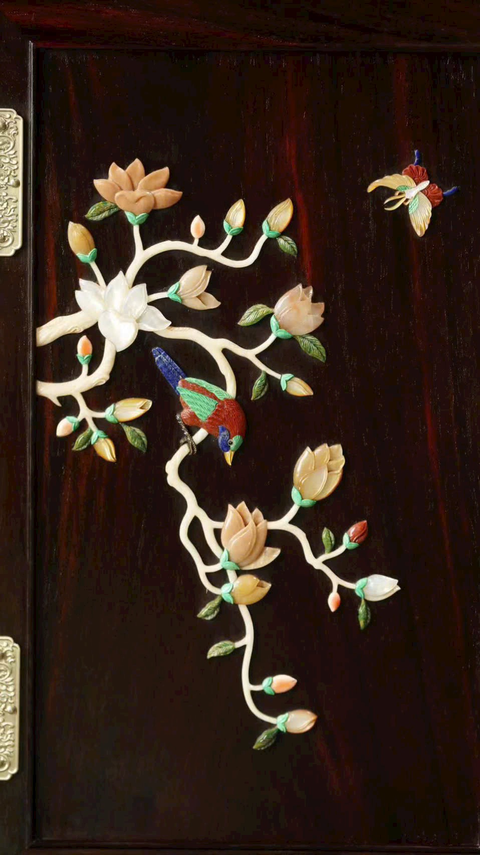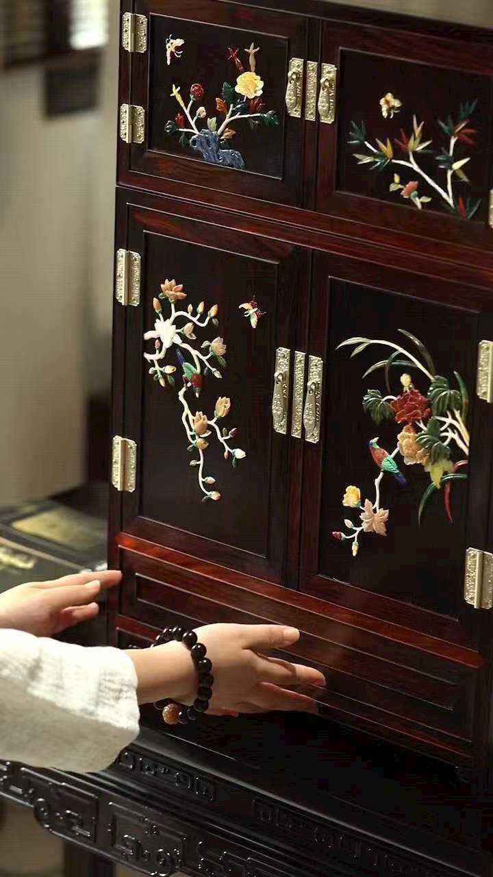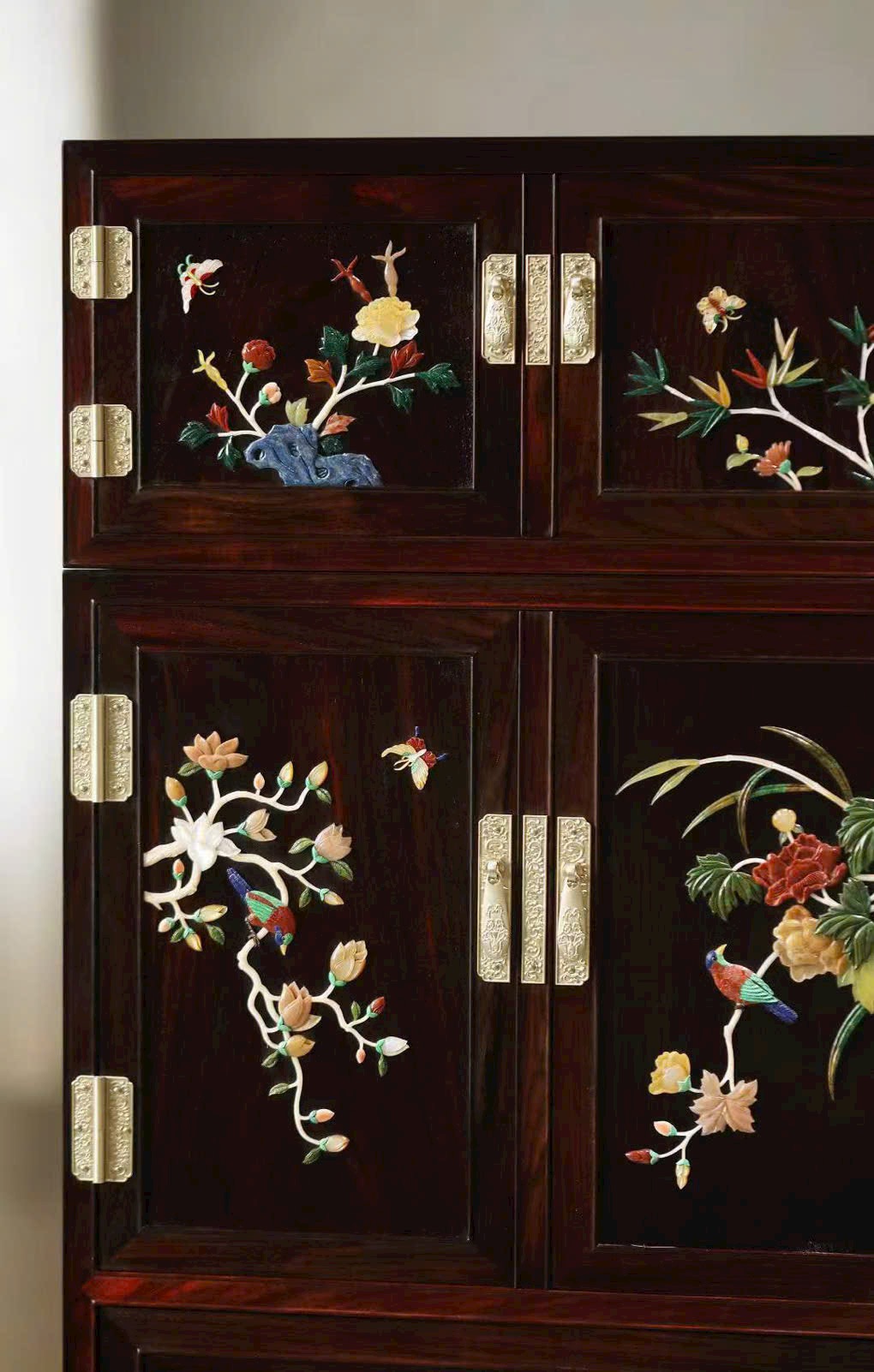Cánh tủ khảm ngọc họa tiết Mai – Lan – Trúc – Cúc, sắc màu phong phú, hài hòa, toát lên phong vị tao nhã.