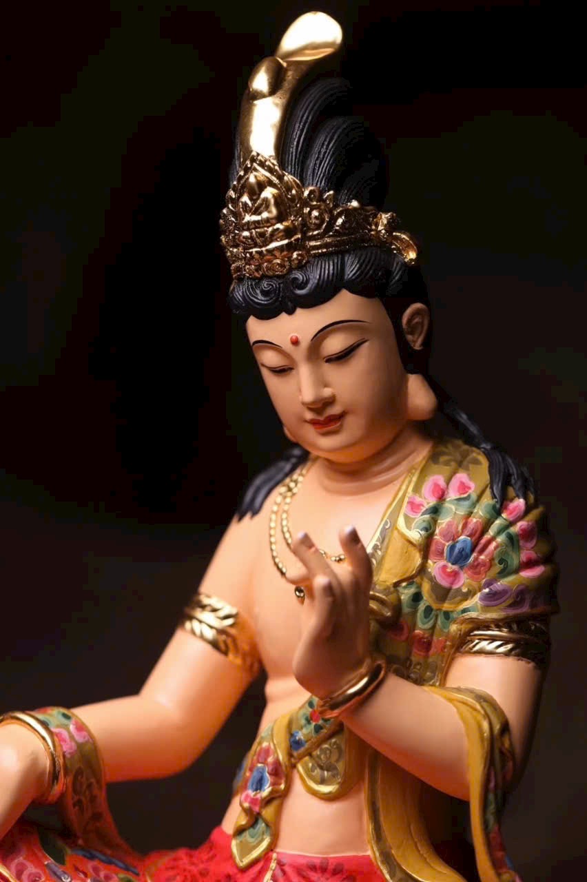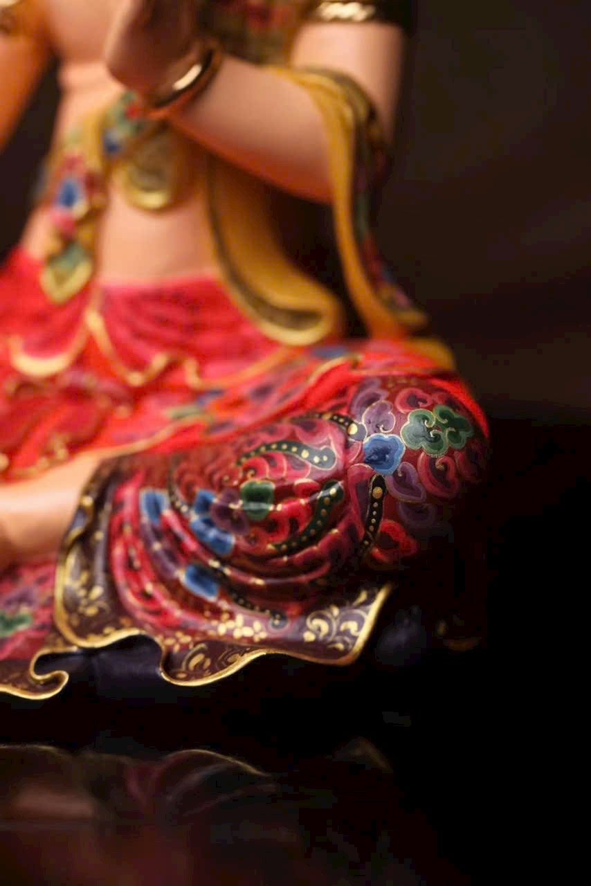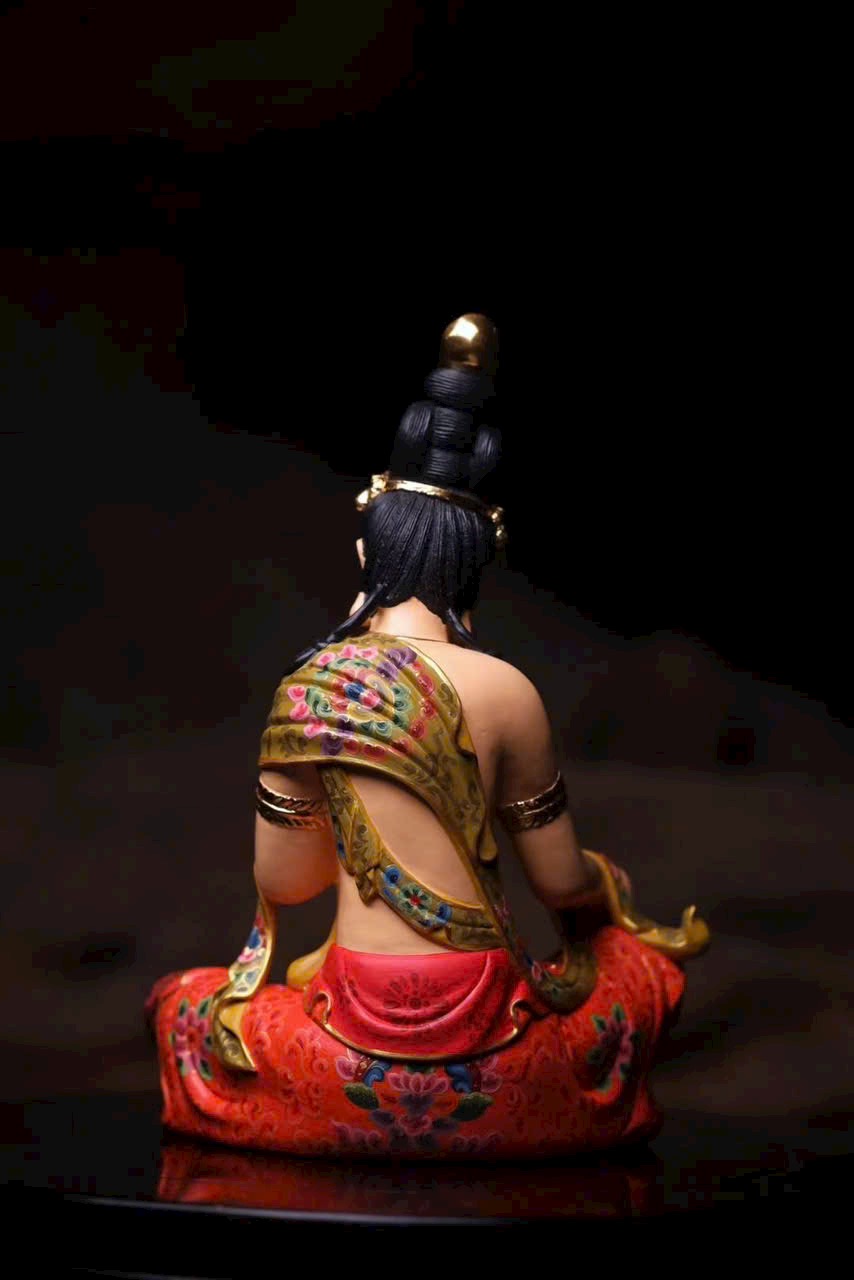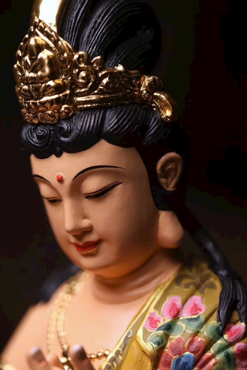 Tự Tại Quan Âm y phục lộng lẫy, thần thái an nhiên. Ngồi ngay ngắn tự tại, tà áo vương hoa, kim hoàn lấp lánh ánh mềm. Ánh mắt dịu dàng ẩn chứa từ bi, tay kết ấn nhẹ nhàng, lan tỏa sự an lành và hộ trì trong tĩnh lặng.