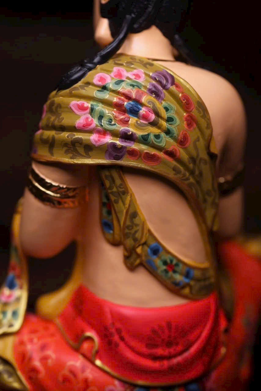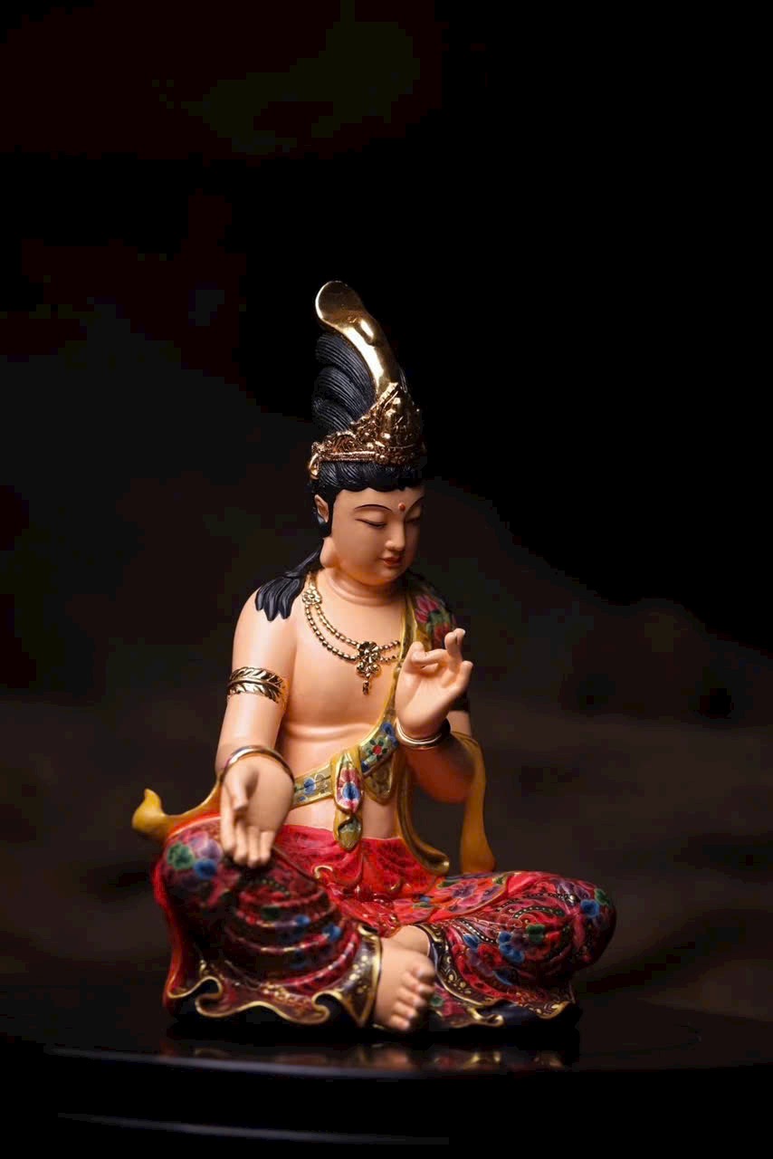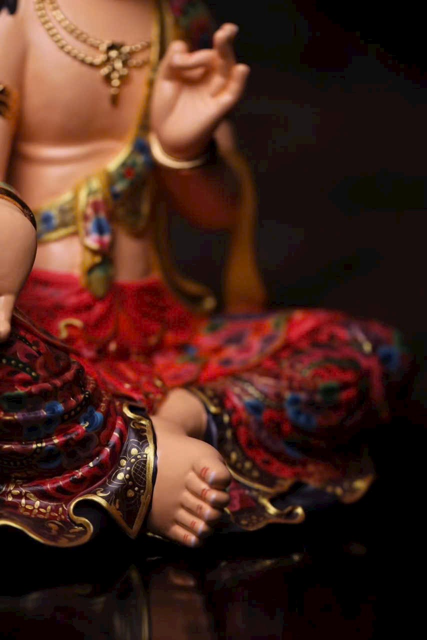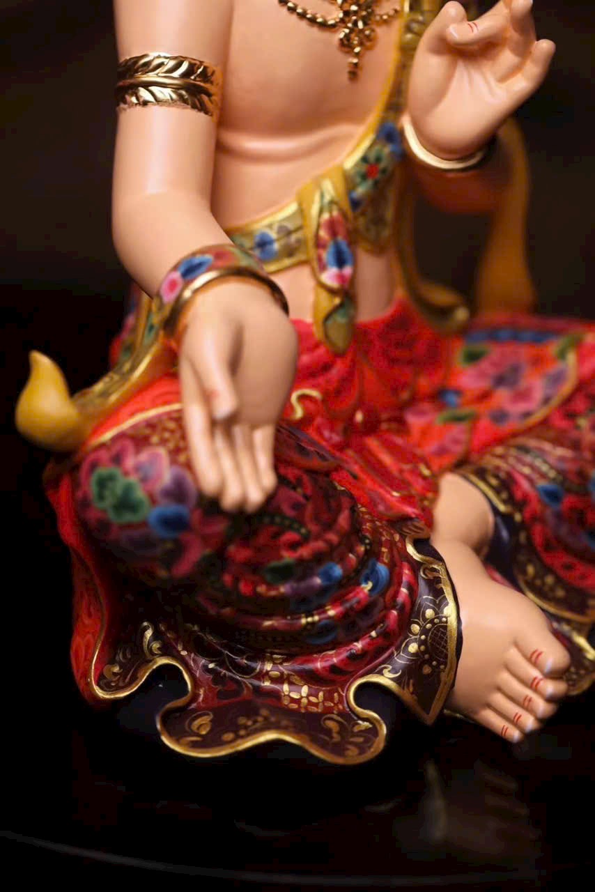 Tự Tại Quan Âm y phục lộng lẫy, thần thái an nhiên. Ngồi ngay ngắn tự tại, tà áo vương hoa, kim hoàn lấp lánh ánh mềm. Ánh mắt dịu dàng ẩn chứa từ bi, tay kết ấn nhẹ nhàng, lan tỏa sự an lành và hộ trì trong tĩnh lặng.