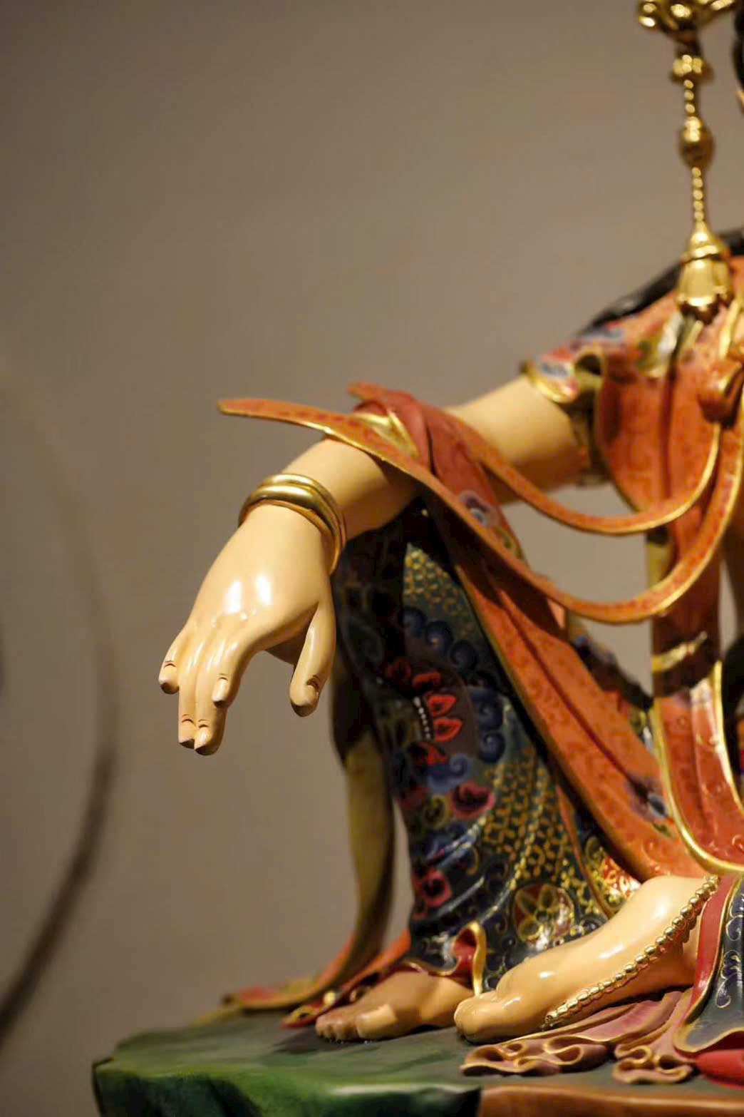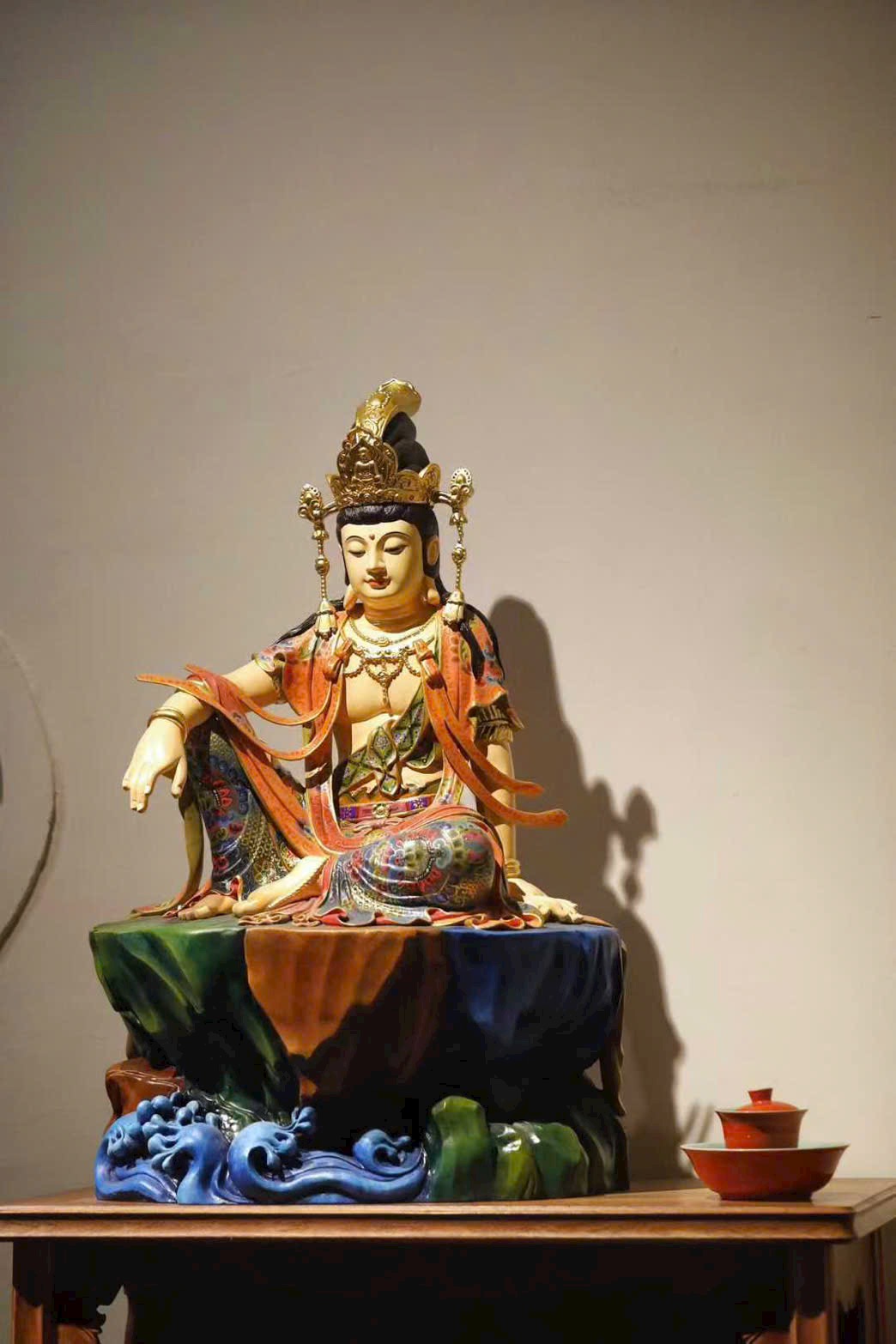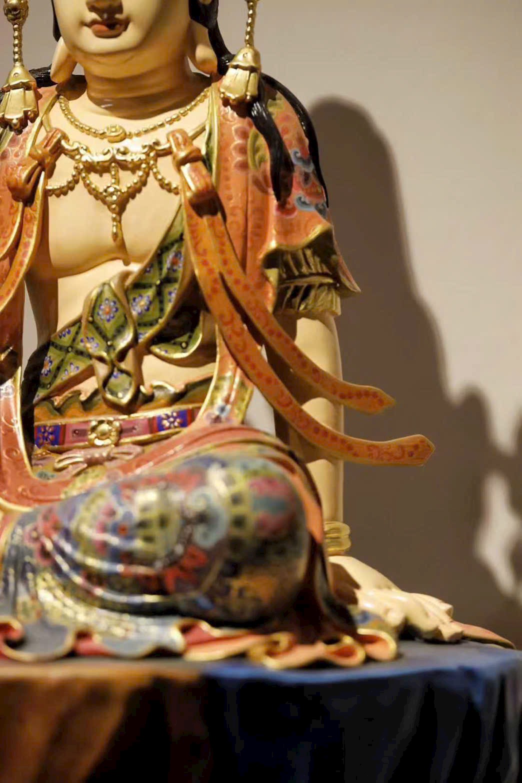 Đường chạm khắc gọn gàng tinh luyện, chất gỗ ấm mịn, nét đục mềm mại tròn đầy. Tượng Quan Âm dáng vẻ trang nghiêm mà hiền hòa, an nhiên ngồi tĩnh tại, đôi mắt khép nhẹ chứa chan từ bi. Thần thái thanh nhã, không khí tĩnh lặng an yên, hình thần từ hòa cát tường, toát lên thiền tâm thanh tịnh và tấm lòng phổ độ.