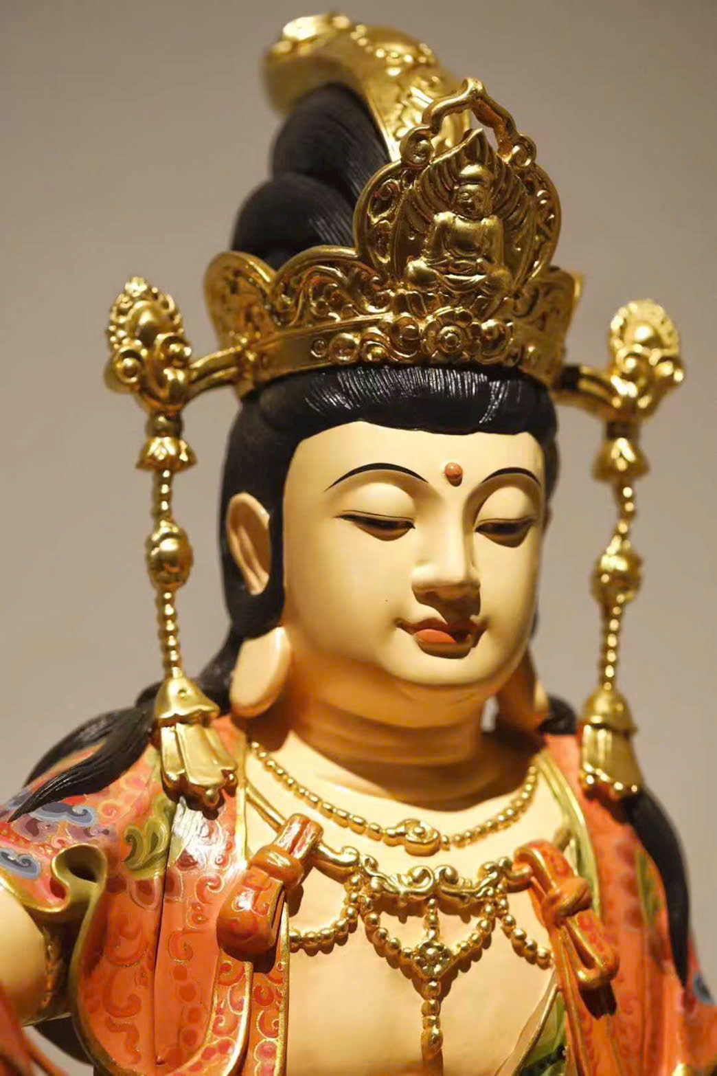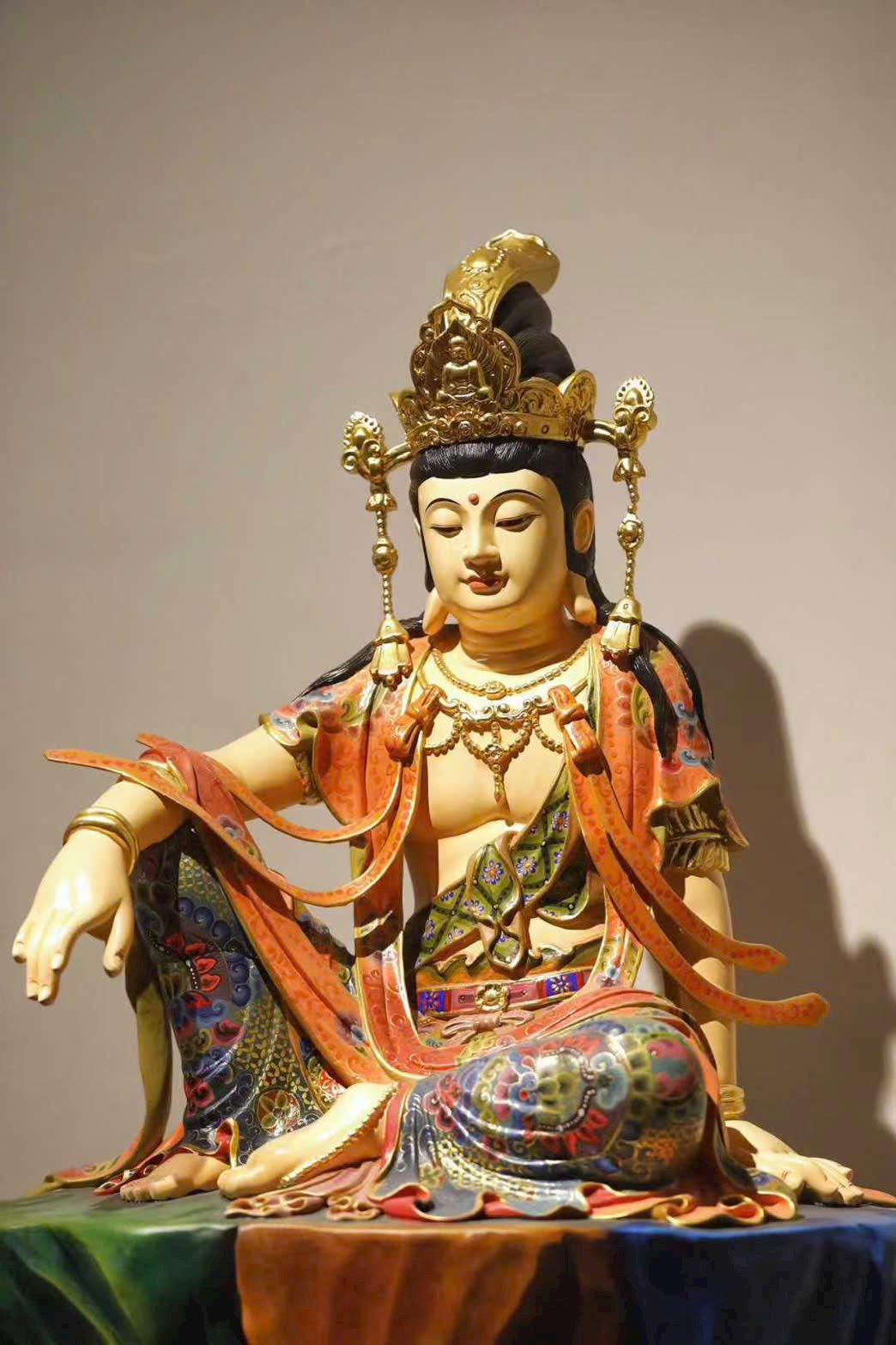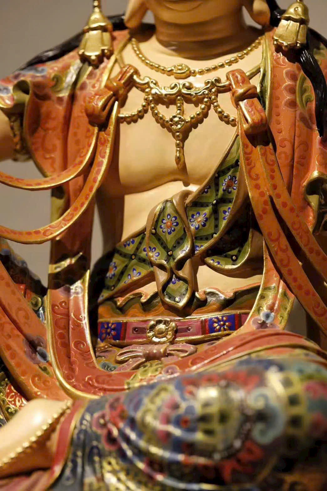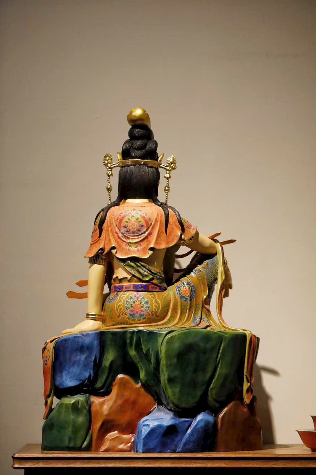 Đường chạm khắc gọn gàng tinh luyện, chất gỗ ấm mịn, nét đục mềm mại tròn đầy. Tượng Quan Âm dáng vẻ trang nghiêm mà hiền hòa, an nhiên ngồi tĩnh tại, đôi mắt khép nhẹ chứa chan từ bi. Thần thái thanh nhã, không khí tĩnh lặng an yên, hình thần từ hòa cát tường, toát lên thiền tâm thanh tịnh và tấm lòng phổ độ.