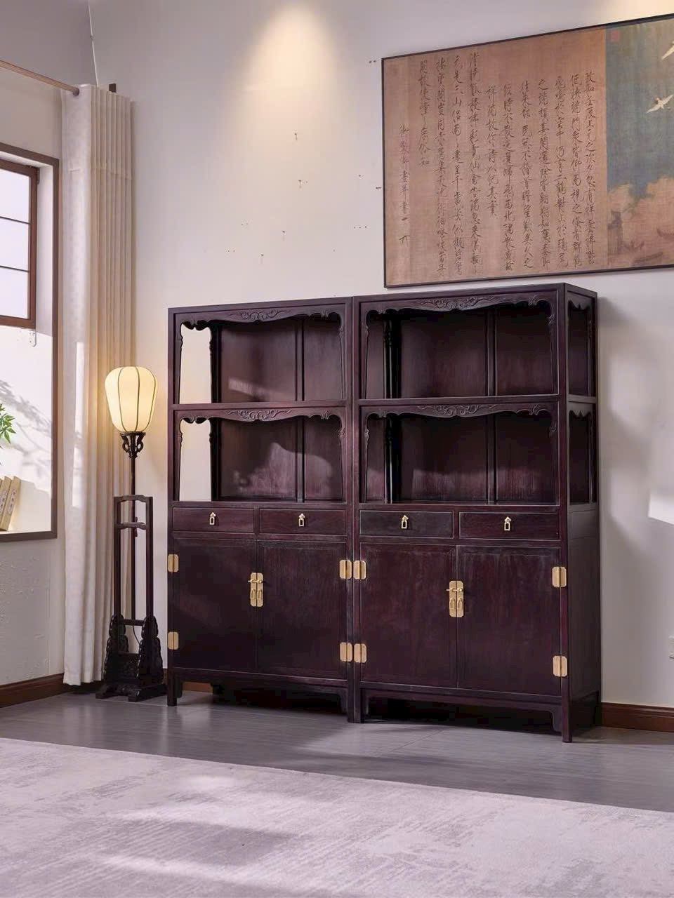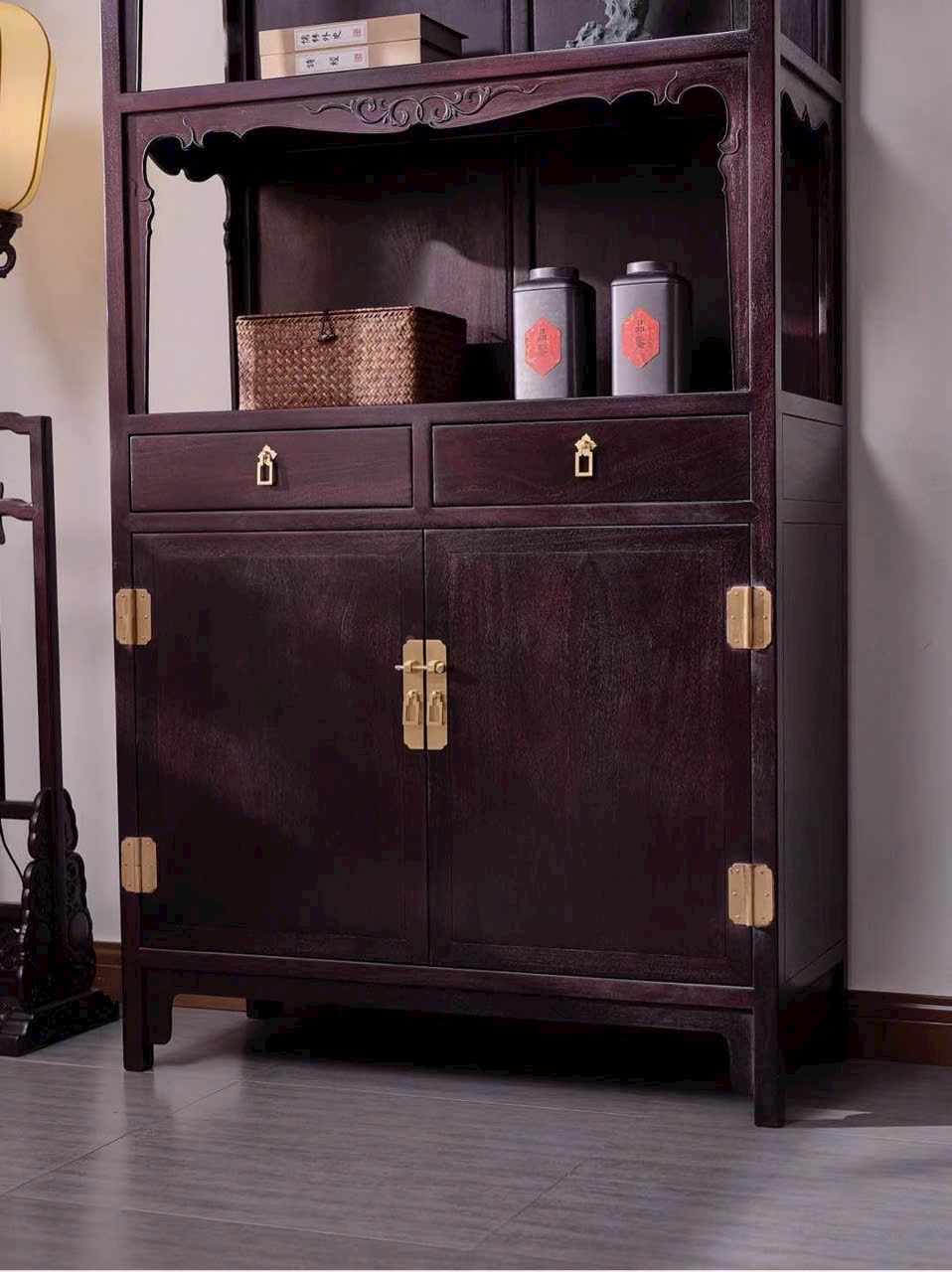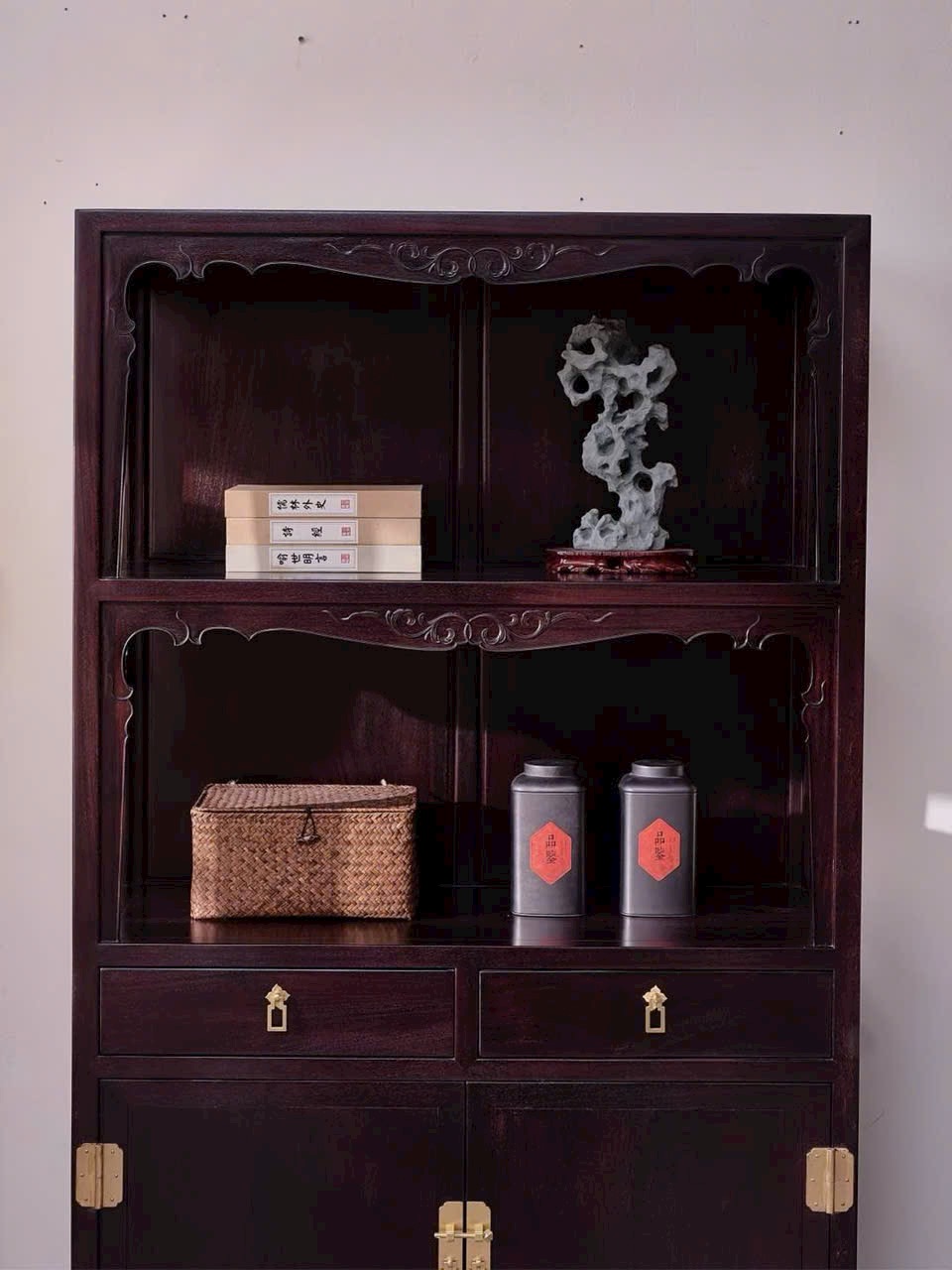 Tủ thiết kế hai tầng, bố cục cân đối, các ô trưng bày sáng thoáng, tiện cho việc đặt đồ sưu tầm, ấm trà hoặc vật phẩm nghệ thuật. Đường nét thanh thoát, góc cạnh tinh tế. Chất gỗ tử đàn Zambia đỏ sẫm sang trọng, vân mịn tự nhiên, vừa mang giá trị thực dụng, vừa thể hiện phong vị cổ điển tao nhã.