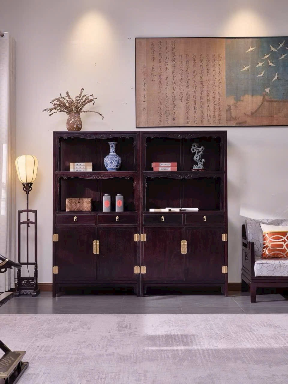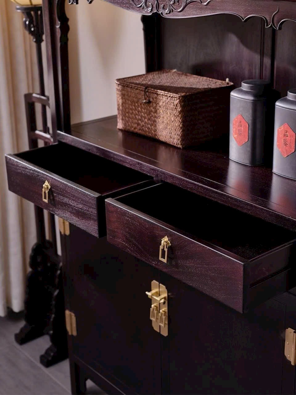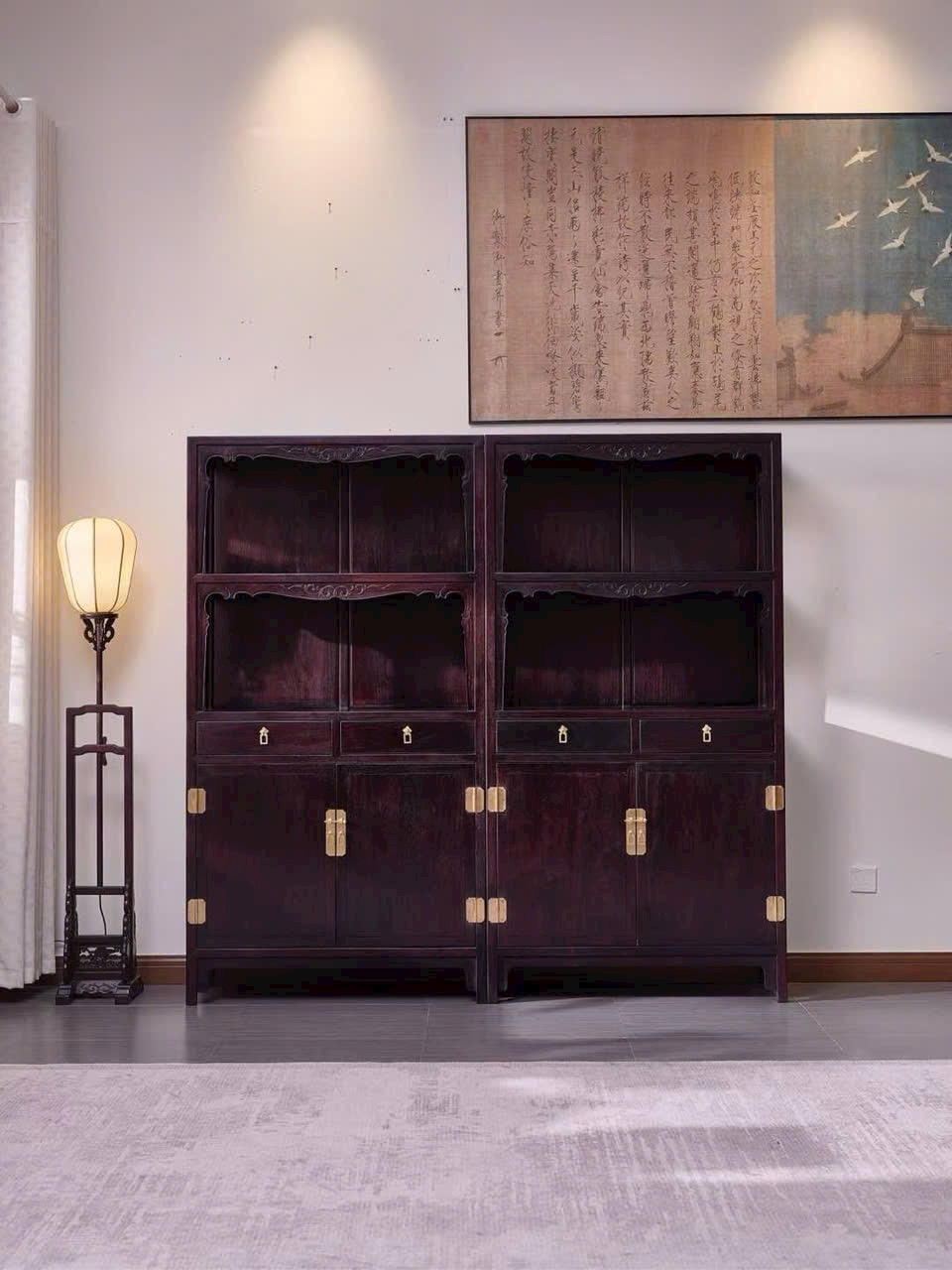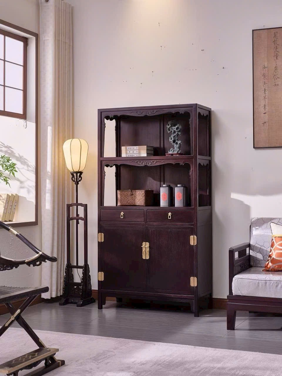 Tủ thiết kế hai tầng, bố cục cân đối, các ô trưng bày sáng thoáng, tiện cho việc đặt đồ sưu tầm, ấm trà hoặc vật phẩm nghệ thuật. Đường nét thanh thoát, góc cạnh tinh tế. Chất gỗ tử đàn Zambia đỏ sẫm sang trọng, vân mịn tự nhiên, vừa mang giá trị thực dụng, vừa thể hiện phong vị cổ điển tao nhã.