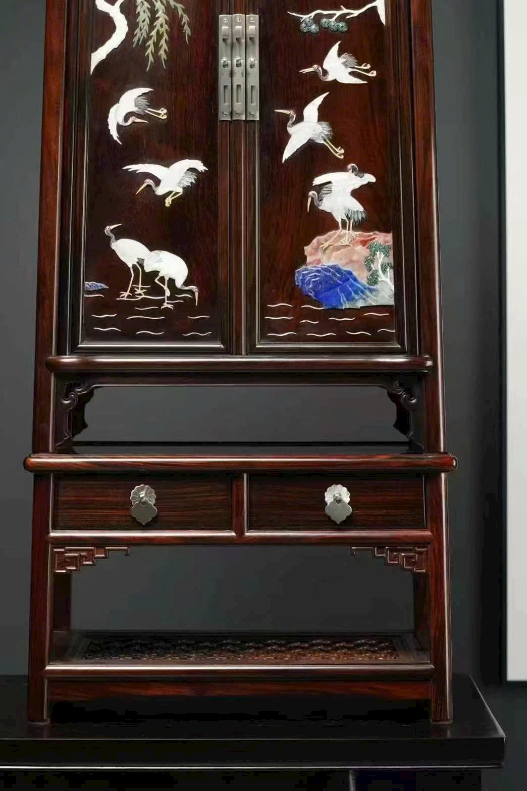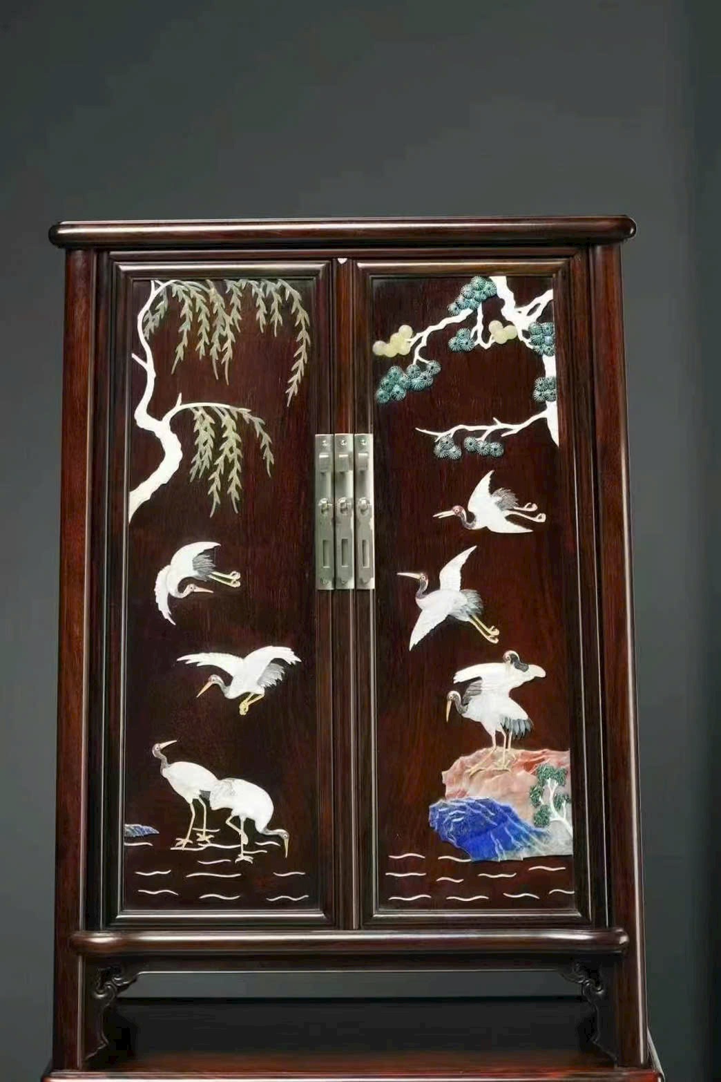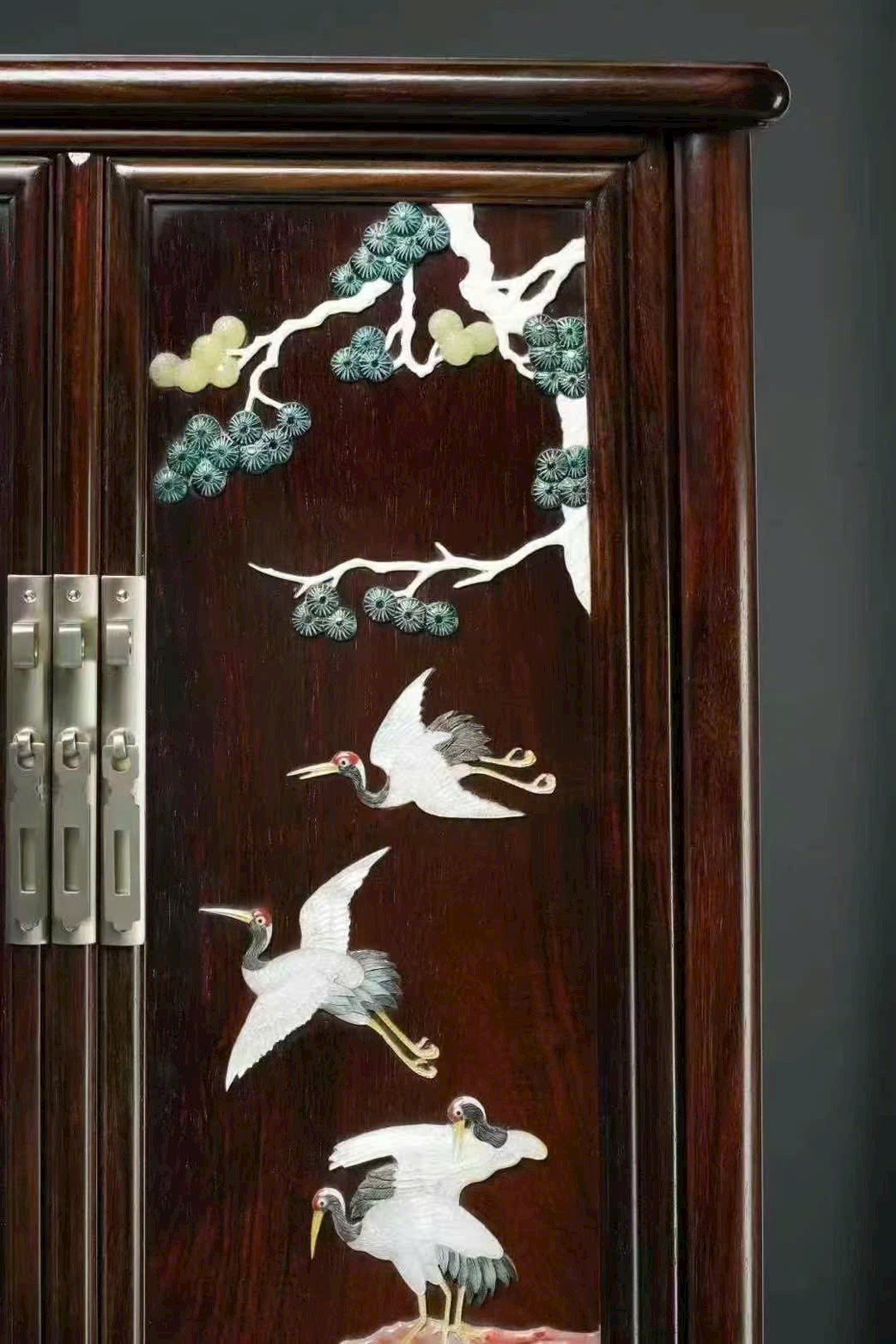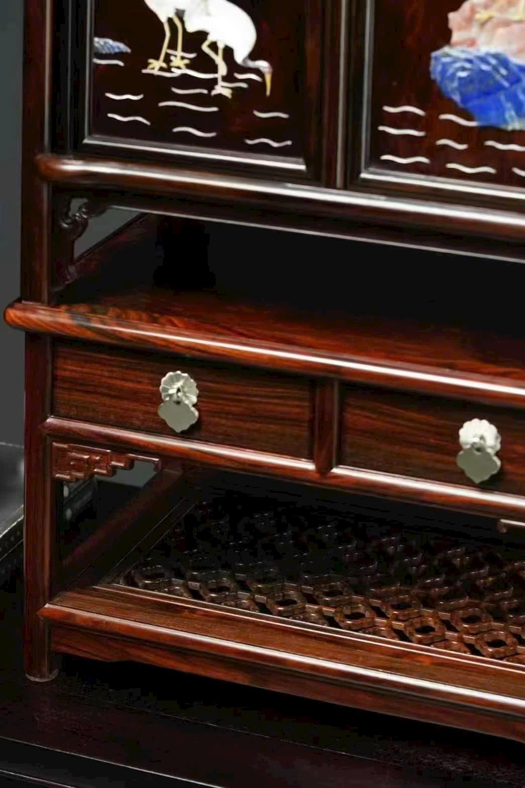 Chọn dùng gỗ lão liệu gỗ trắc ổn định, toàn bộ dùng ván nguyên tấm để chế tác. Hình dáng thẳng gọn, bề mặt tủ khảm bách bảo với họa tiết tùng hạc diên niên, tinh xảo rực rỡ, thanh quý mà không phô trương. Tổng thể đường nét trang nhã, trang trí giản lược. Thích hợp làm vật cất giữ trong thư phòng, hay bài trí trong trà thất, đều mang phong vị tao nhã.