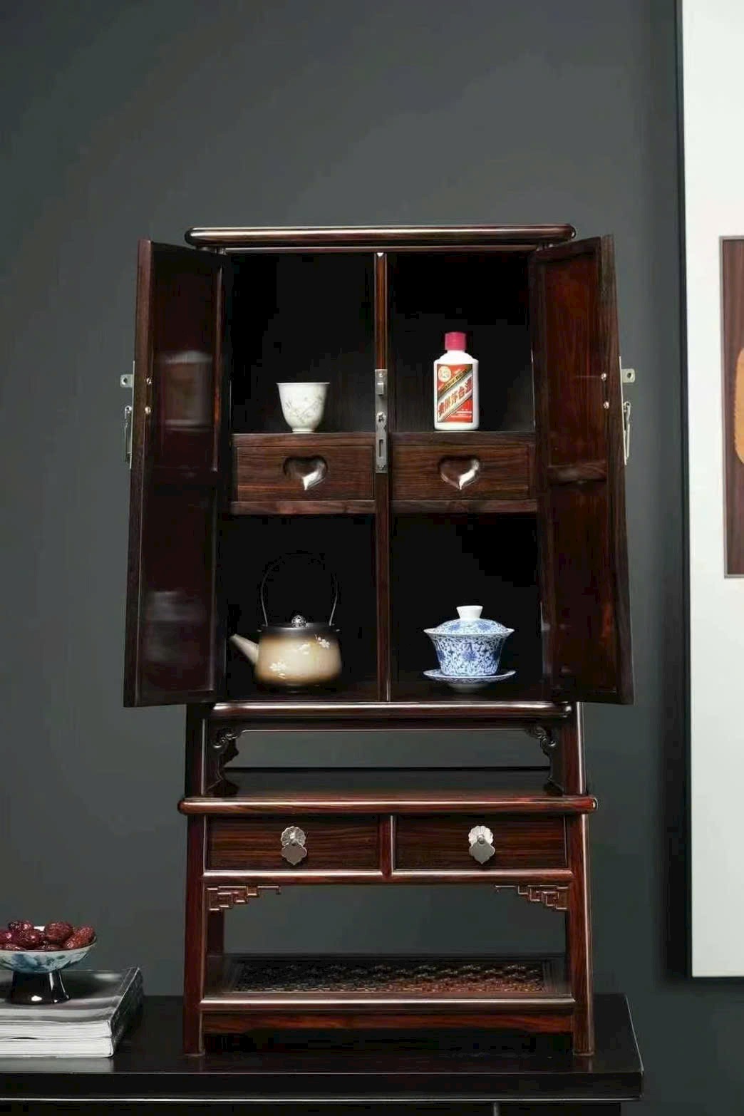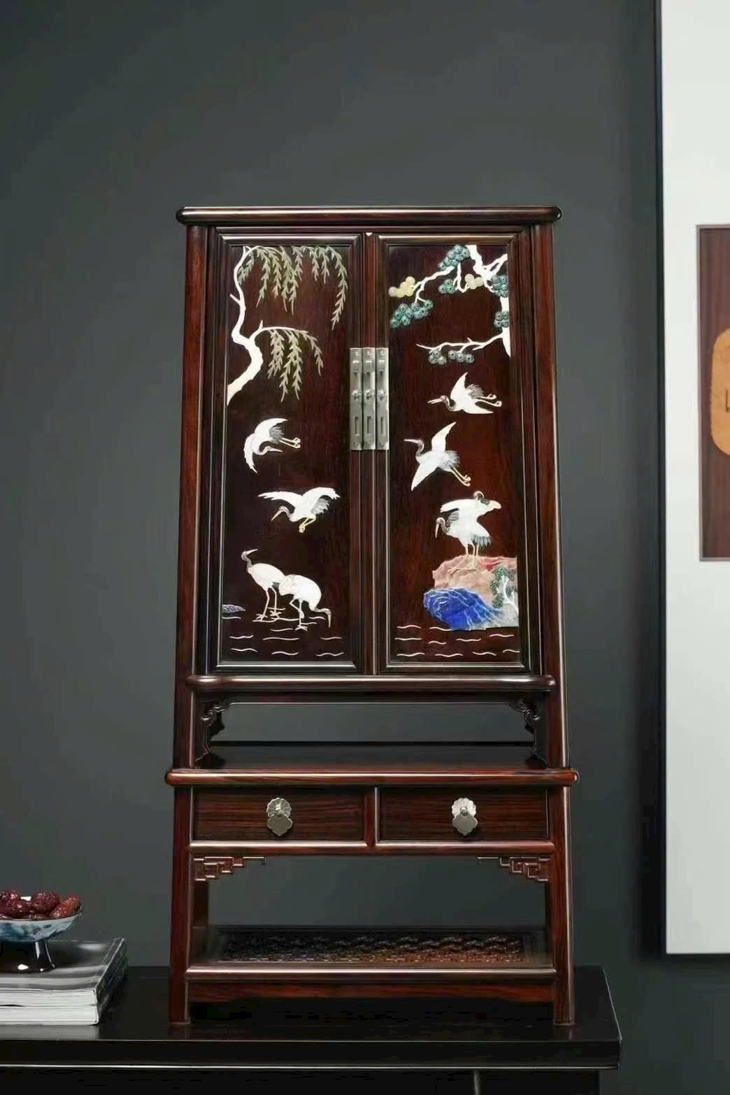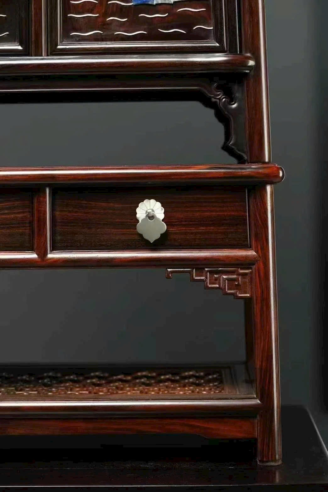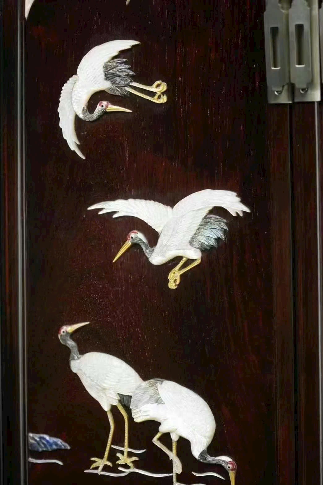 Chọn dùng gỗ lão liệu gỗ trắc ổn định, toàn bộ dùng ván nguyên tấm để chế tác. Hình dáng thẳng gọn, bề mặt tủ khảm bách bảo với họa tiết tùng hạc diên niên, tinh xảo rực rỡ, thanh quý mà không phô trương. Tổng thể đường nét trang nhã, trang trí giản lược. Thích hợp làm vật cất giữ trong thư phòng, hay bài trí trong trà thất, đều mang phong vị tao nhã.