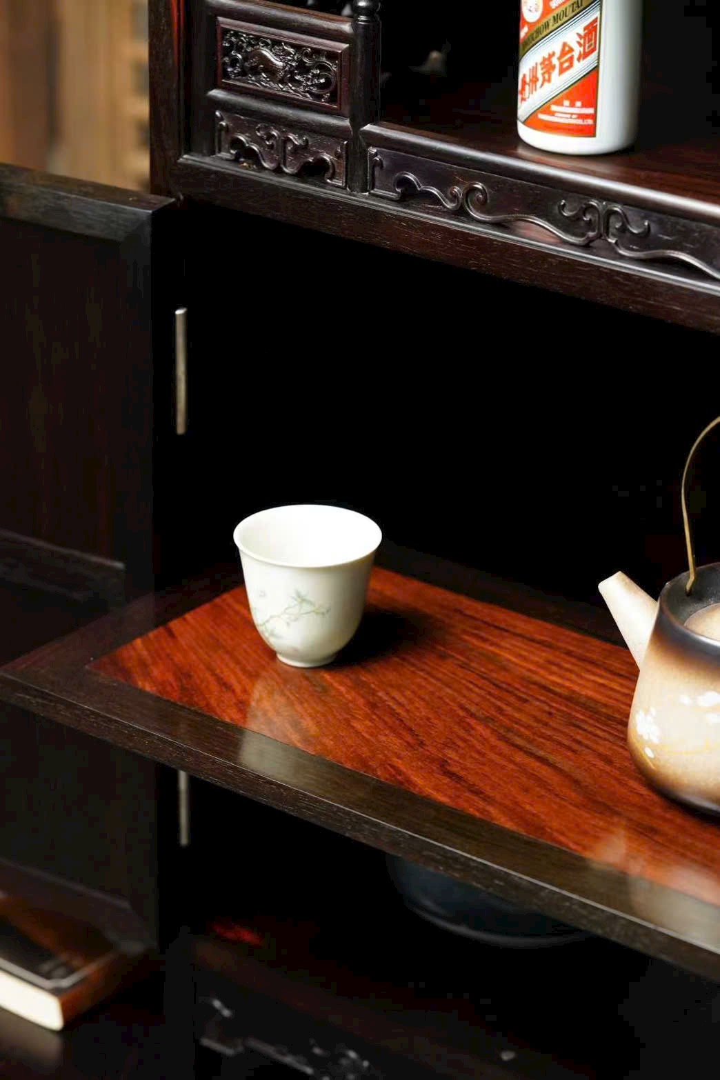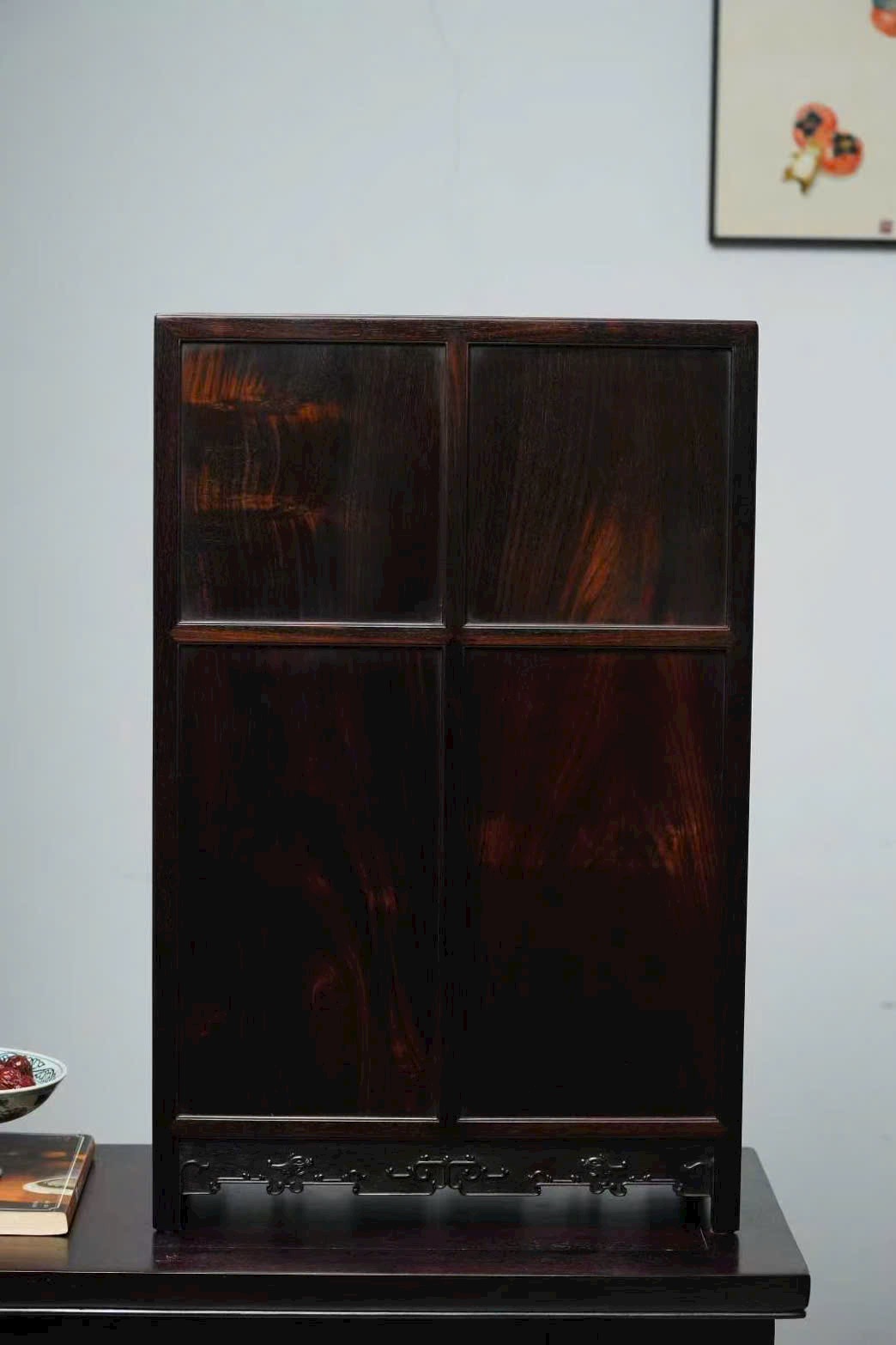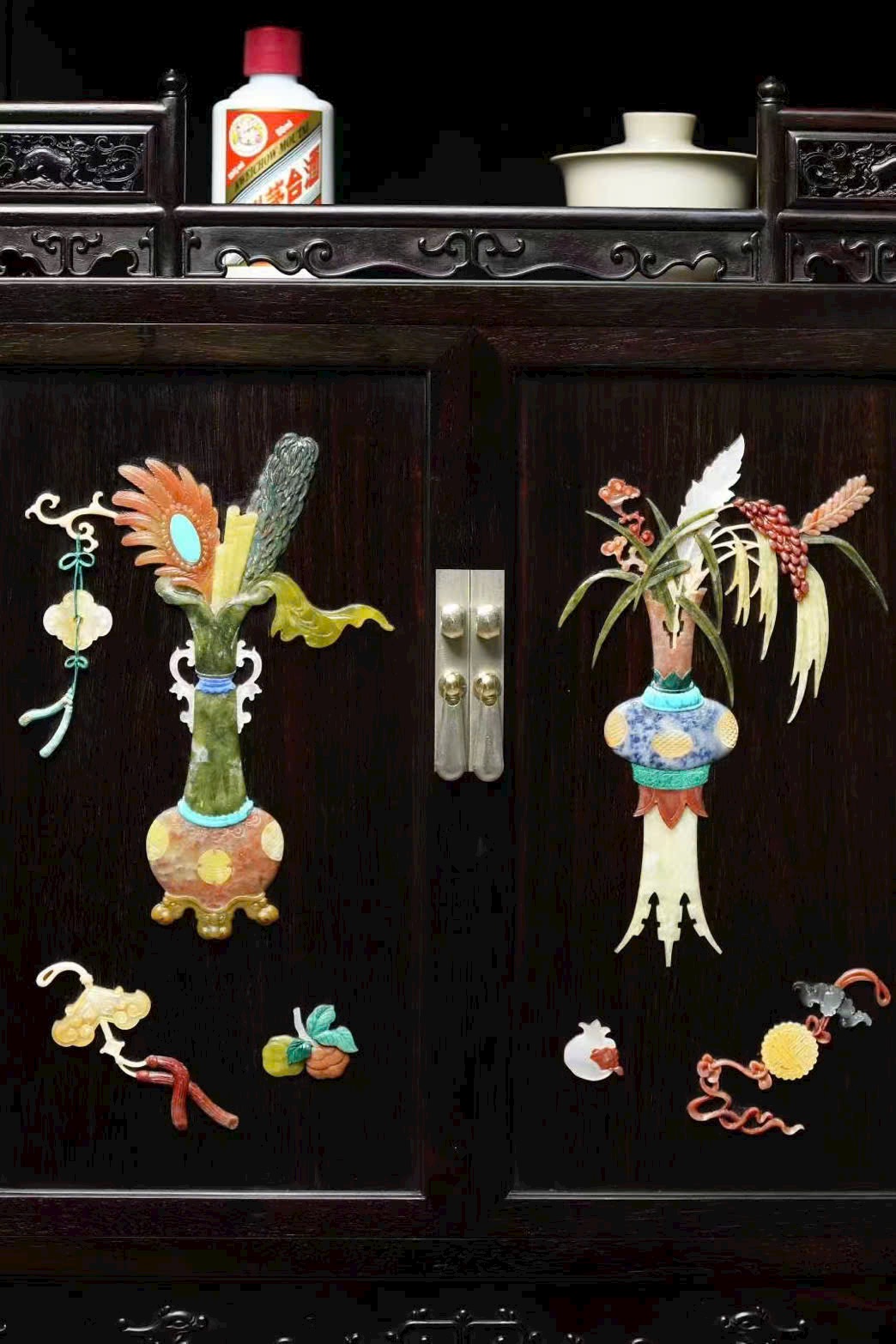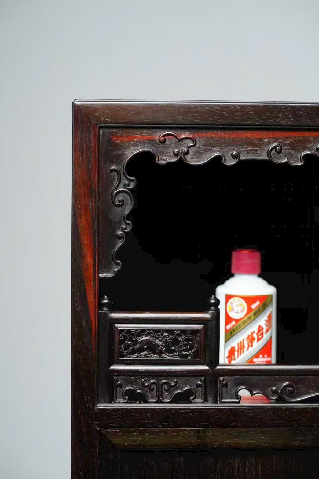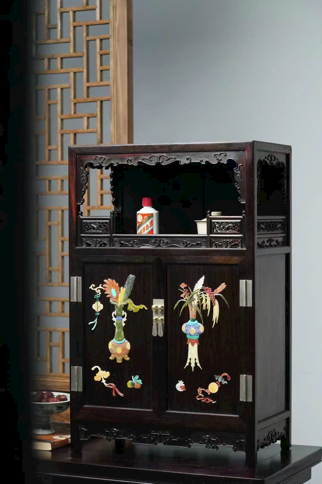 Tác phẩm được chế tác tinh xảo hoàn toàn từ gỗ đại hồng toan chi nguyên khối, vân gỗ dày mịn, sắc trầm sang trọng. Kết cấu bách bảo cách cổ điển, thể hiện tinh thần lưu giữ báu vật và tinh hoa nghệ thuật thời Minh Vạn Lịch. Các ngăn tủ có thể tháo rời, tiện cho sắp đặt và bảo quản.