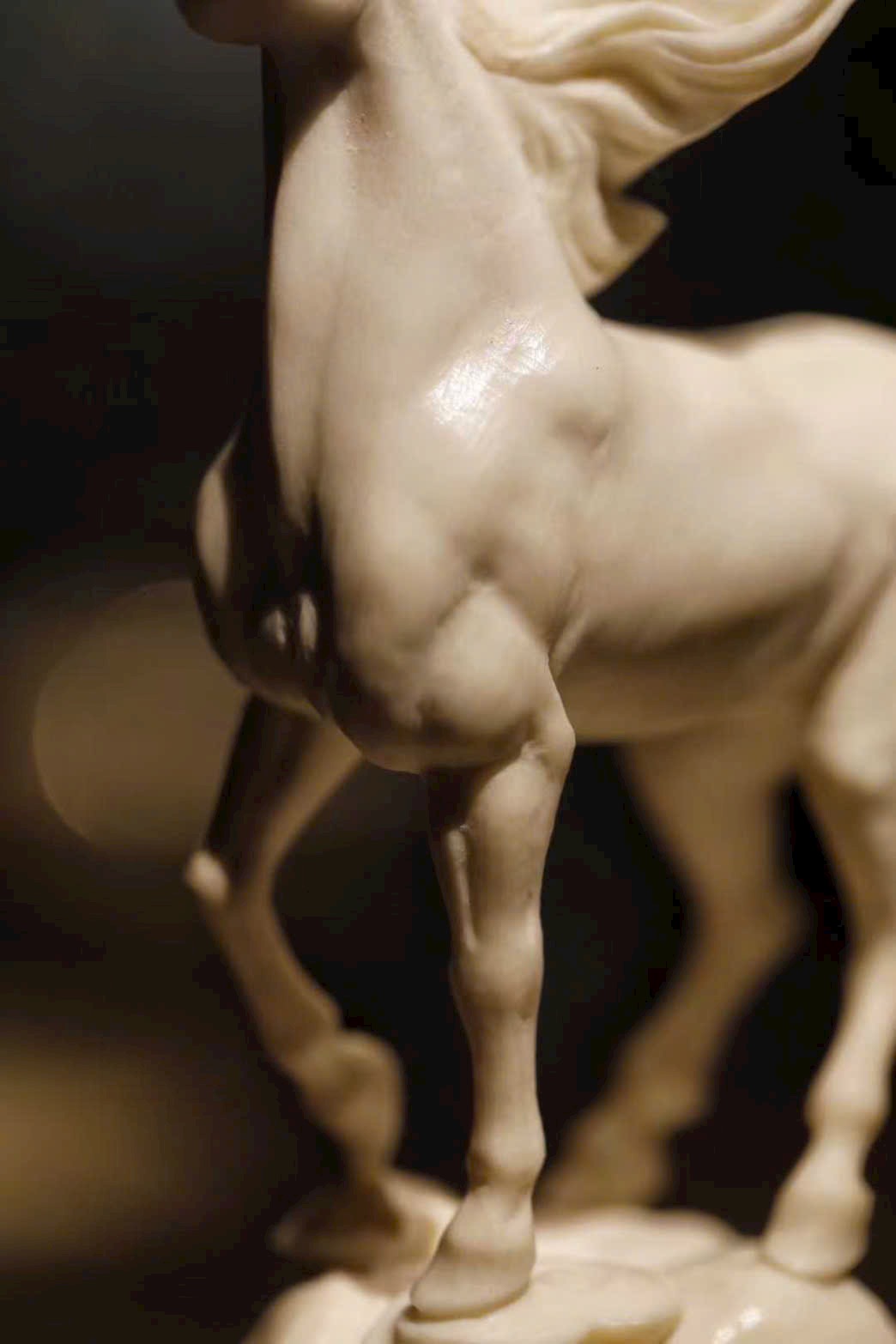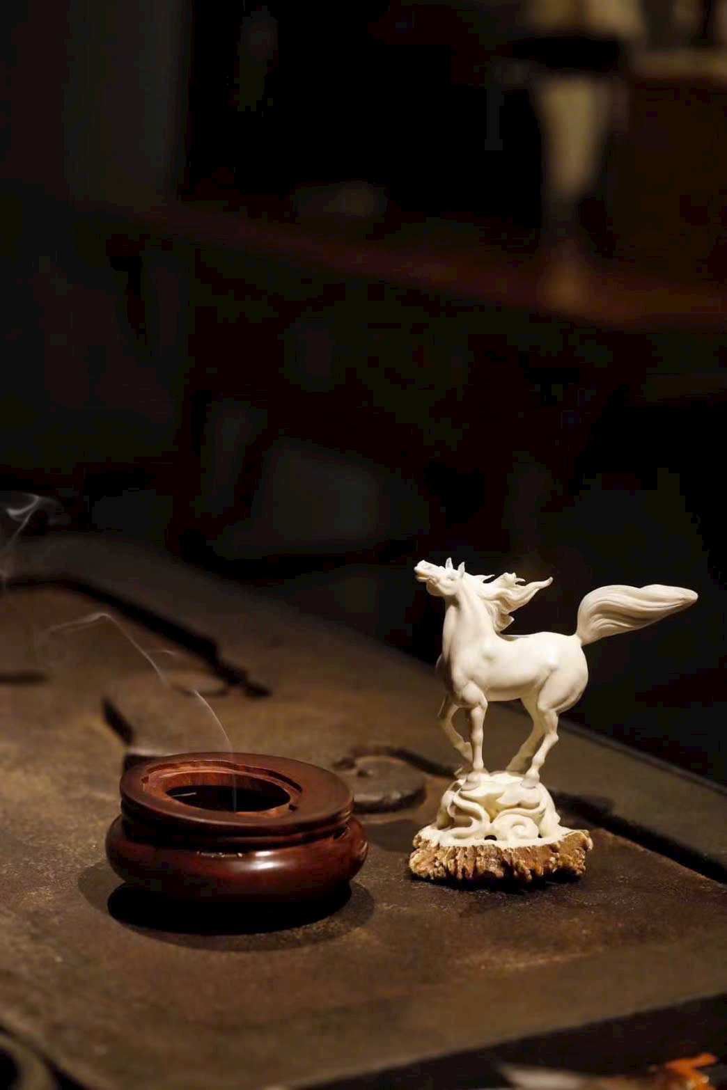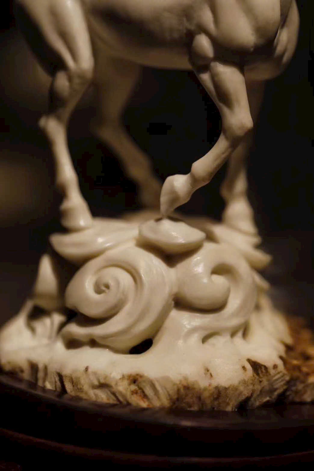Lư hương chạm khắc hình tượng tuấn mã bằng sừng hươu, dáng ngẩng đầu, tung bờm đầy khí thế như đang cưỡi gió băng mây. Kết hợp với đế gỗ, tổng thể vừa mạnh mẽ vừa thanh nhã.