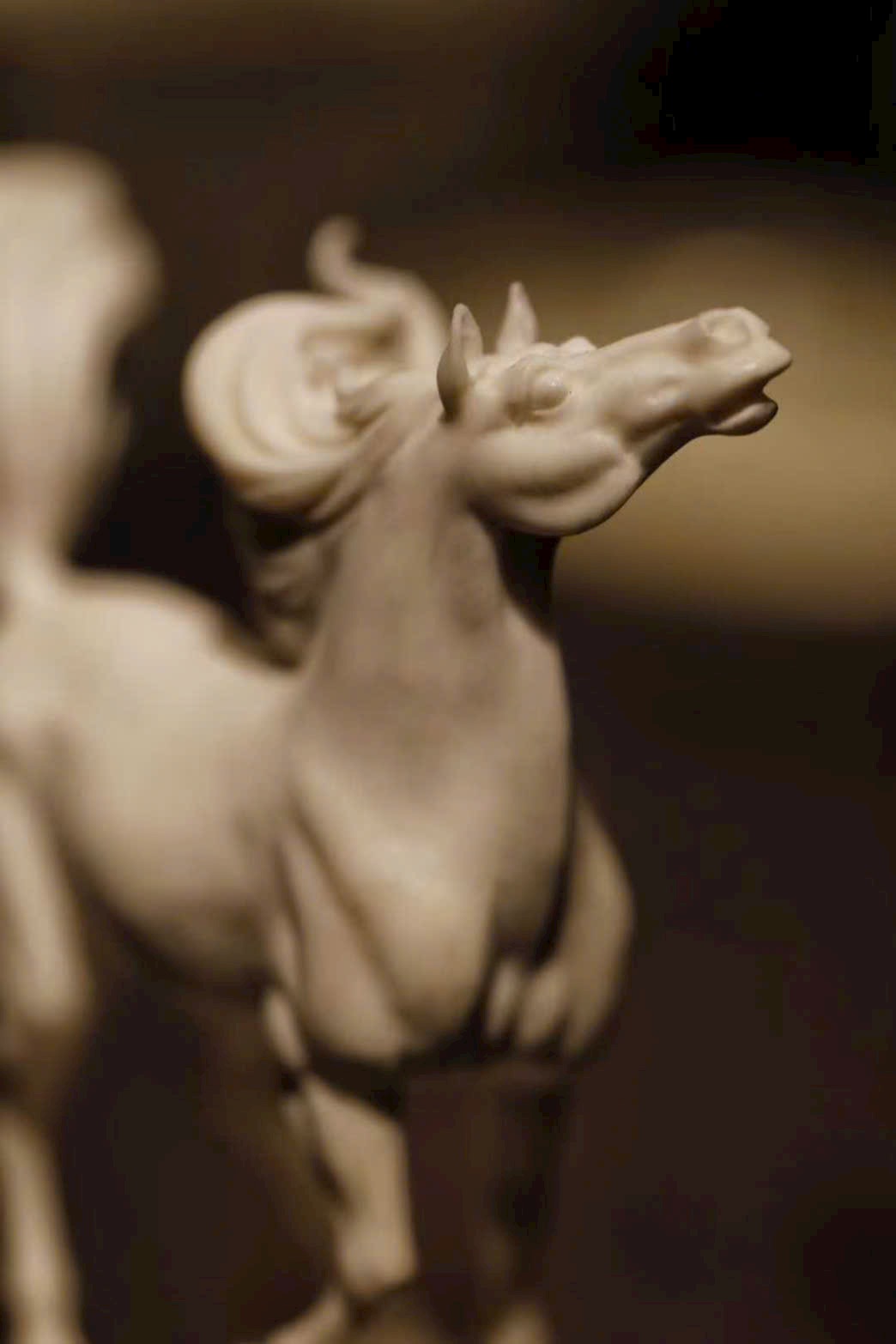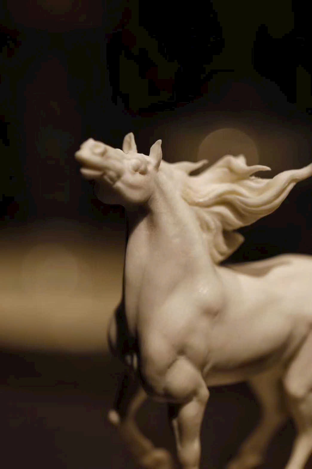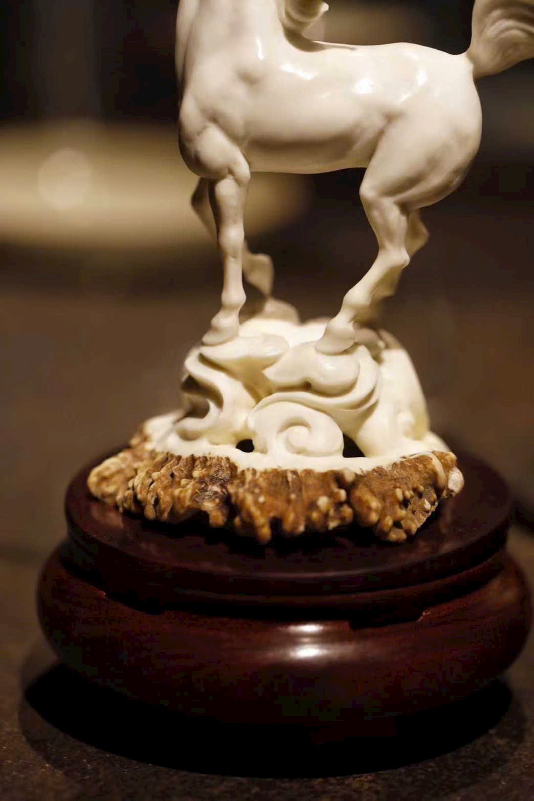 Lư hương chạm khắc hình tượng tuấn mã bằng sừng hươu, dáng ngẩng đầu, tung bờm đầy khí thế như đang cưỡi gió băng mây. Kết hợp với đế gỗ, tổng thể vừa mạnh mẽ vừa thanh nhã.
