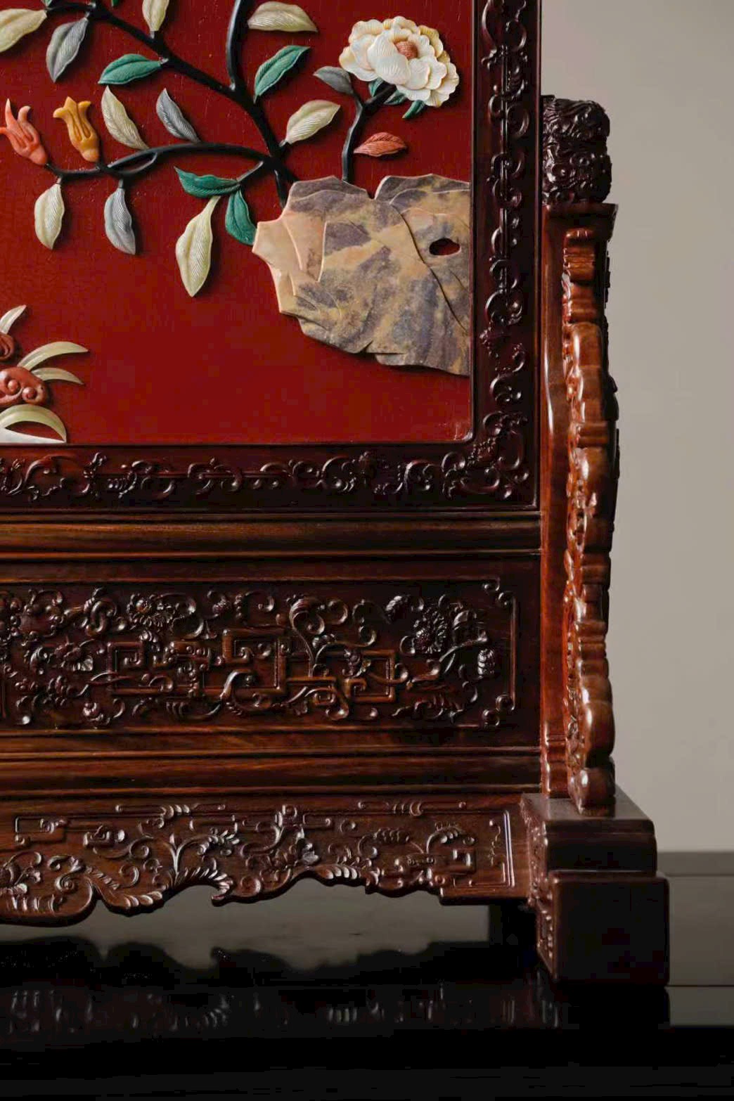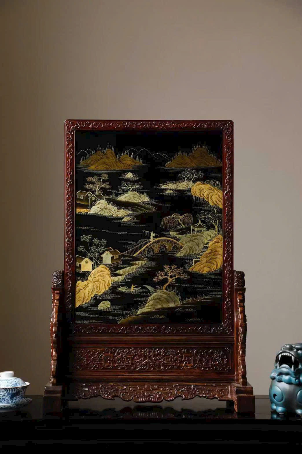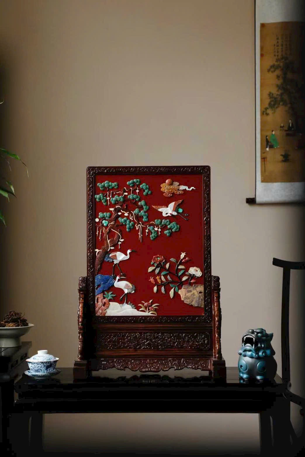 Bình phong chế tác từ gỗ trắc lão liệu, cấu trúc mộng thủ công. Trên bình phong khảm bách bảo tạo nên bức họa “Bác cổ thông kim”, nghệ thuật vẽ kim tuyến miêu tả cảnh “hải thị thận lâu”, toàn khí toát lên vẻ cổ nhã thanh lệ. Phù hợp bày nơi án thư gian giữa, ngắm nhìn tựa cổ vật cung đình, làm dịu tâm trí.