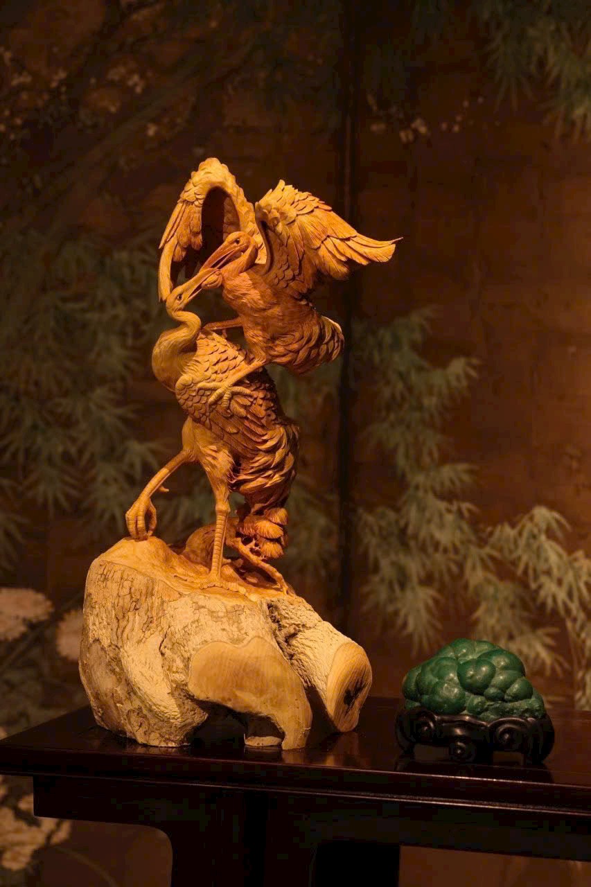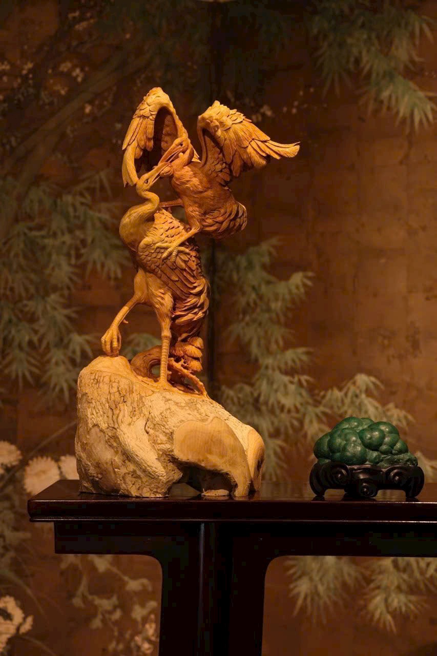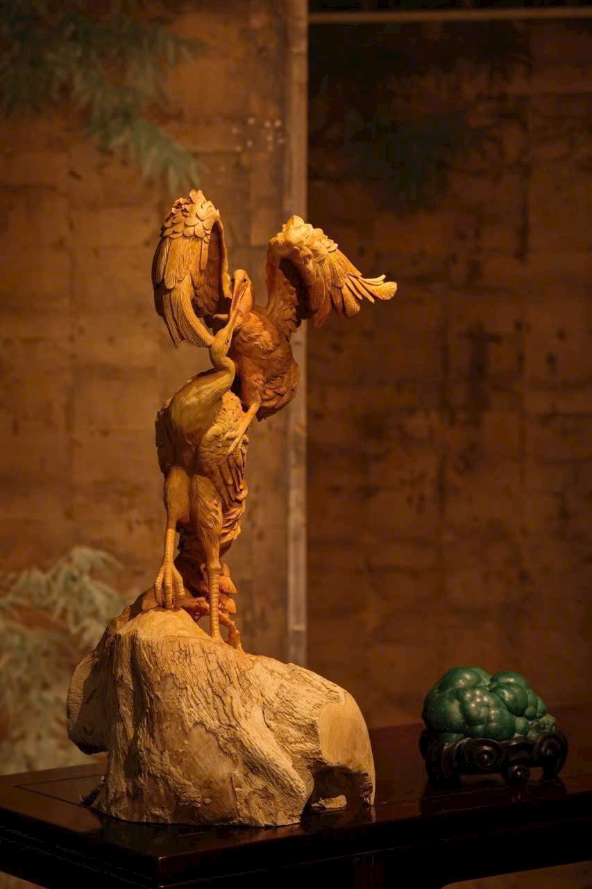 Tác phẩm được chạm khắc liền khối, khéo léo thuận theo dáng gỗ, tôn lên vẻ tự nhiên sinh động. Đường dao chân thực, tạo hình sống động – hạc lành dang cánh như đón gió, dáng vẻ thanh tao linh hoạt, thần thái hài hòa, tràn đầy sinh khí. Hạc sánh cùng tùng xanh dâng thọ, gửi gắm lời chúc trường thọ và cát tường.