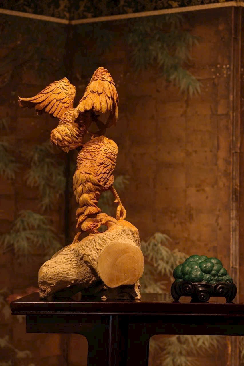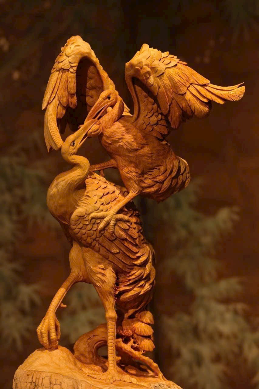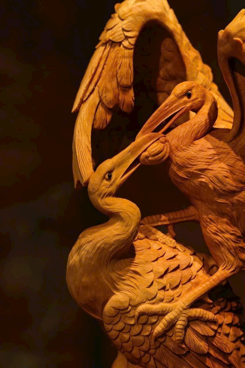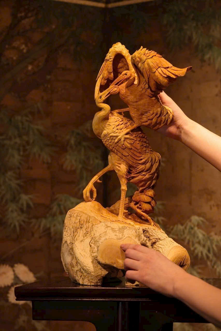 Tác phẩm được chạm khắc liền khối, khéo léo thuận theo dáng gỗ, tôn lên vẻ tự nhiên sinh động. Đường dao chân thực, tạo hình sống động – hạc lành dang cánh như đón gió, dáng vẻ thanh tao linh hoạt, thần thái hài hòa, tràn đầy sinh khí. Hạc sánh cùng tùng xanh dâng thọ, gửi gắm lời chúc trường thọ và cát tường.