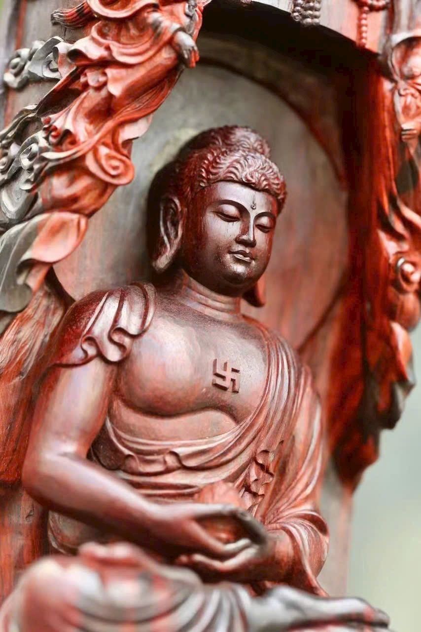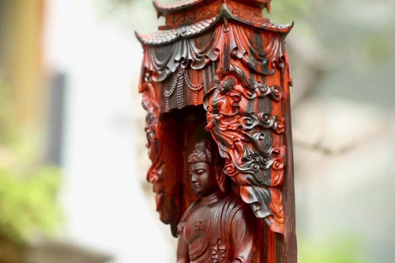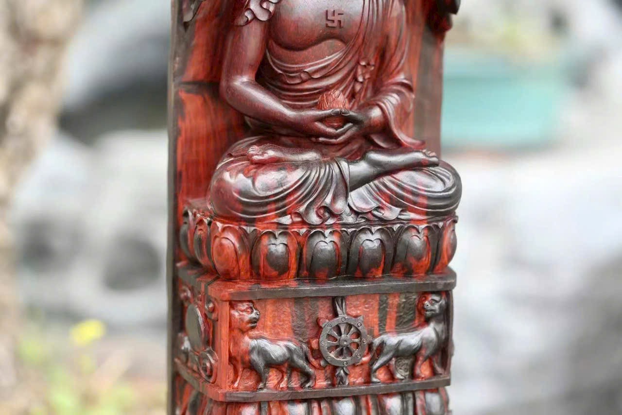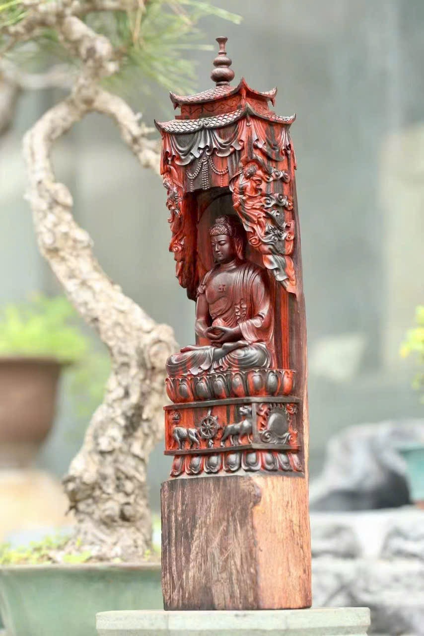 Tượng A Di Đà nhập thế an nhiên trong tư thế đứng, dáng uy nghi giữa hình thế thạch động điêu khắc sâu tầng lớp, thân pháp trang nghiêm, thần thái từ hòa. Gỗ tử đàn cổ có sắc trầm ấm, vân mịn bóng dầu, toát lên khí chất tĩnh lặng và thanh tịnh.