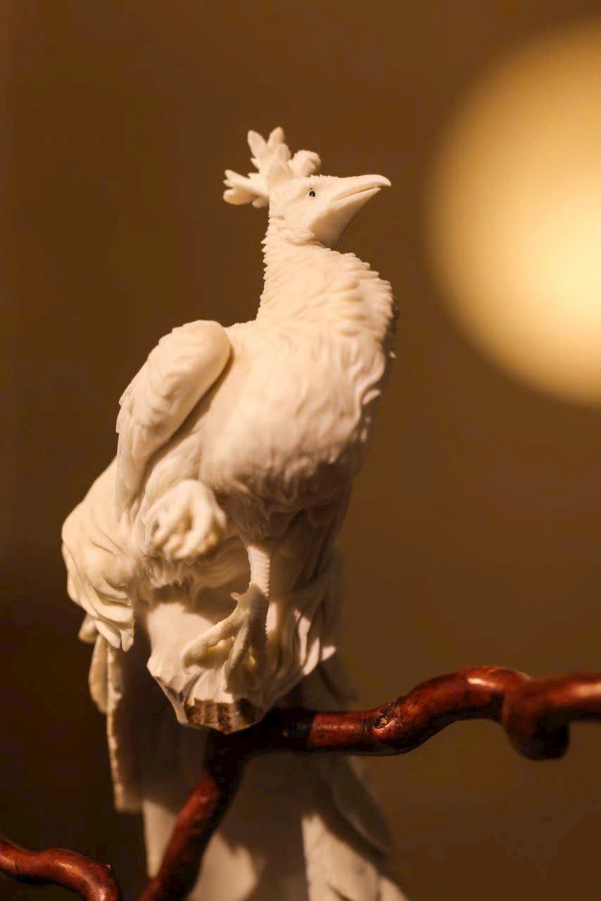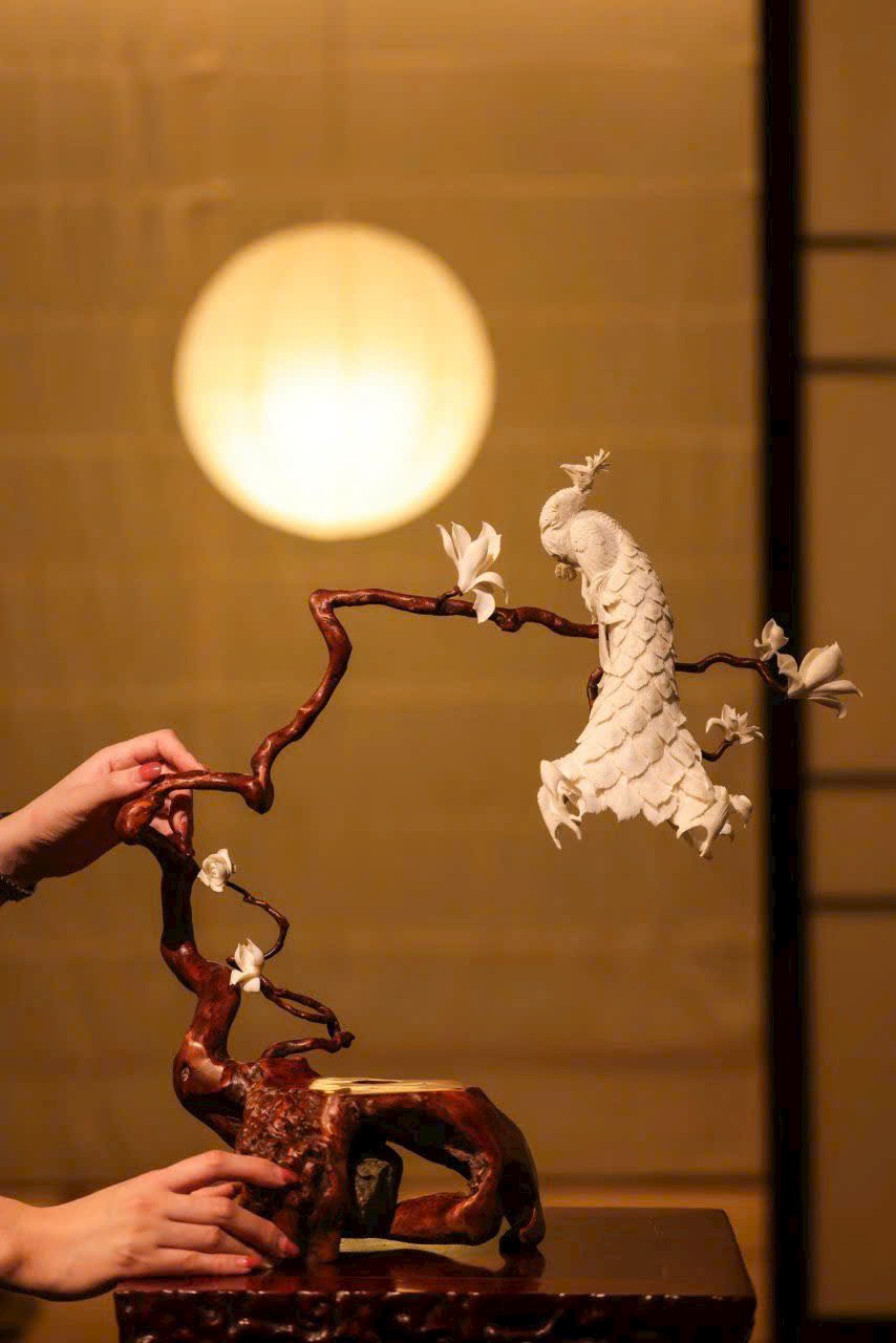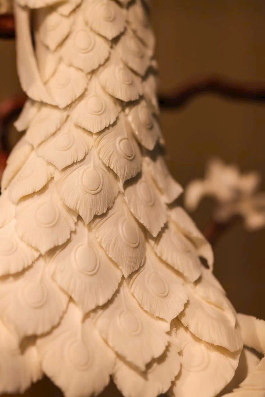 Đường nét điêu khắc mang vẻ mộc mạc tự nhiên, sắc gỗ trầm ấm, cổ nhã. Những đường xuyên, lớp chồng tự nhiên hòa quyện, thể hiện trọn nét thú vị của núi rừng hoang dã. Chim công với từng tầng lông xếp lớp, đứng vững trên gốc cây, toát lên khí chất thanh quý, đoan trang. Bày nơi bàn hay tủ trưng, cảnh sắc trong sáng, dễ làm say mắt người ngắm.