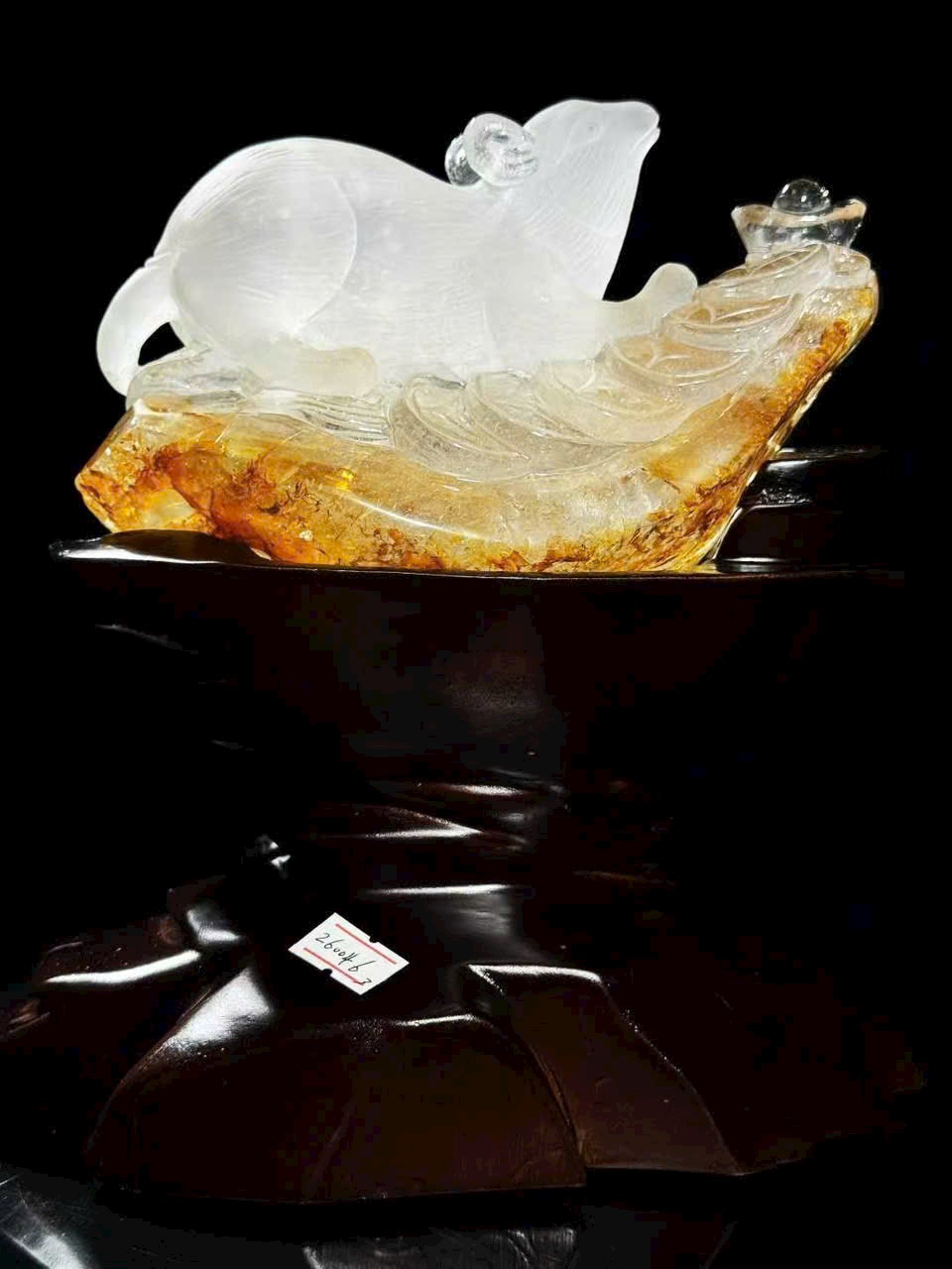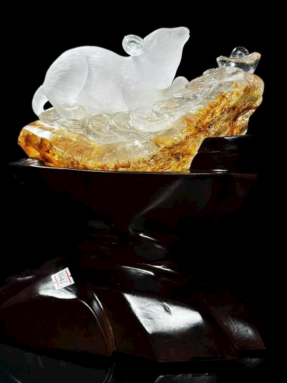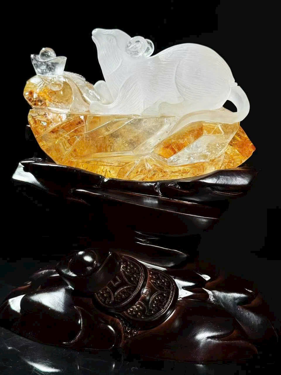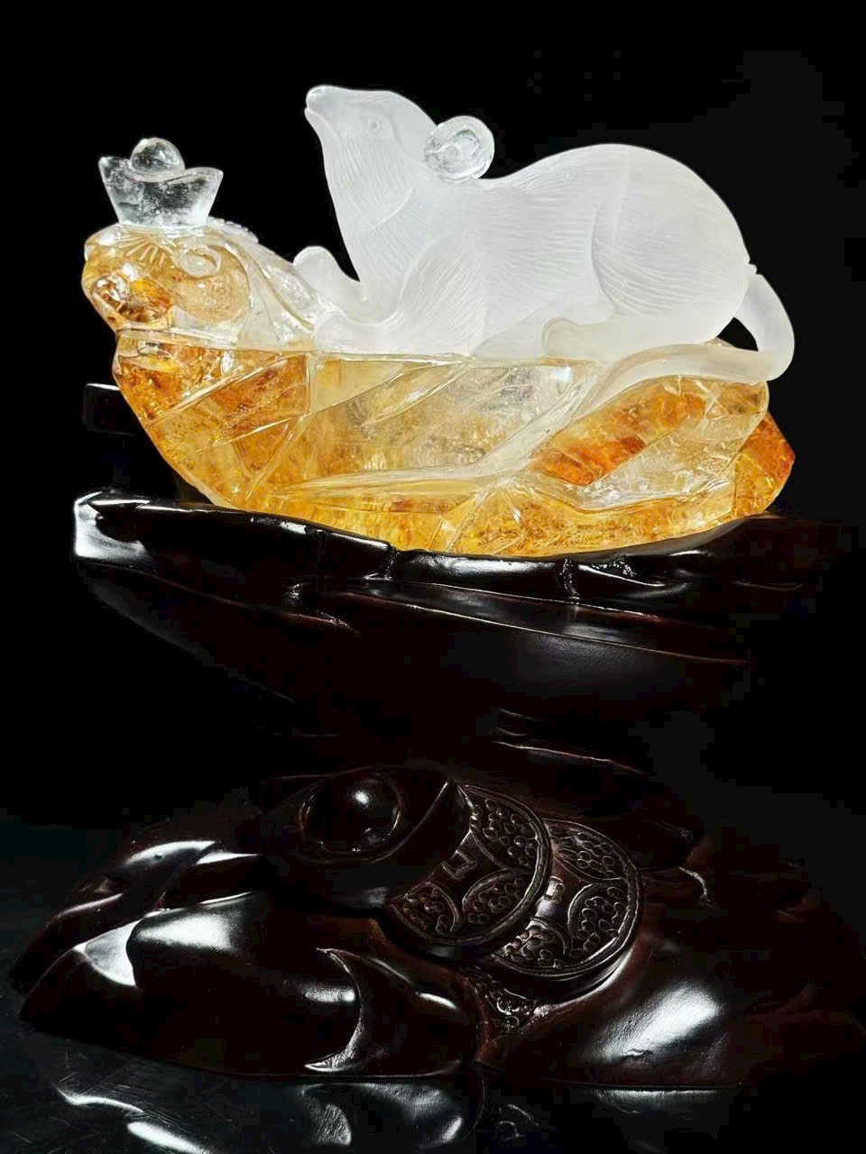 Tượng chuột phong thủy bằng thạch anh trắng thiên nhiên có hoa keo vàng.