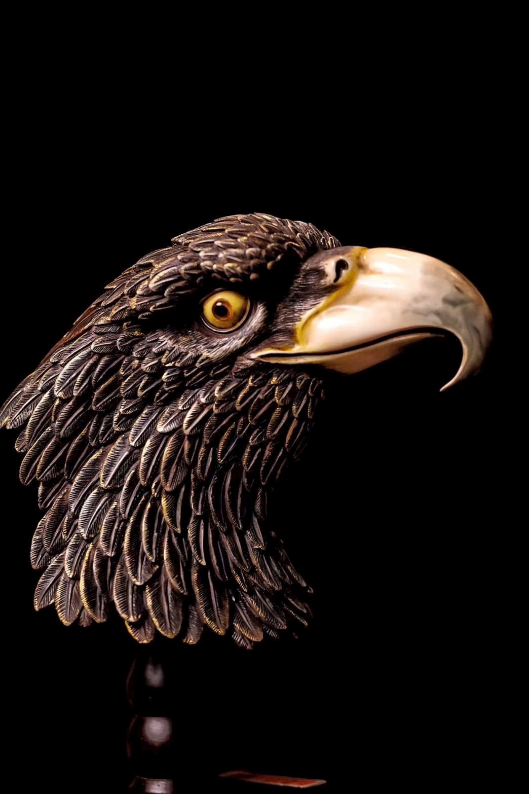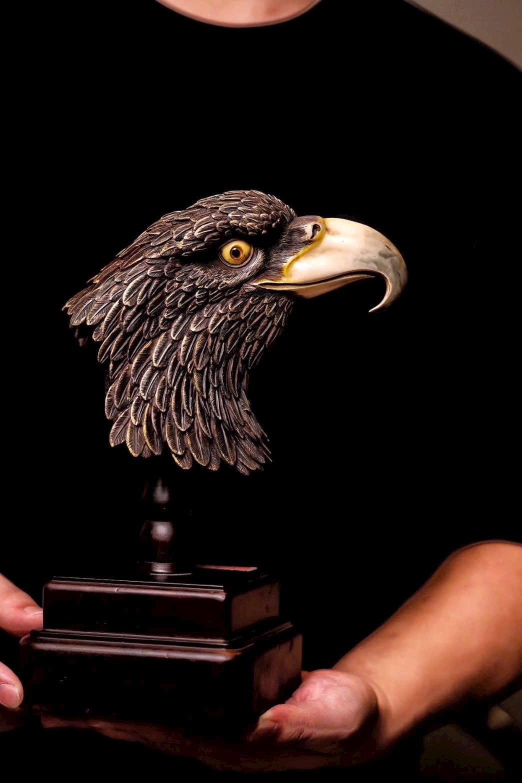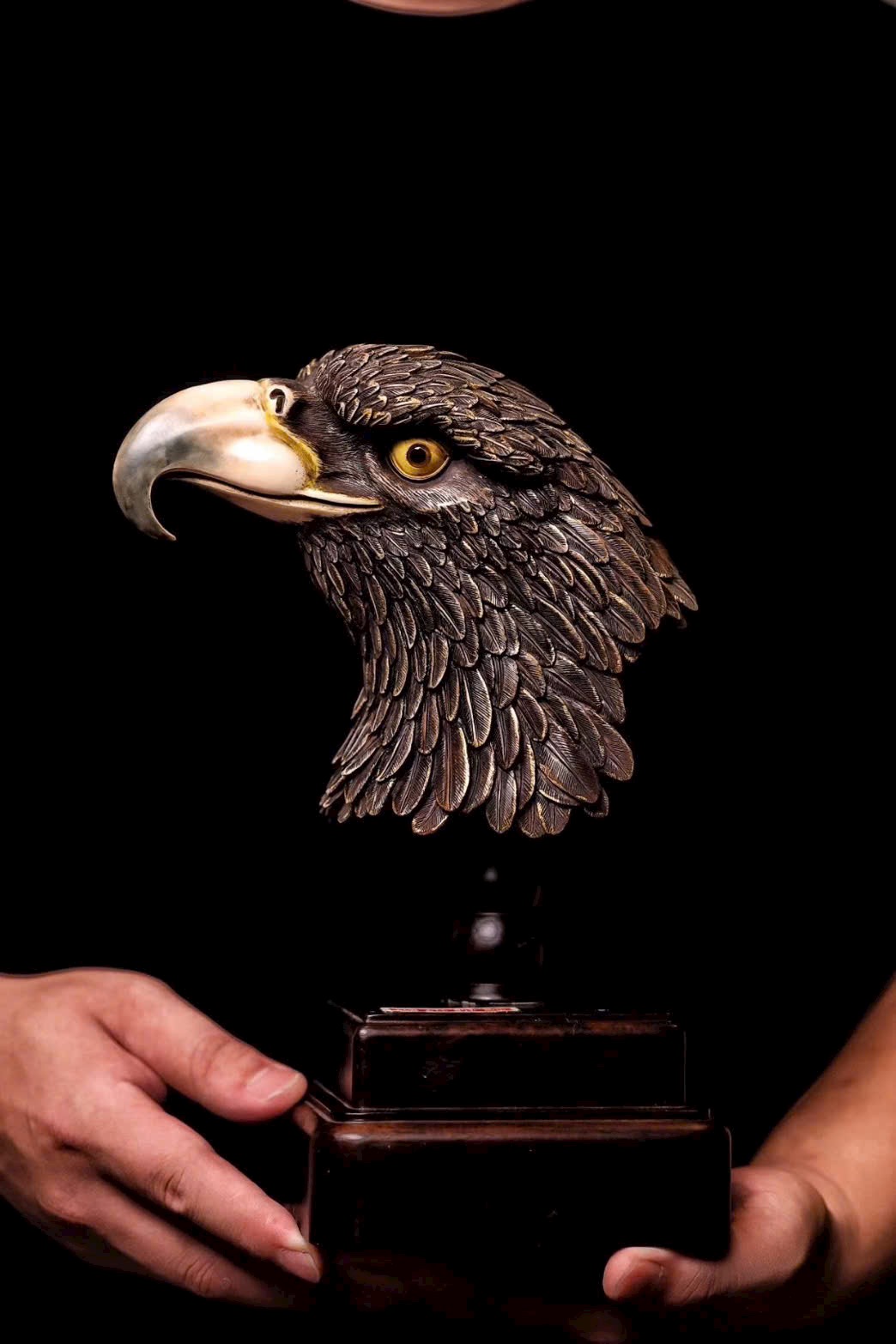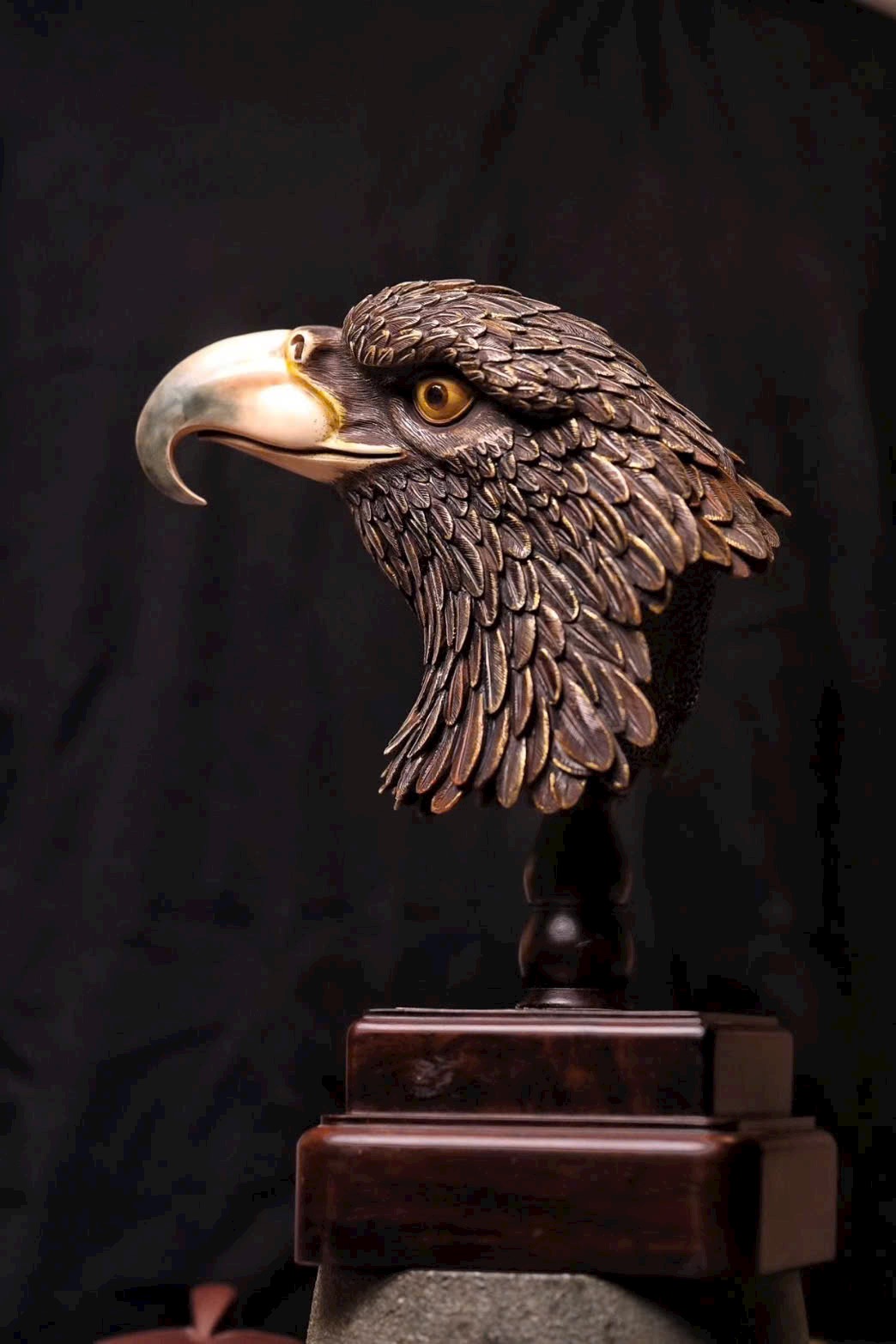 Tượng đầu chim ưng được chạm khắc sống động như thật — ánh mắt sắc bén, từng đường vân lông mạnh mẽ đầy khí lực, toát lên khí chất uy nghi và quyền lực. Chim ưng từ xưa đã là biểu tượng của sức mạnh và tự do; nó tung cánh giữa trời cao, nhìn bao quát cả đại địa, ánh mắt sắc như đuốc.