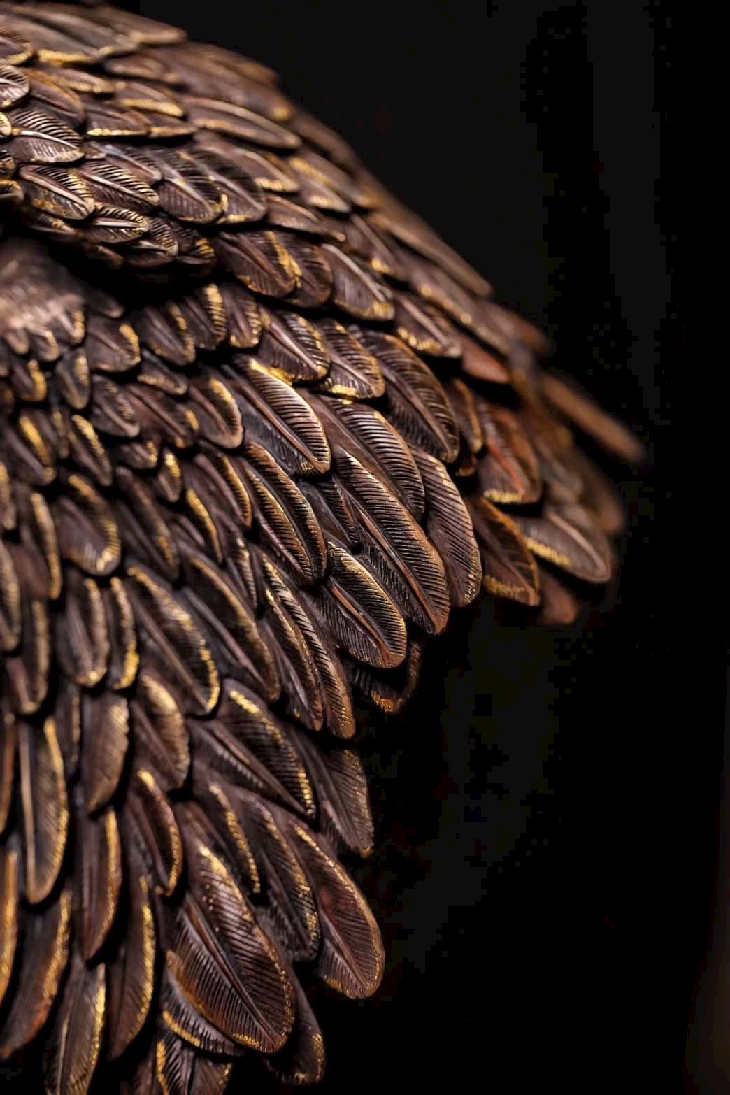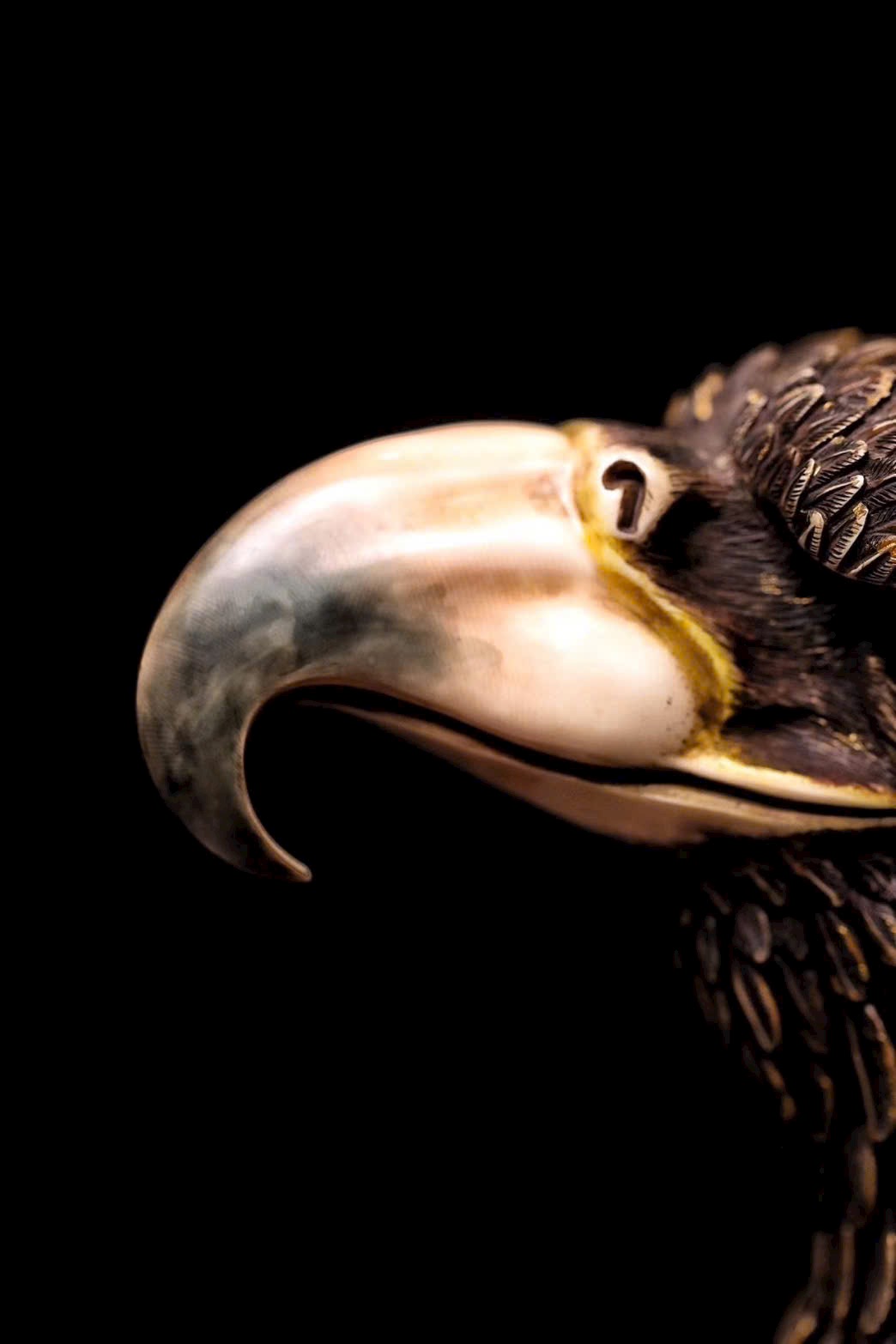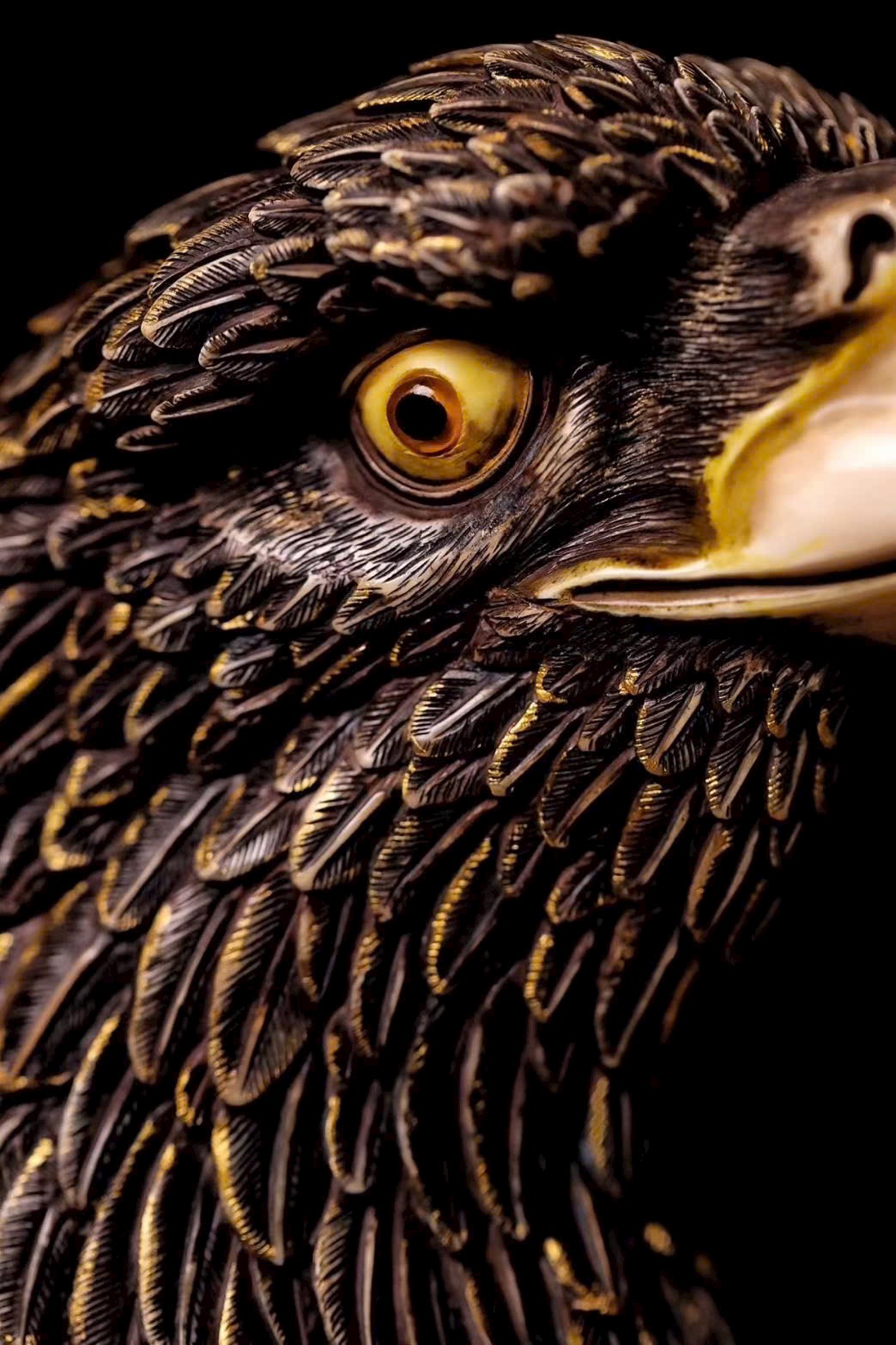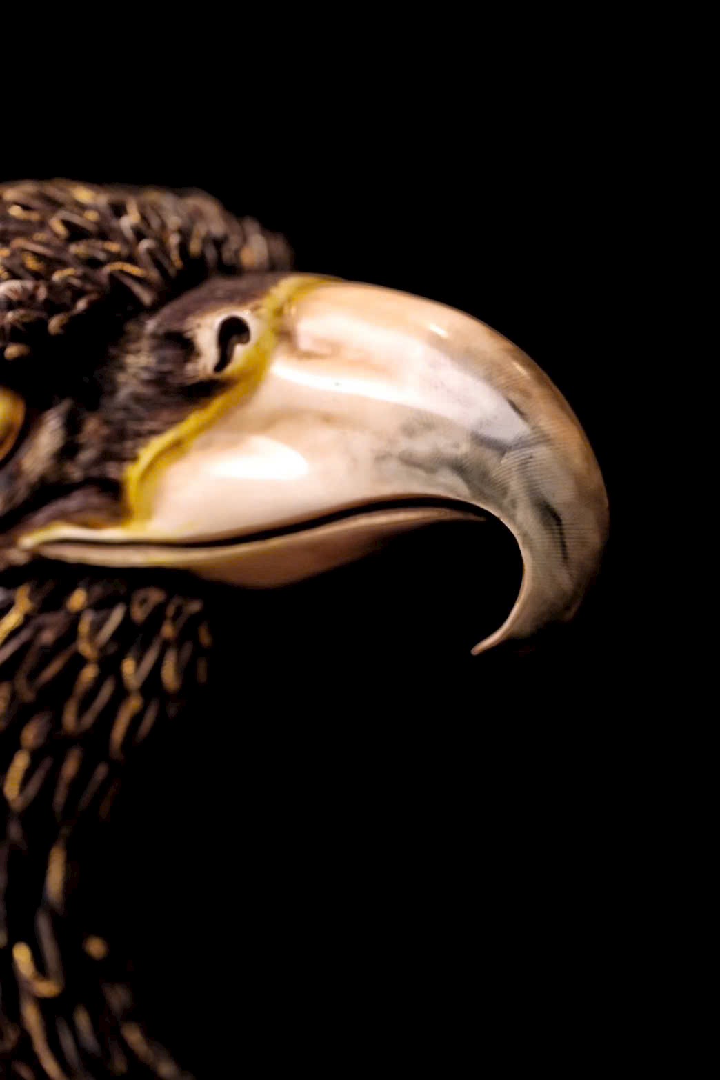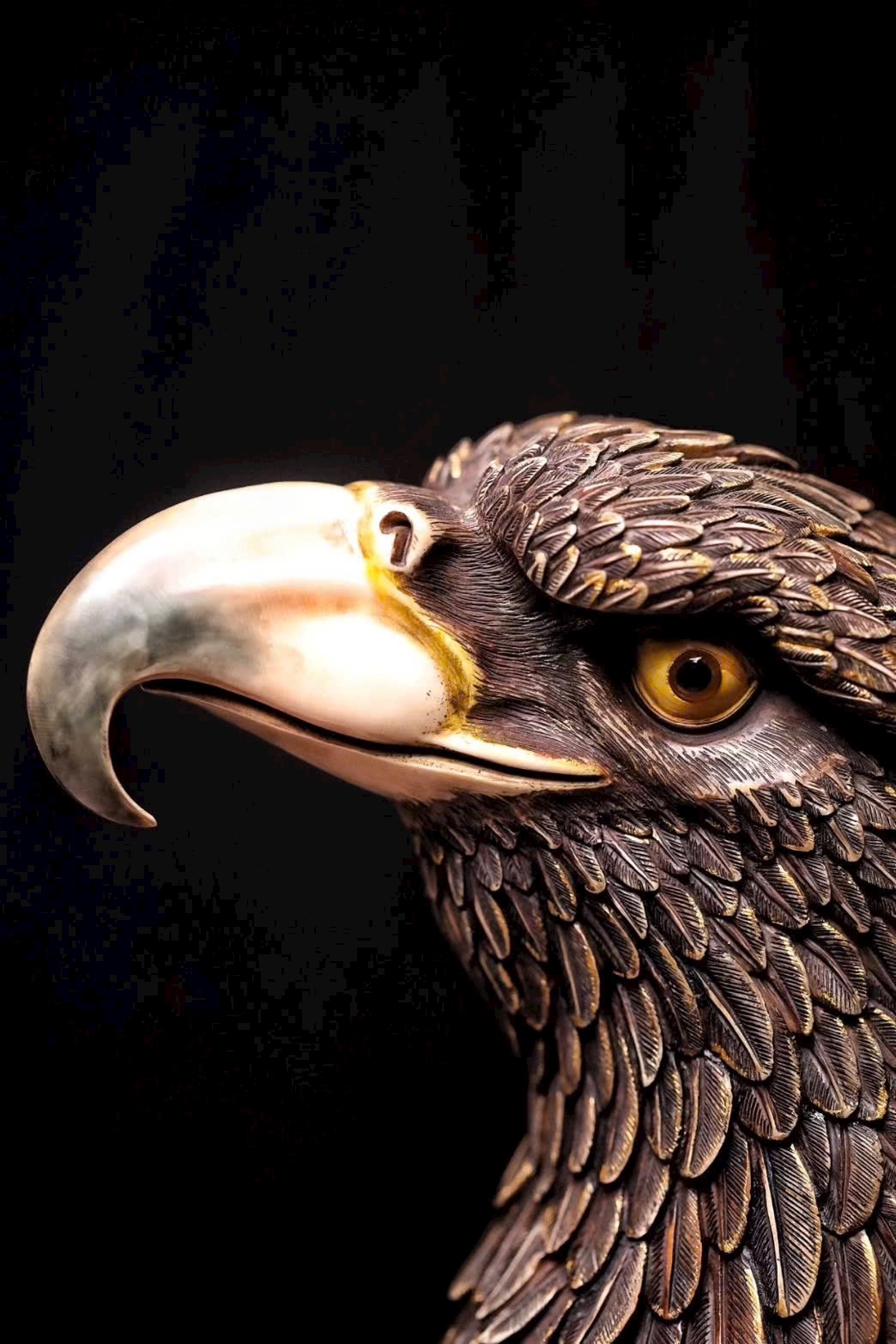 Tượng đầu chim ưng được chạm khắc sống động như thật — ánh mắt sắc bén, từng đường vân lông mạnh mẽ đầy khí lực, toát lên khí chất uy nghi và quyền lực. Chim ưng từ xưa đã là biểu tượng của sức mạnh và tự do; nó tung cánh giữa trời cao, nhìn bao quát cả đại địa, ánh mắt sắc như đuốc.