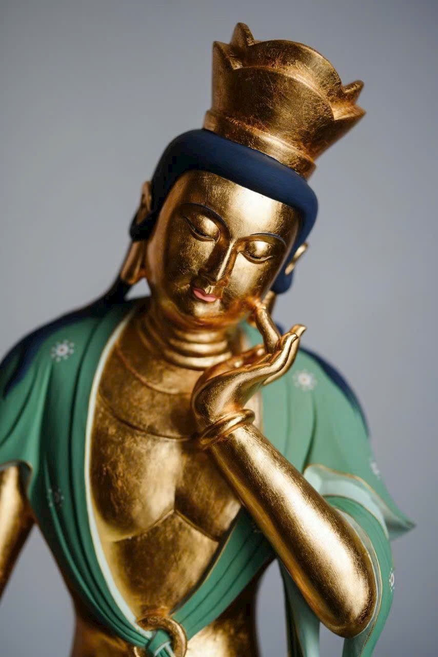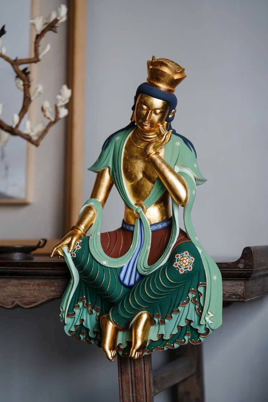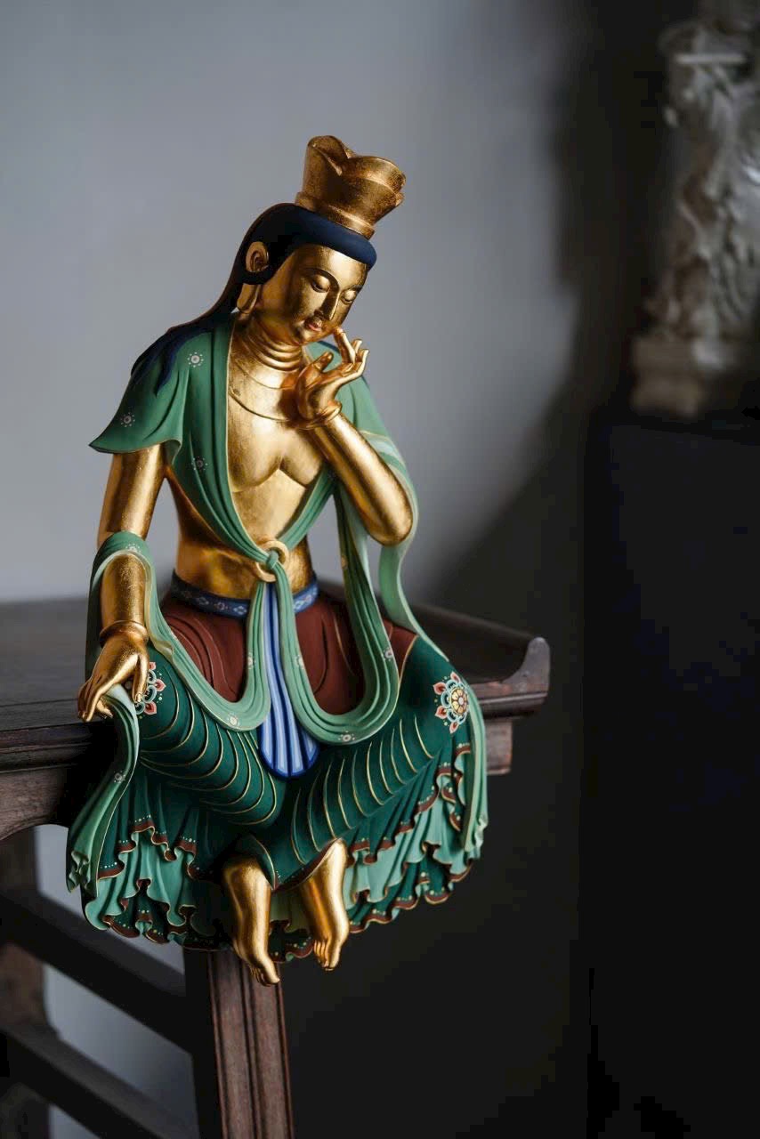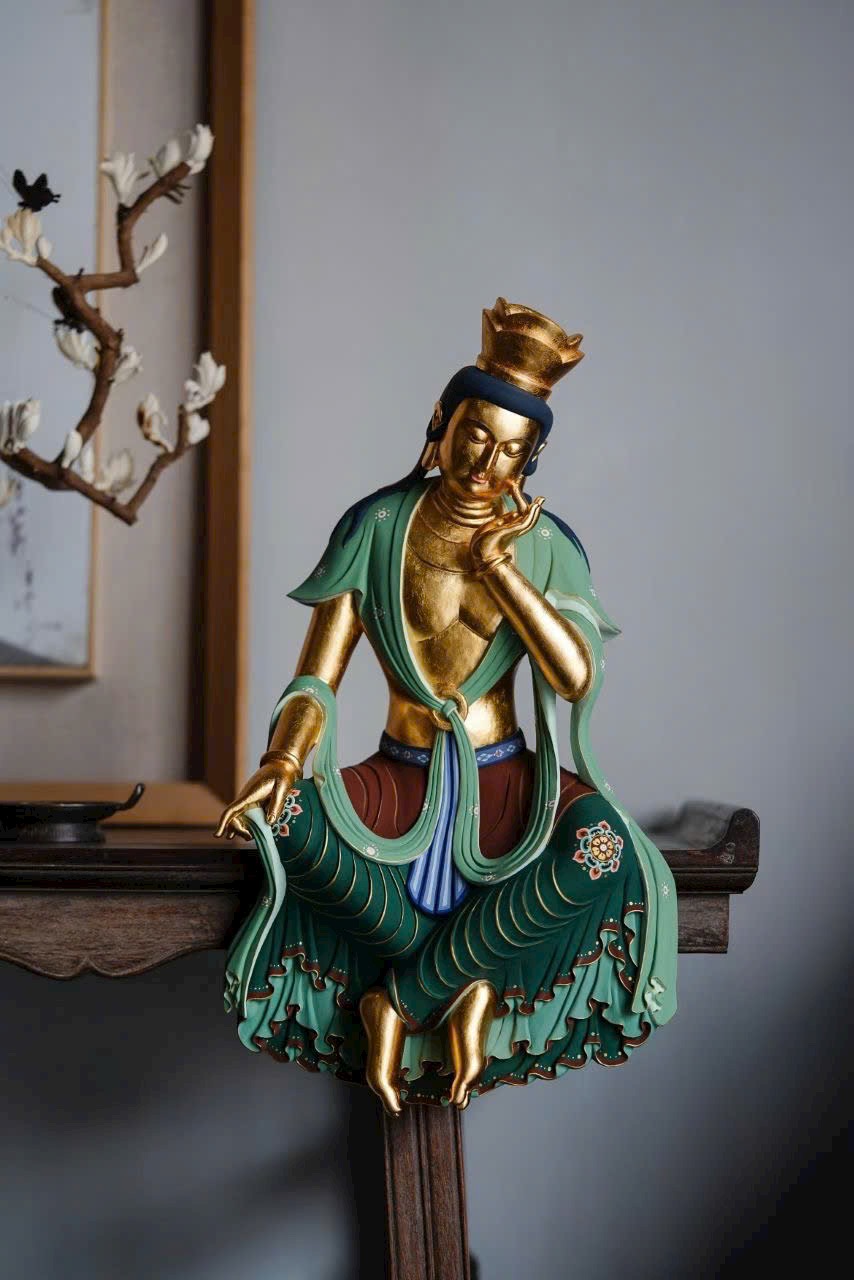 Tác phẩm phỏng theo phong cách nghệ thuật cổ Bắc Ngụy, chạm khắc tinh tế. Ánh kim thếp vàng rực rỡ, Di Lặc Bồ Tát nghiêng đầu chống tay, thần thái an nhiên trầm mặc. Dáng ngồi thư thái thanh tú, hoa văn áo choàng vẽ màu uyển chuyển tầng tầng lớp lớp như sóng nước, lan tỏa cảm giác thanh tịnh và yên hòa, làm tăng thêm vẻ trang nhã và an lạc cho không gian trưng bày.