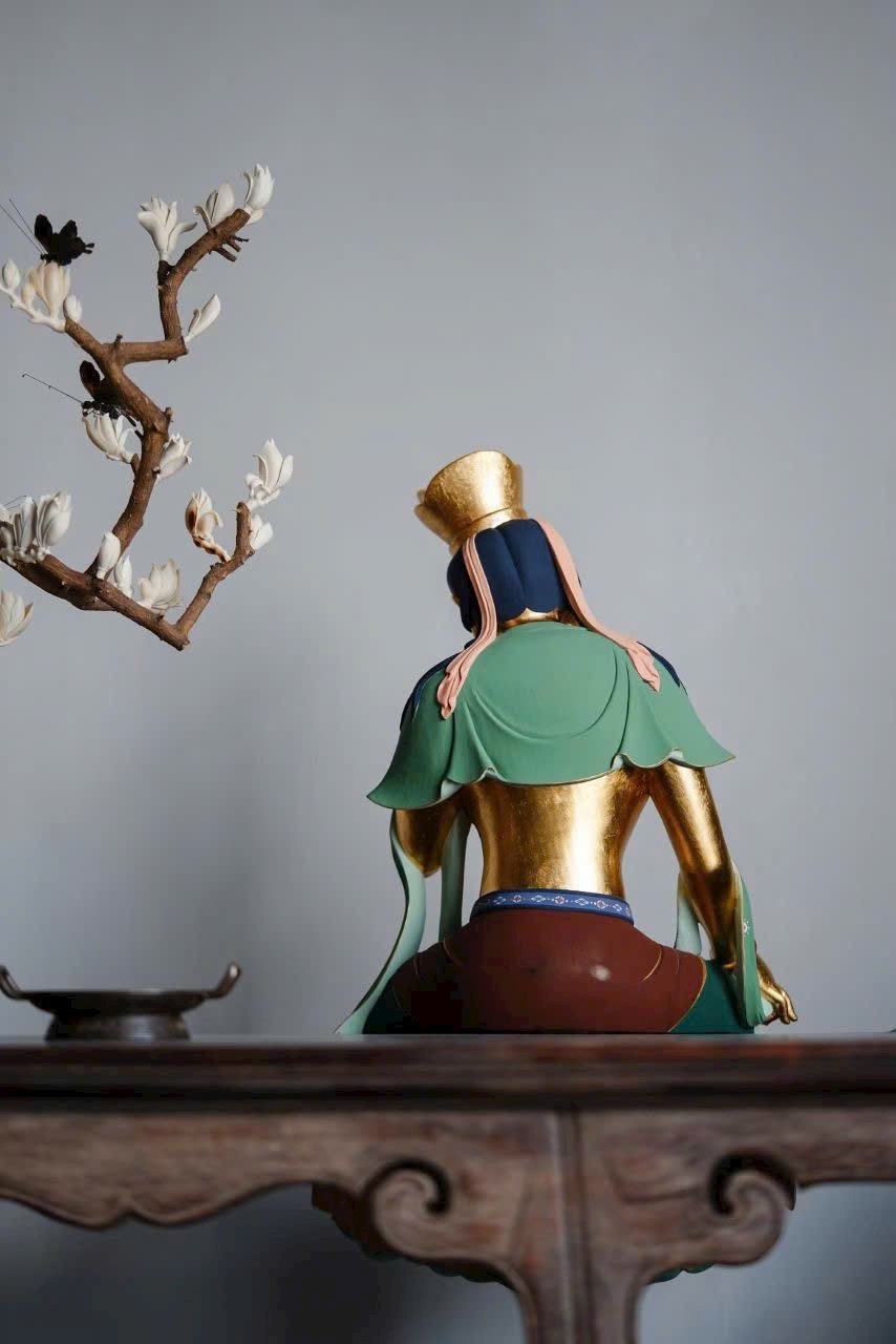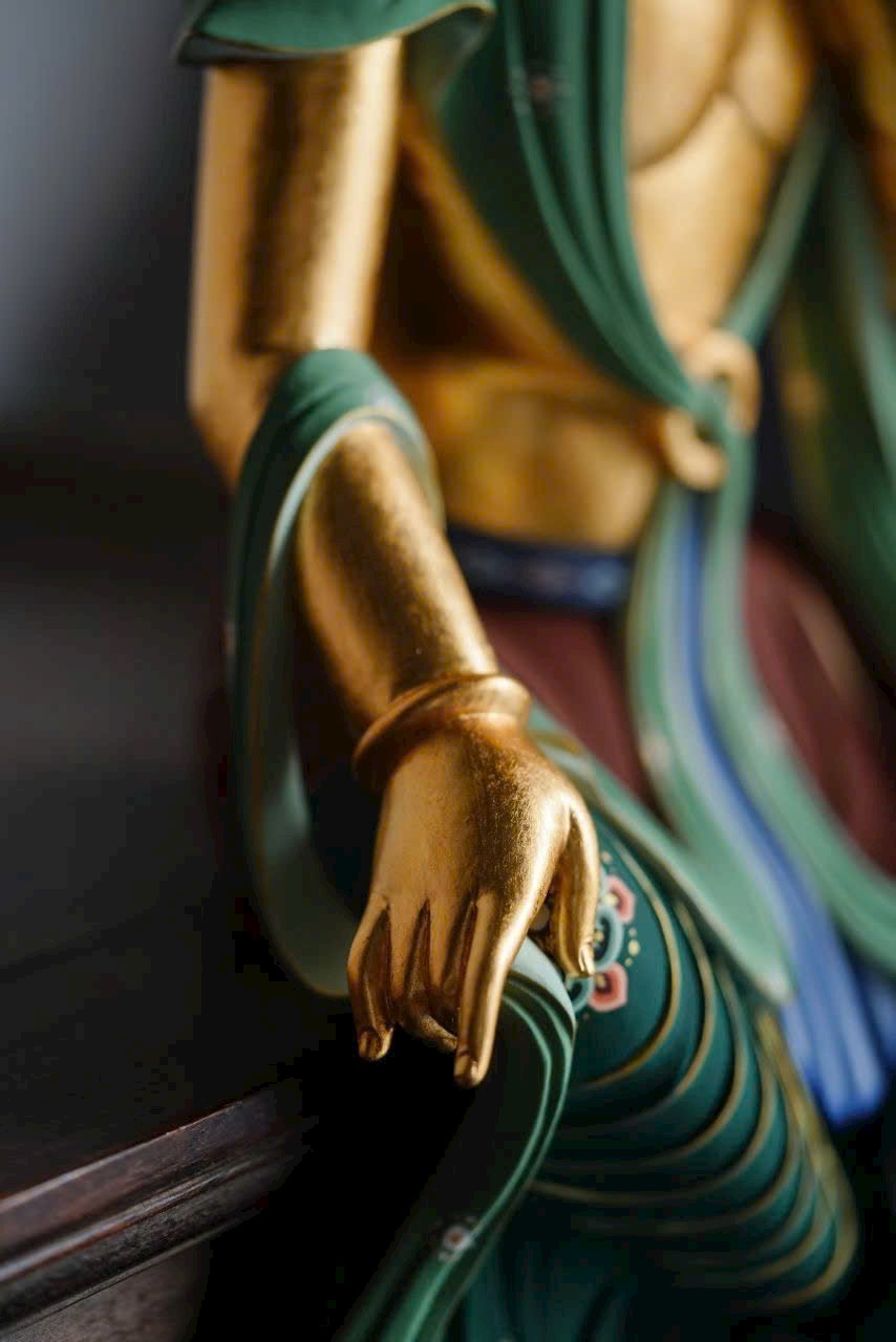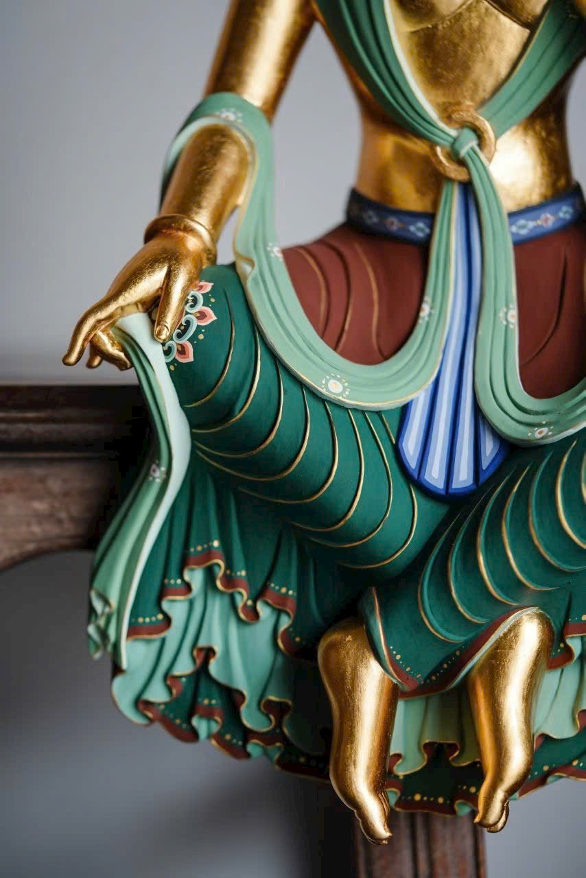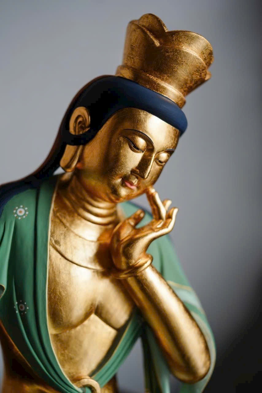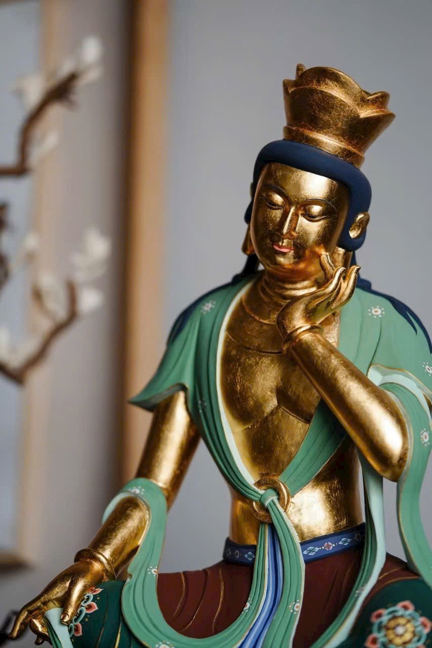 Tác phẩm phỏng theo phong cách nghệ thuật cổ Bắc Ngụy, chạm khắc tinh tế. Ánh kim thếp vàng rực rỡ, Di Lặc Bồ Tát nghiêng đầu chống tay, thần thái an nhiên trầm mặc. Dáng ngồi thư thái thanh tú, hoa văn áo choàng vẽ màu uyển chuyển tầng tầng lớp lớp như sóng nước, lan tỏa cảm giác thanh tịnh và yên hòa, làm tăng thêm vẻ trang nhã và an lạc cho không gian trưng bày.