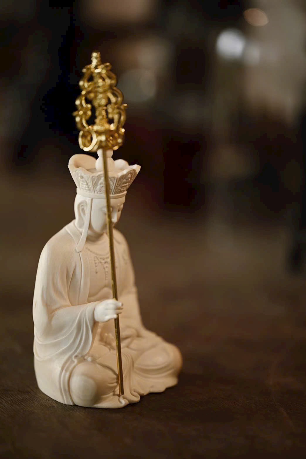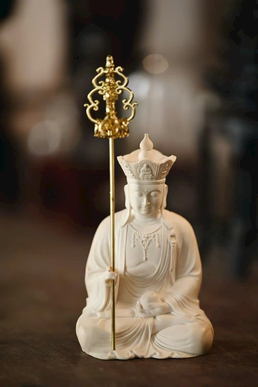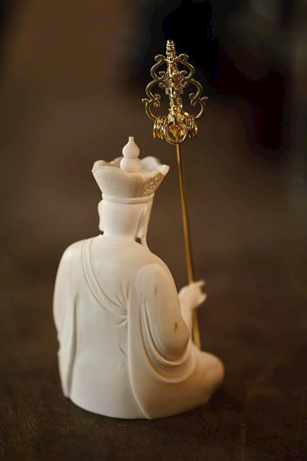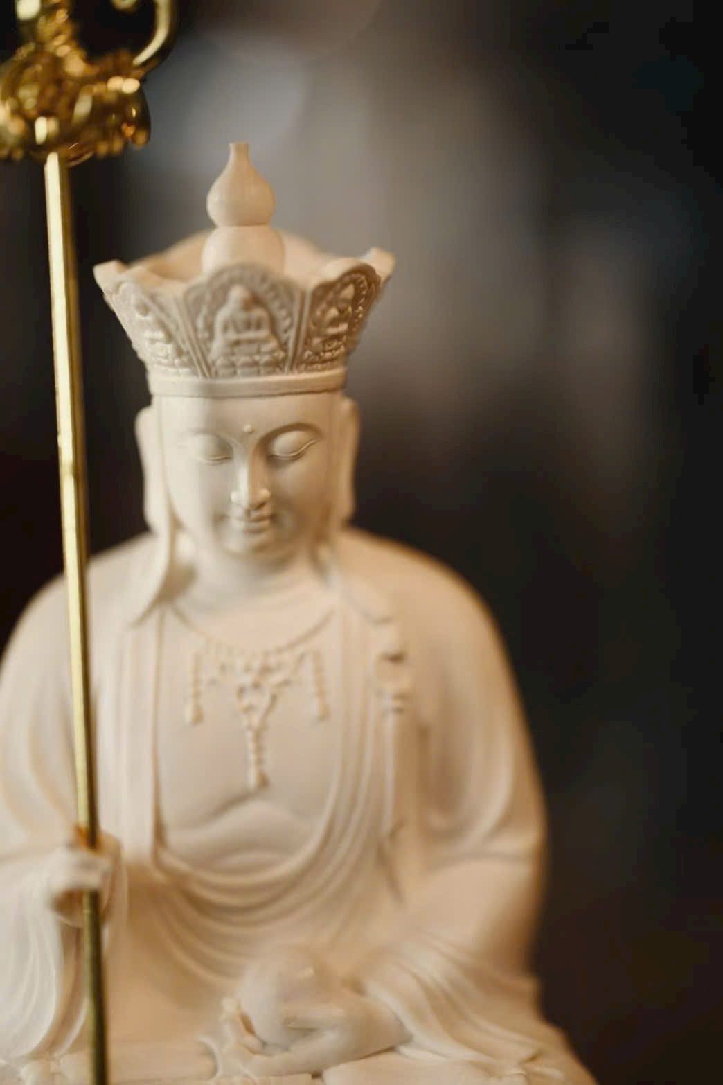 Tạc thủ công từ ng.à mamut quý hiếm, Địa Tạng Vương ngồi kiết già, nét mặt từ bi thanh tịnh, đầu đội mũ Tỳ Lô, tay phải cầm tích trượng sáu vòng, tay trái nâng ngọc minh châu. Pháp tướng trang nghiêm, lan tỏa năng lượng an lành và vững chãi. Phù hợp thờ phụng hoặc trưng bày trong không gian thiền định, phòng làm việc.
