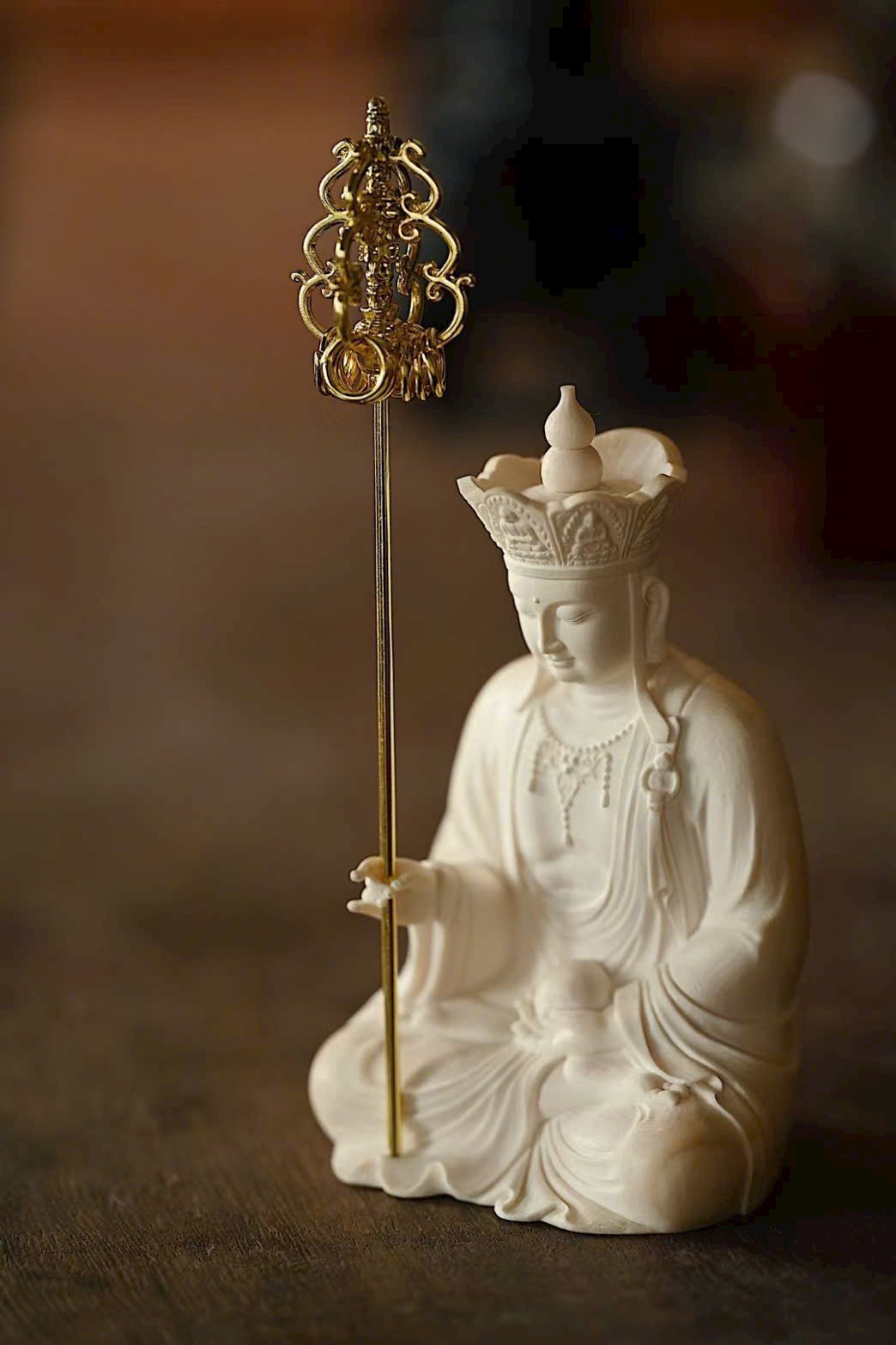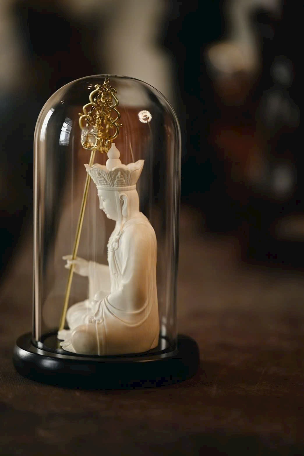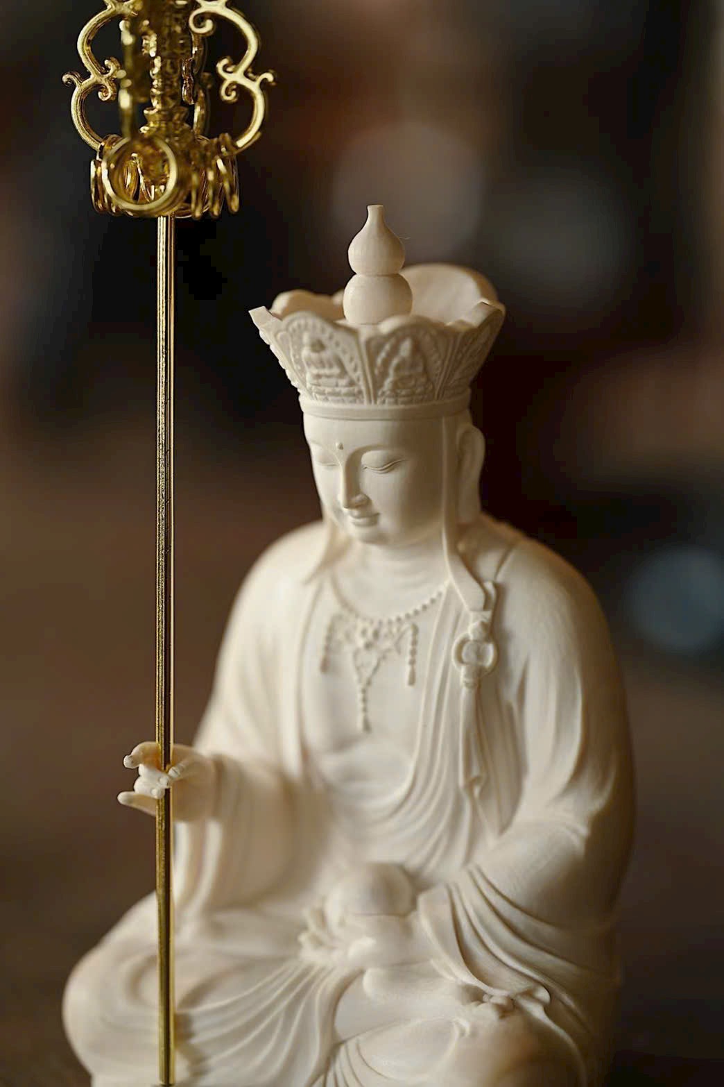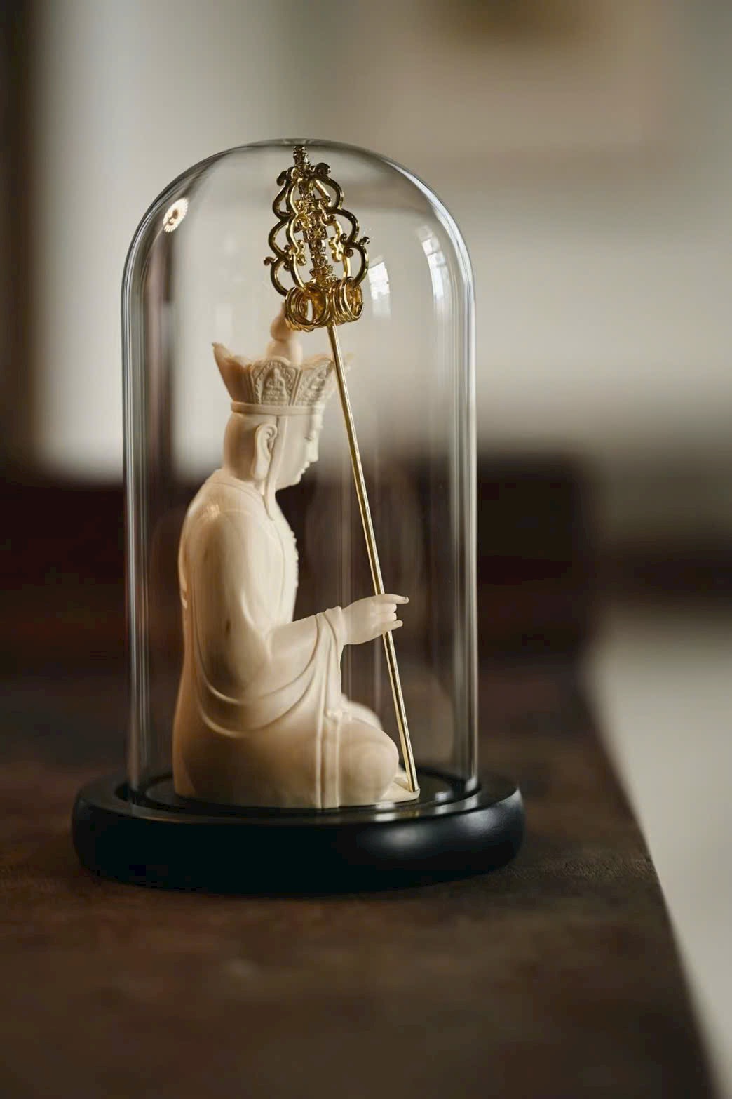 Tạc thủ công từ ng.à mamut quý hiếm, Địa Tạng Vương ngồi kiết già, nét mặt từ bi thanh tịnh, đầu đội mũ Tỳ Lô, tay phải cầm tích trượng sáu vòng, tay trái nâng ngọc minh châu. Pháp tướng trang nghiêm, lan tỏa năng lượng an lành và vững chãi. Phù hợp thờ phụng hoặc trưng bày trong không gian thiền định, phòng làm việc.