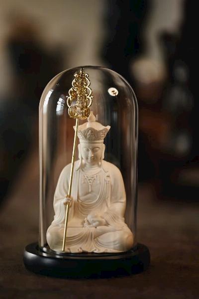 Tạc thủ công từ ng.à mamut quý hiếm, Địa Tạng Vương ngồi kiết già, nét mặt từ bi thanh tịnh, đầu đội mũ Tỳ Lô, tay phải cầm tích trượng sáu vòng, tay trái nâng ngọc minh châu. Pháp tướng trang nghiêm, lan tỏa năng lượng an lành và vững chãi. Phù hợp thờ phụng hoặc trưng bày trong không gian thiền định, phòng làm việc.