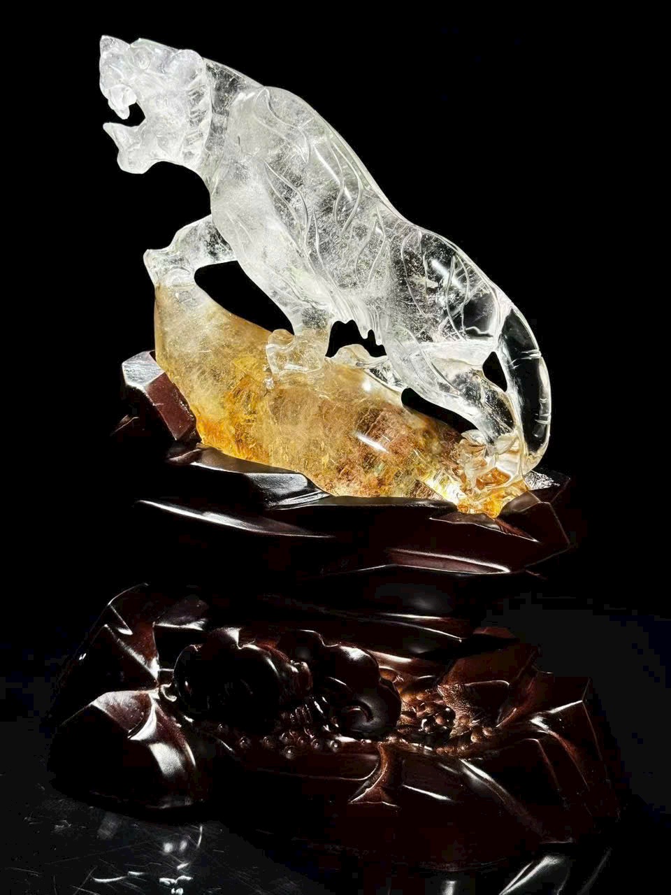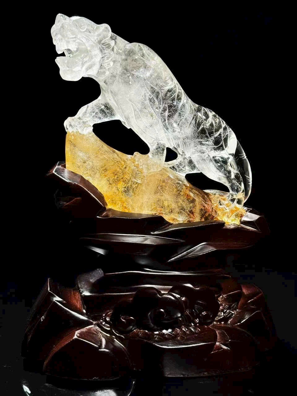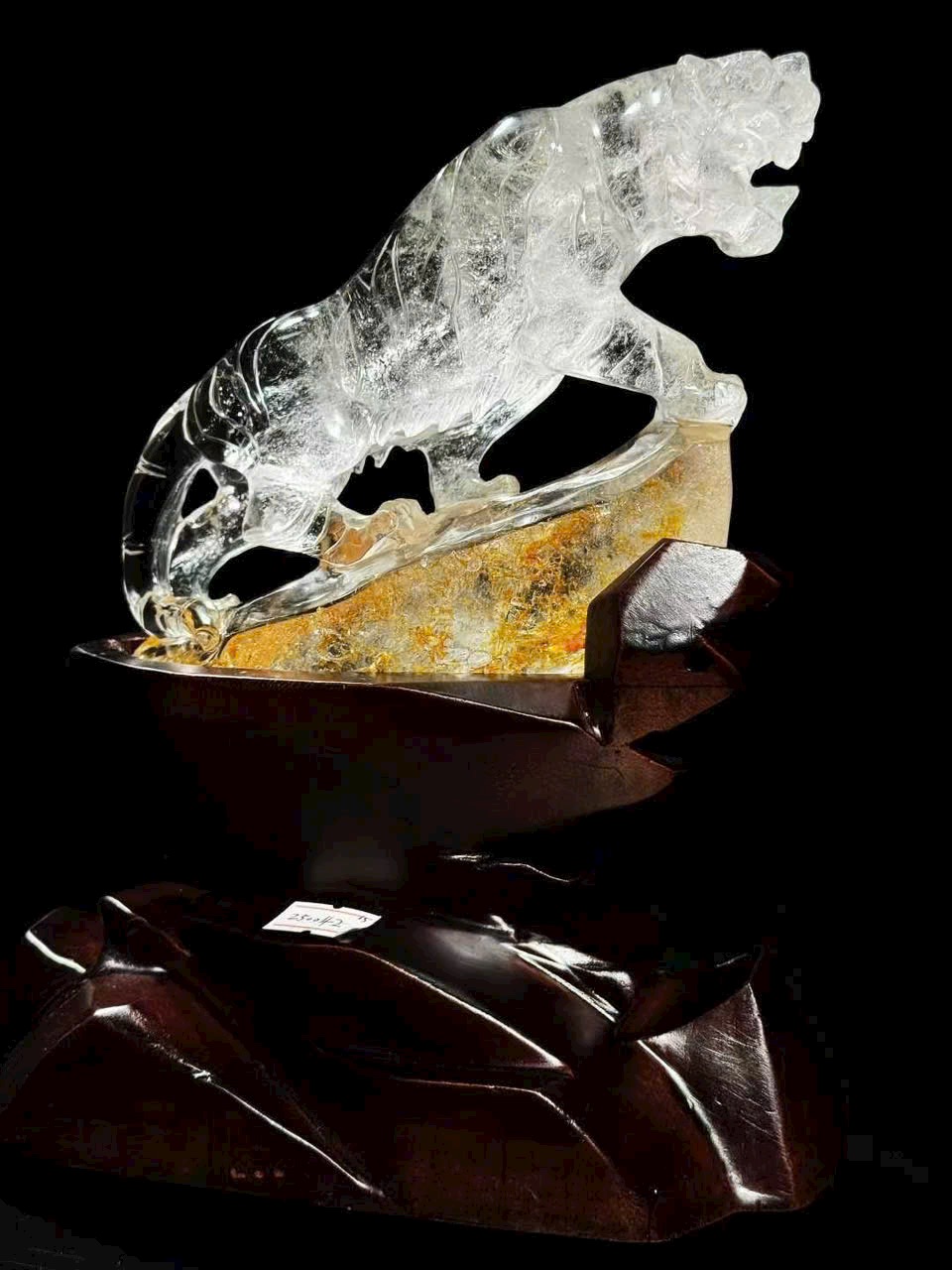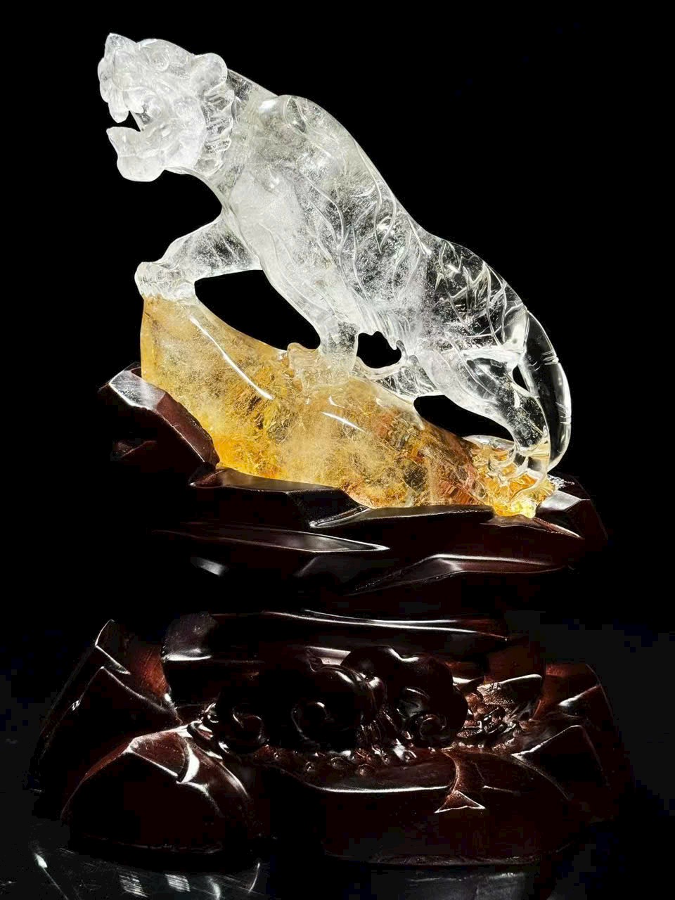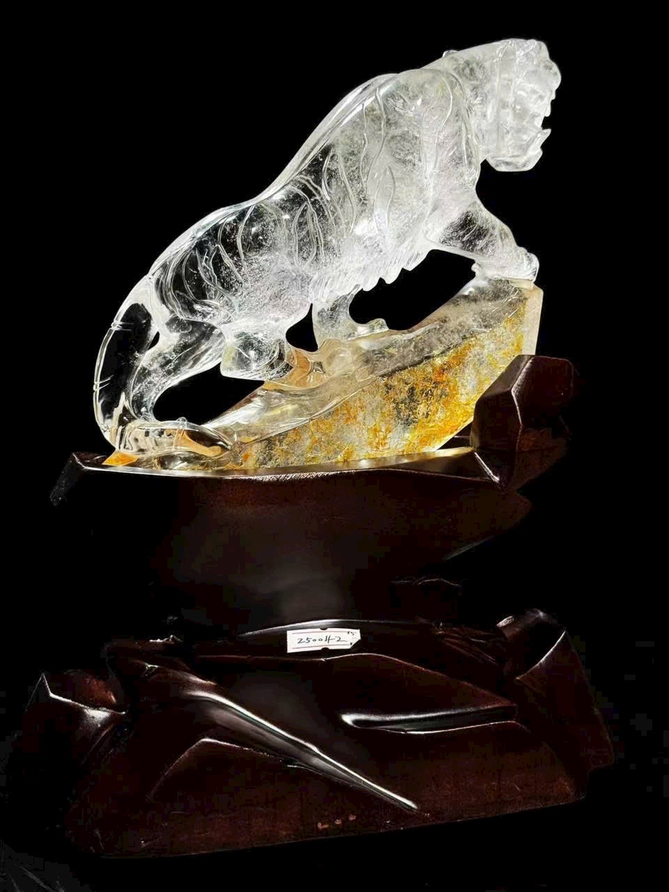 Tượng hổ phong thủy bằng thạch anh trắng thiên nhiên có hoa keo vàng.