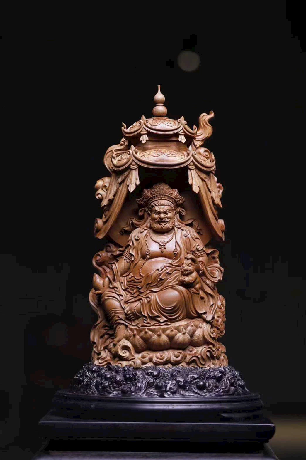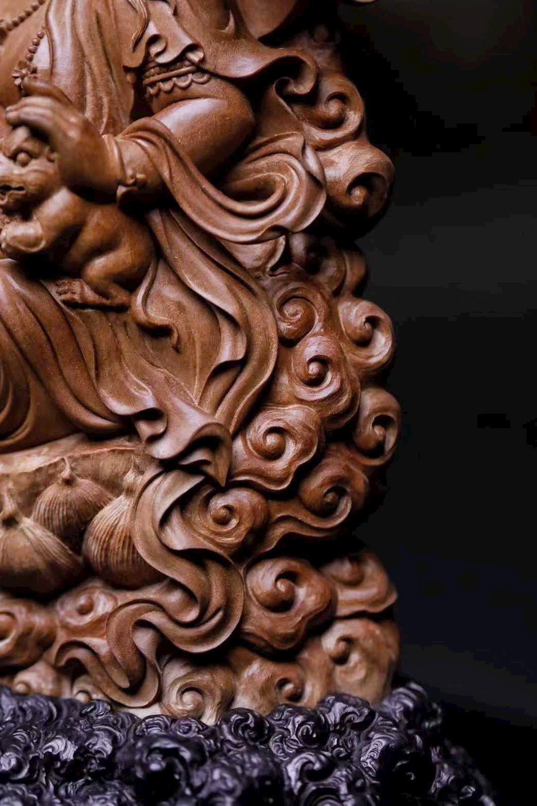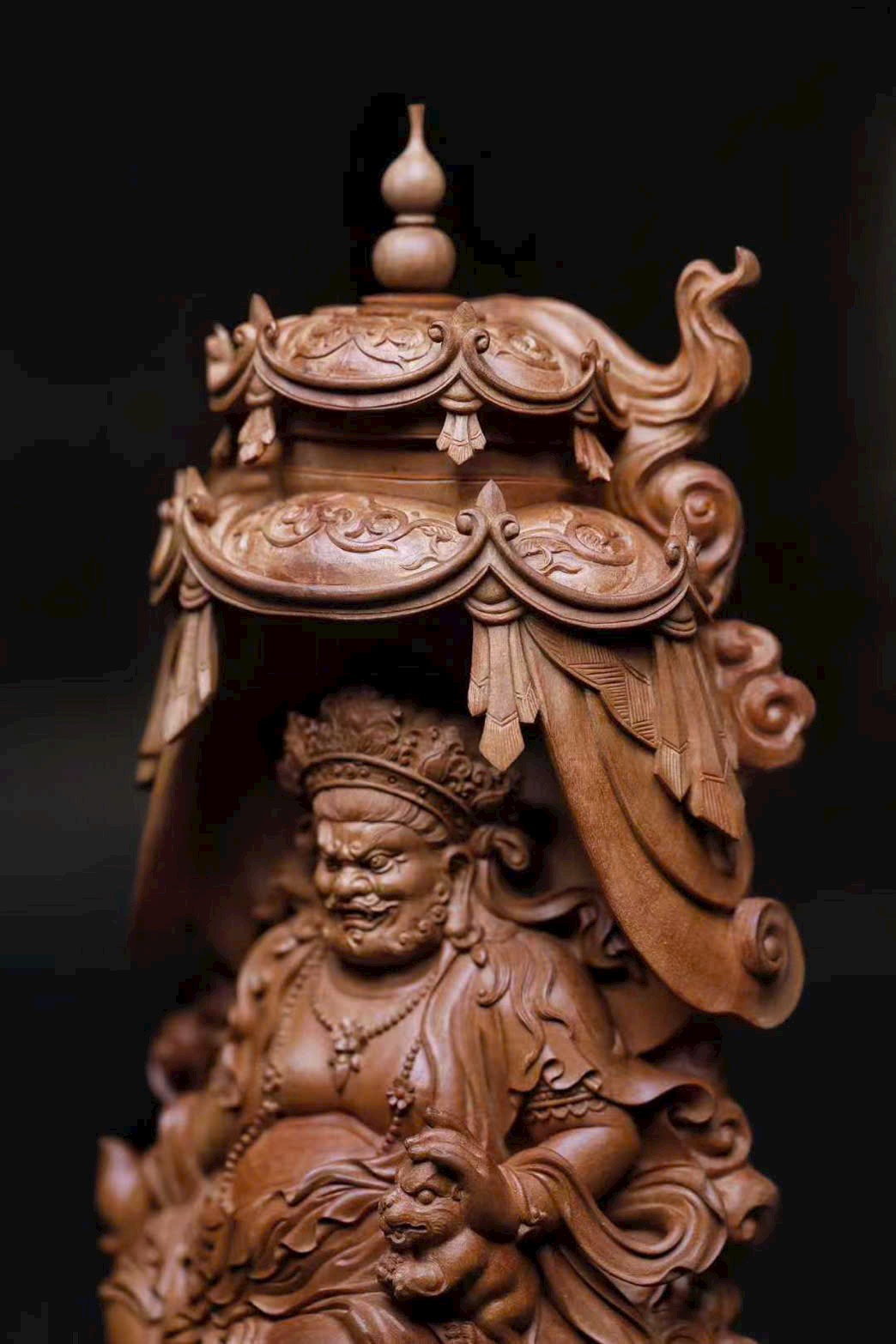 Chạm khắc từ gỗ đàn hương nguyên khối, pháp tướng uy nghi – tay cầm chuột nhả tiền & quả như ý, y phục bay lượn quanh đài sen. Mùi trầm dịu nhẹ, mang năng lượng chiêu tài – trưng bày bàn thờ, bàn làm việc đều cát lành.