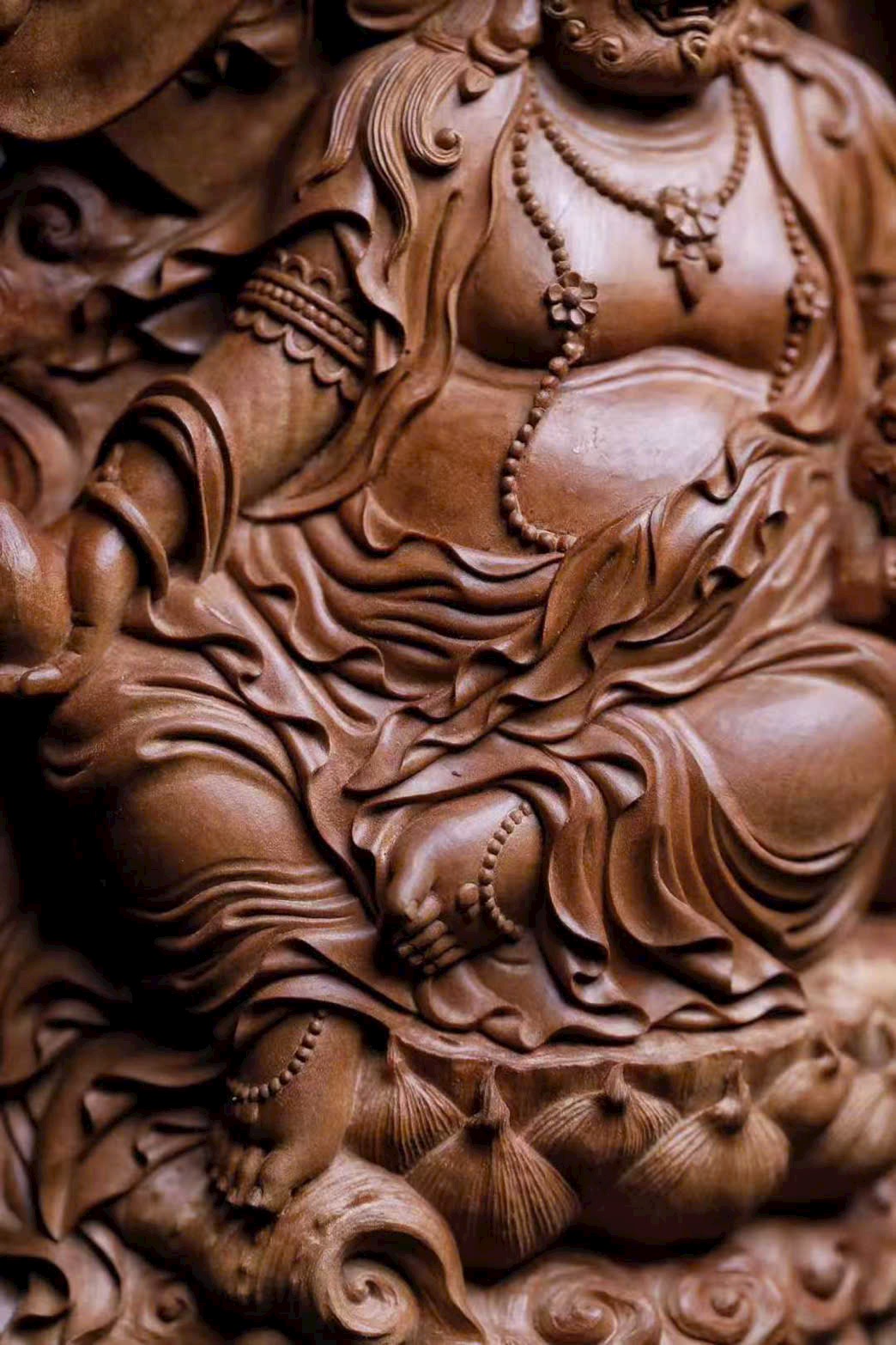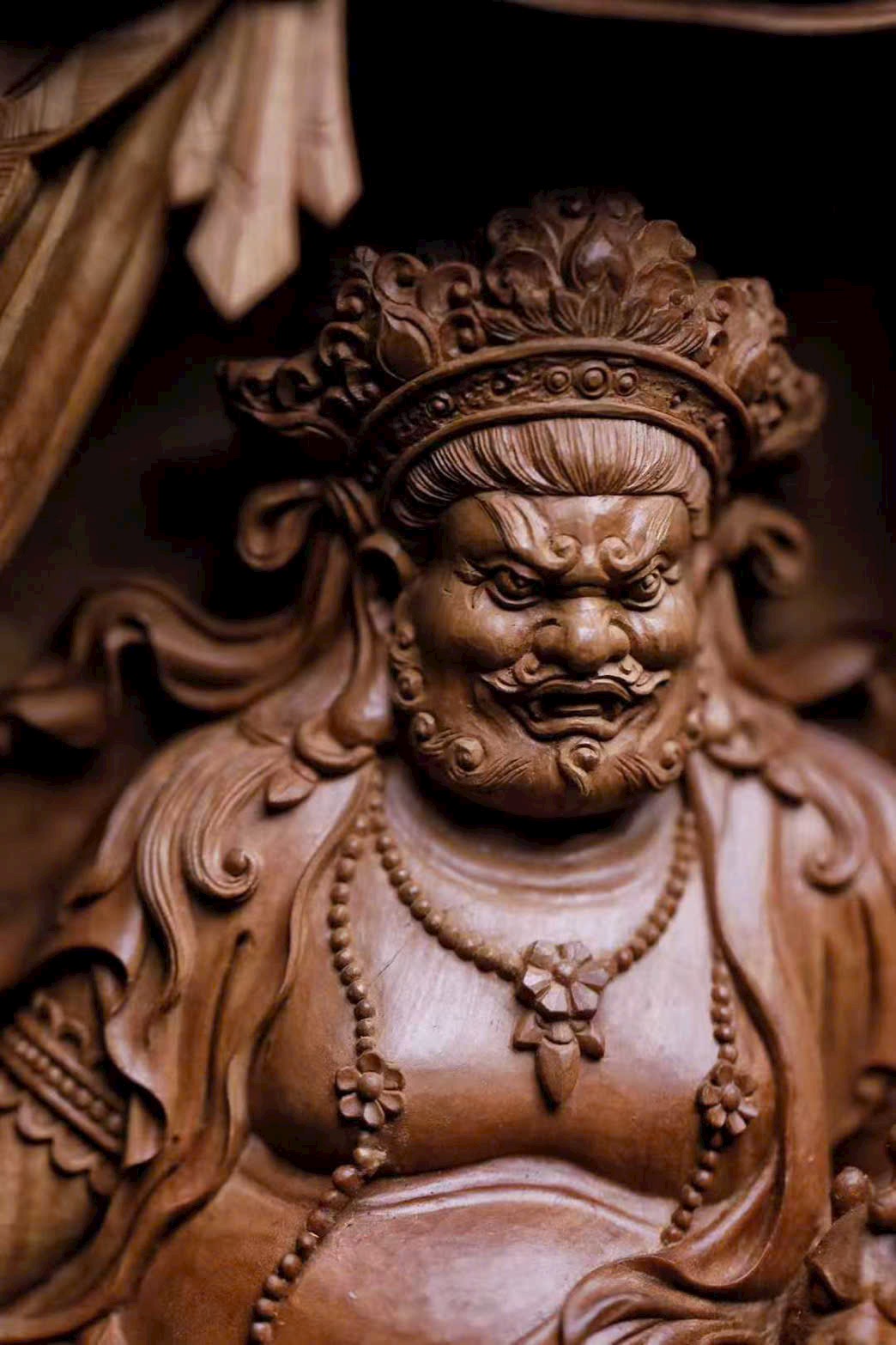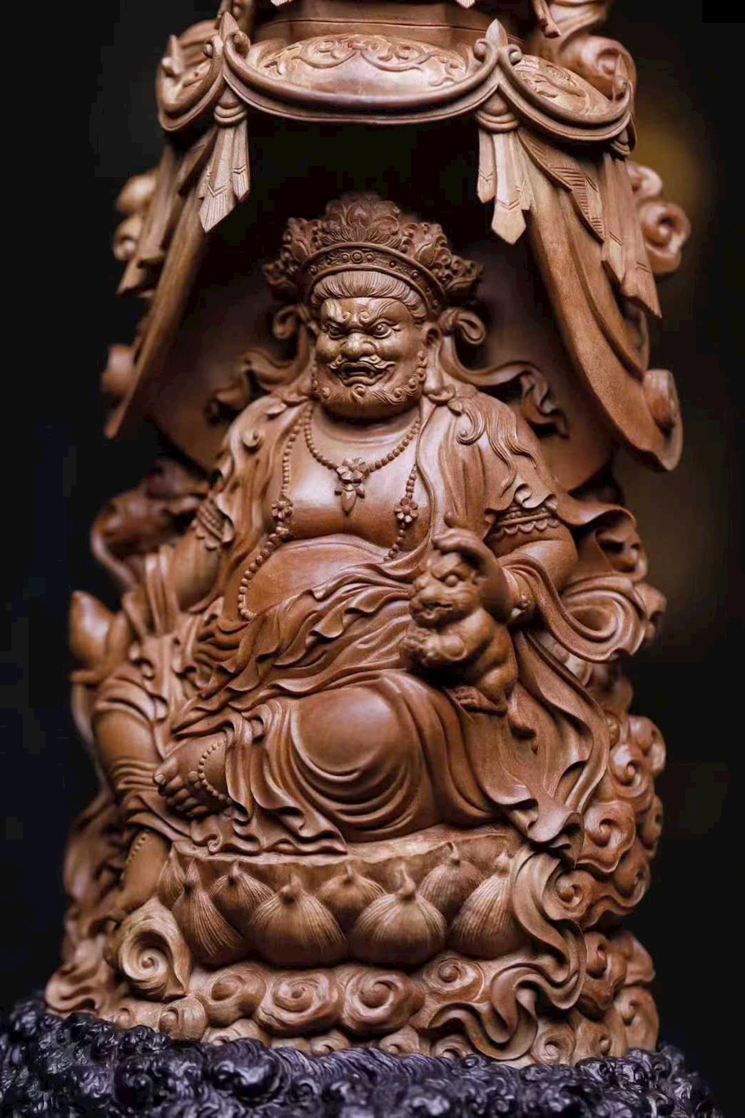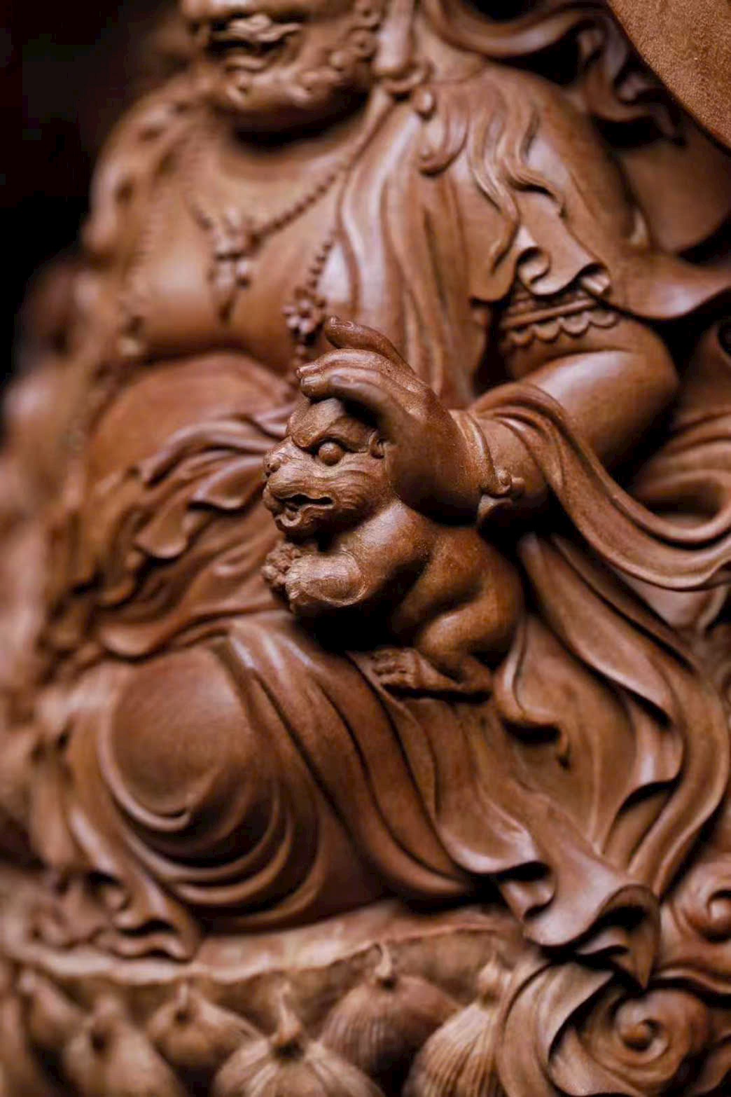 Chạm khắc từ gỗ đàn hương nguyên khối, pháp tướng uy nghi – tay cầm chuột nhả tiền & quả như ý, y phục bay lượn quanh đài sen. Mùi trầm dịu nhẹ, mang năng lượng chiêu tài – trưng bày bàn thờ, bàn làm việc đều cát lành.