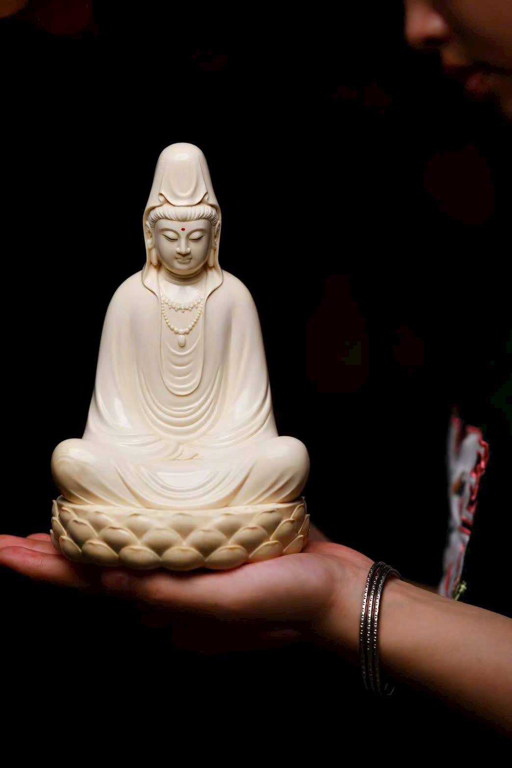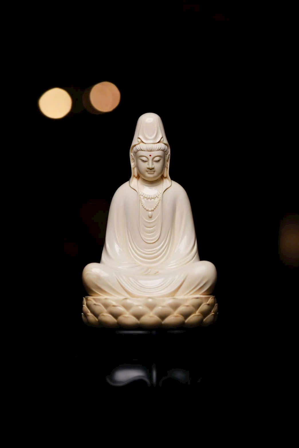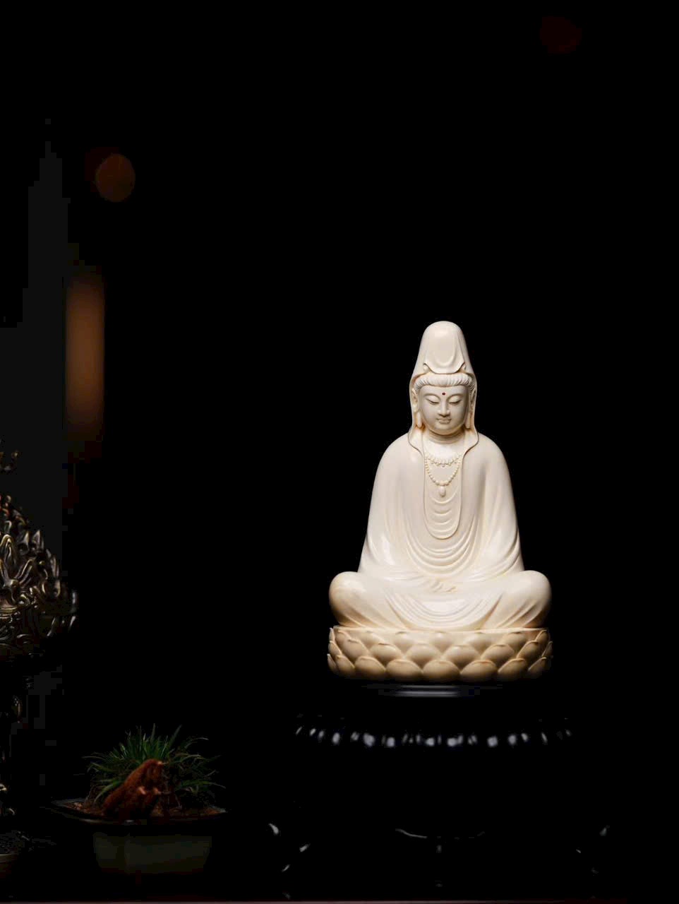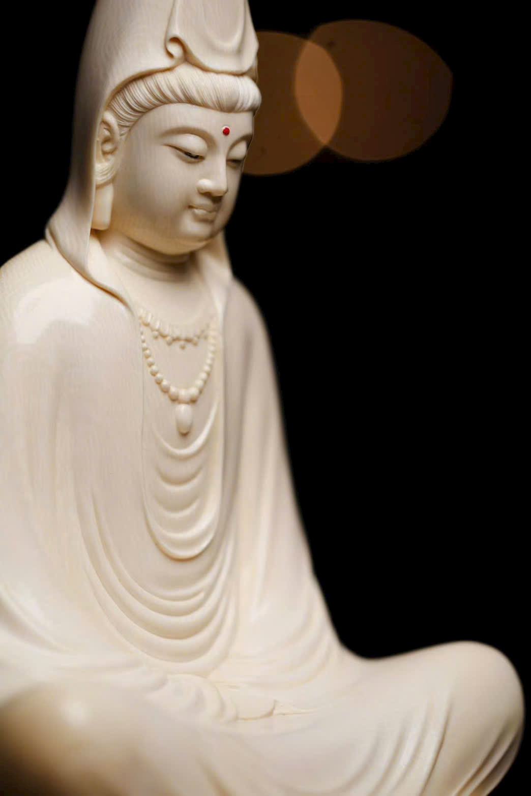 Ngà bóng như ngọc, chạm khắc toàn phẩm chuẩn chỉnh. Gương mặt hiền hòa, pháp tướng tự tại – thích hợp an trí bàn thờ, kệ thiền, mang lại cảm giác an yên tĩnh tại.