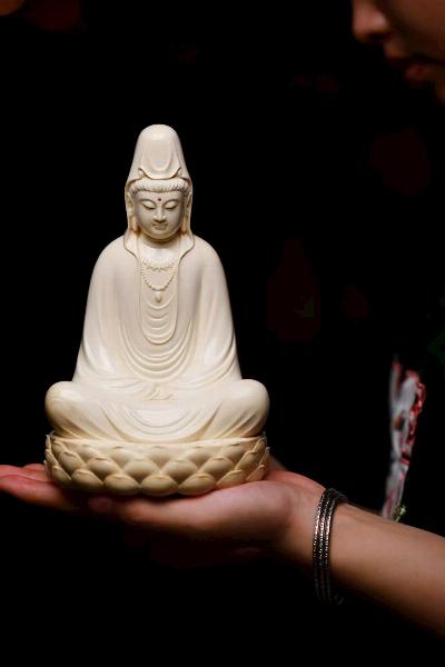 Ngà bóng như ngọc, chạm khắc toàn phẩm chuẩn chỉnh. Gương mặt hiền hòa, pháp tướng tự tại – thích hợp an trí bàn thờ, kệ thiền, mang lại cảm giác an yên tĩnh tại.