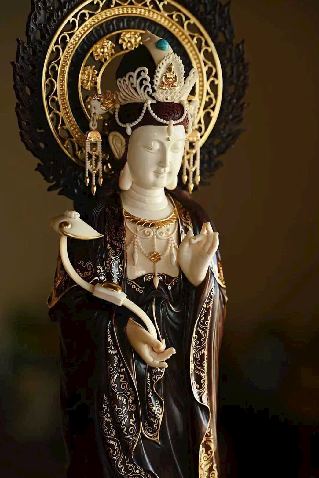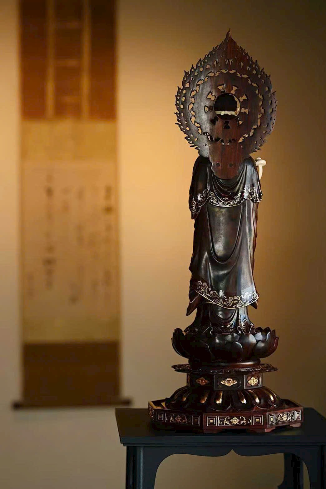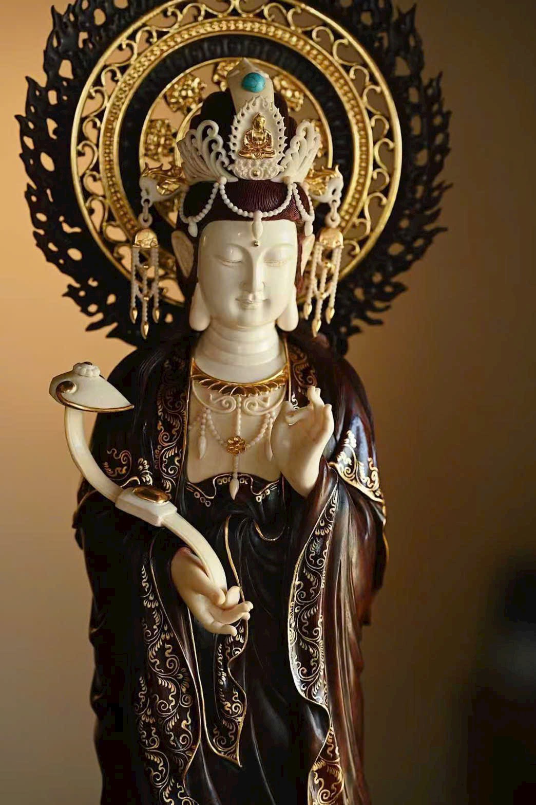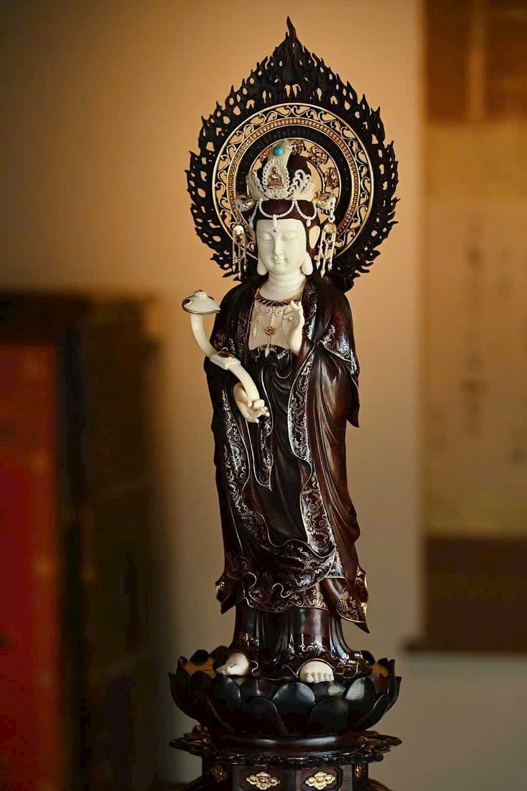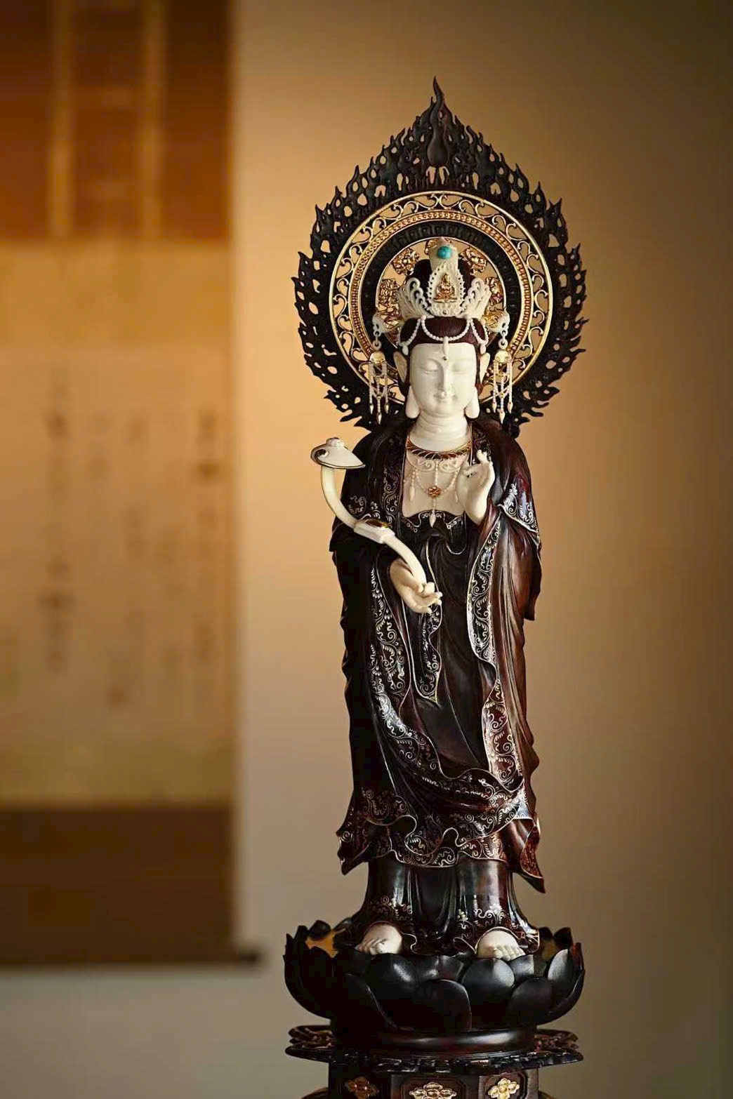 Quan Âm đứng trên đài sen, tay cầm Như Ý – dáng uyển chuyển, thần thái từ bi, chạm khắc tinh xảo, chi tiết mạ vàng tỉ mỉ, hào quang rực rỡ – tượng phẩm cao quý, trang nghiêm.