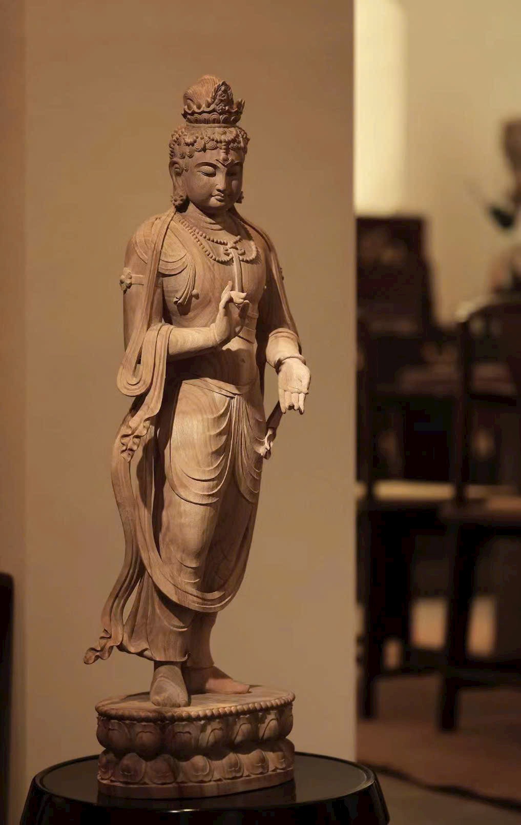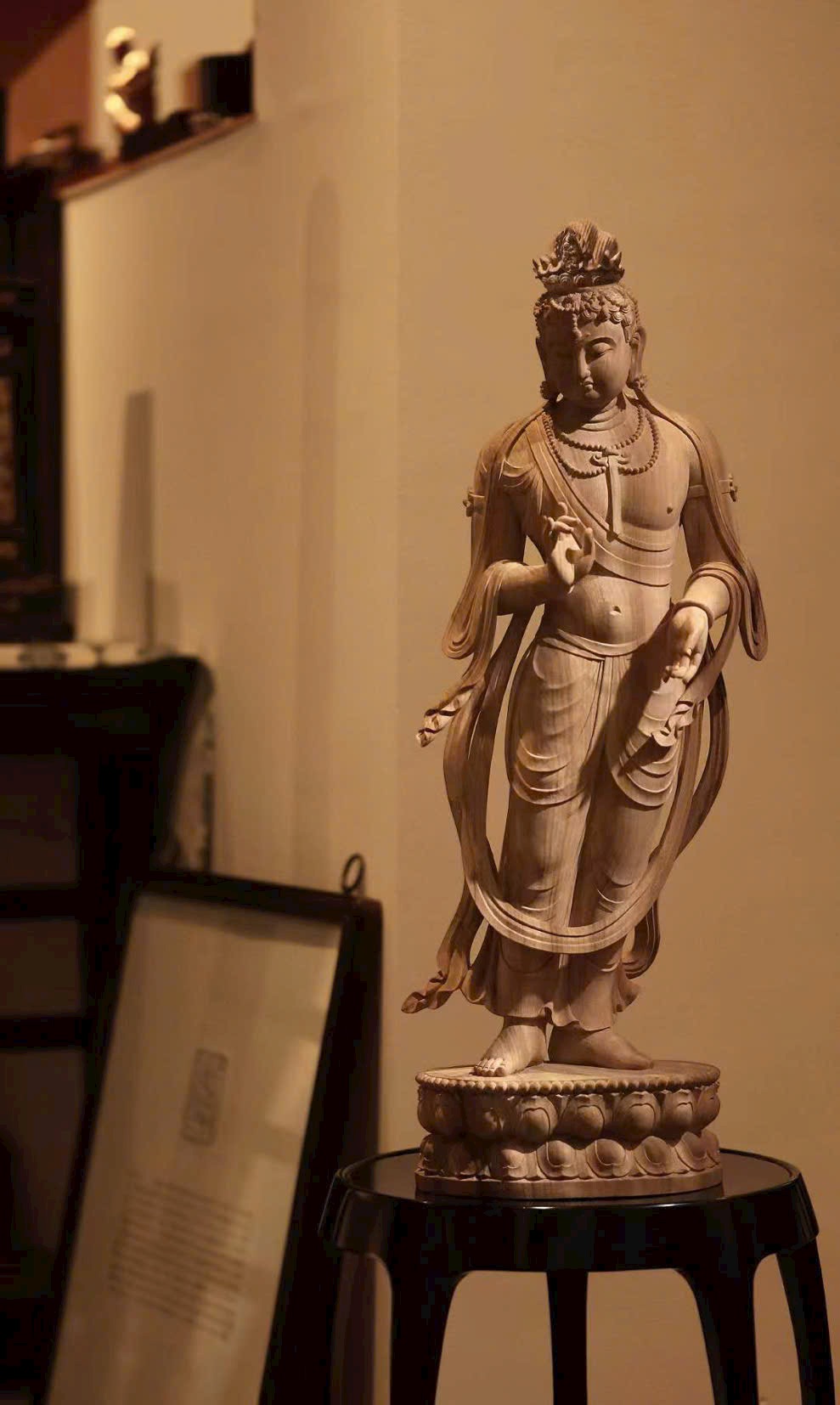 Chọn gỗ long não trăm năm làm liệu, chạm khắc tinh tế; bảo y của Quan Âm mềm rủ bay nhẹ, dáng vẻ uyển chuyển, thân thái khoan hòa tự nhiên.