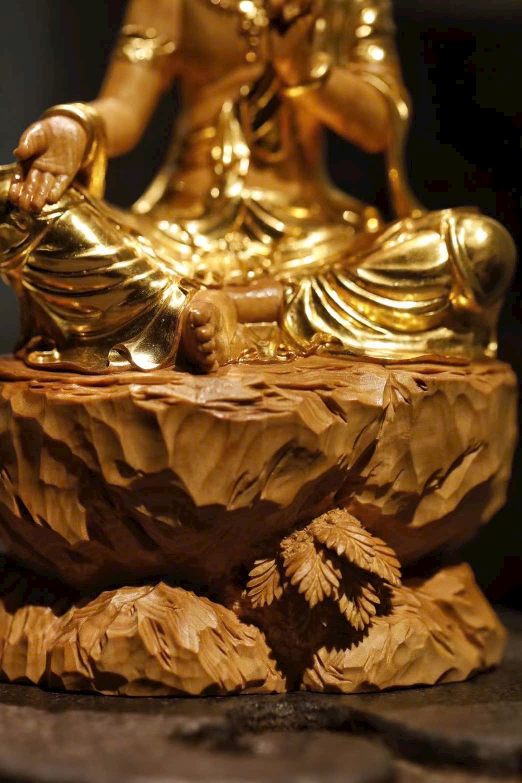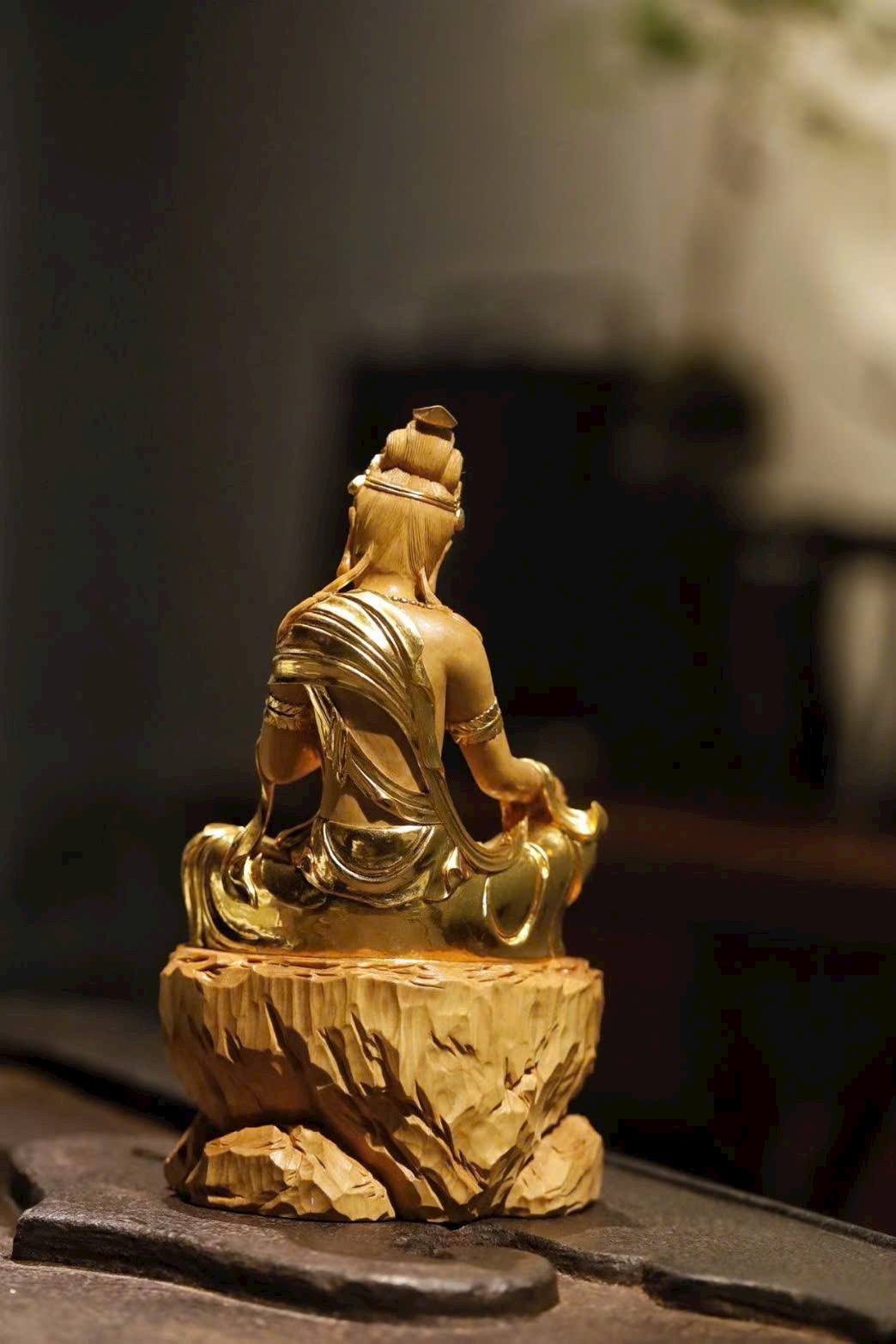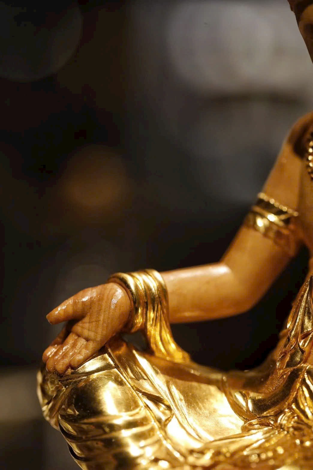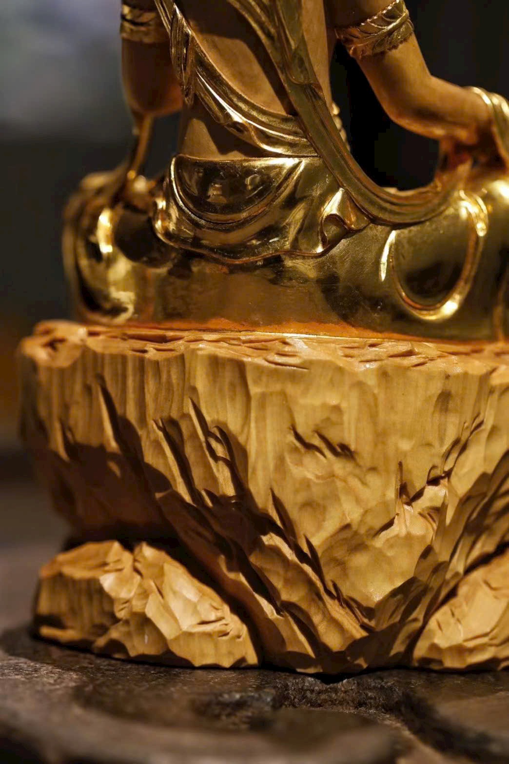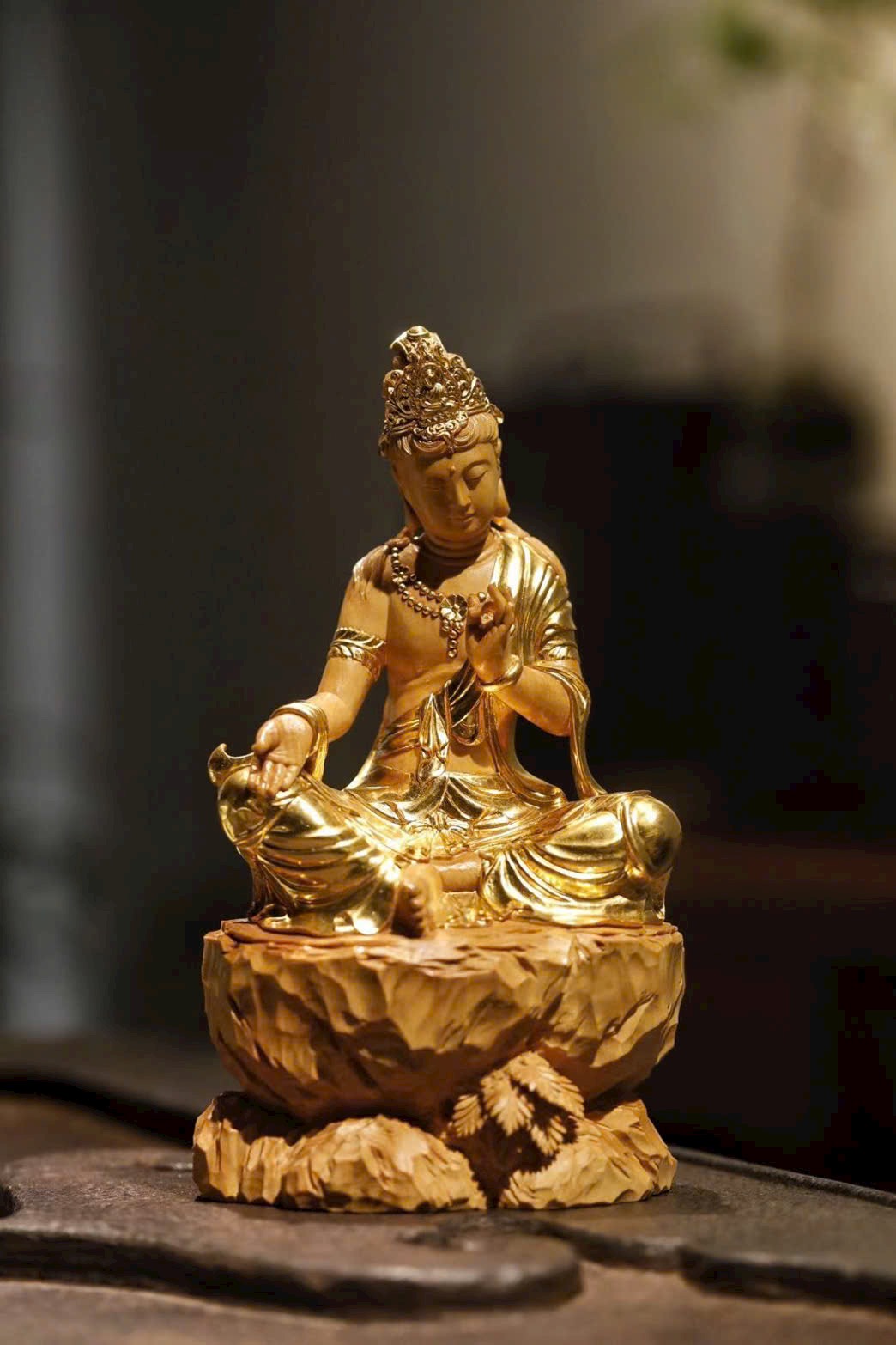 Tượng Quan Âm Tự Tại được tạc từ gỗ hoàng dương, phủ vàng tinh xảo. Từng đường nét chạm khắc bằng dao thô mộc mà tinh tế, thể hiện dung nhan hiền hòa, tư thế khoan thai, y phục uyển chuyển tự nhiên – toát lên vẻ từ bi và thanh tịnh.
