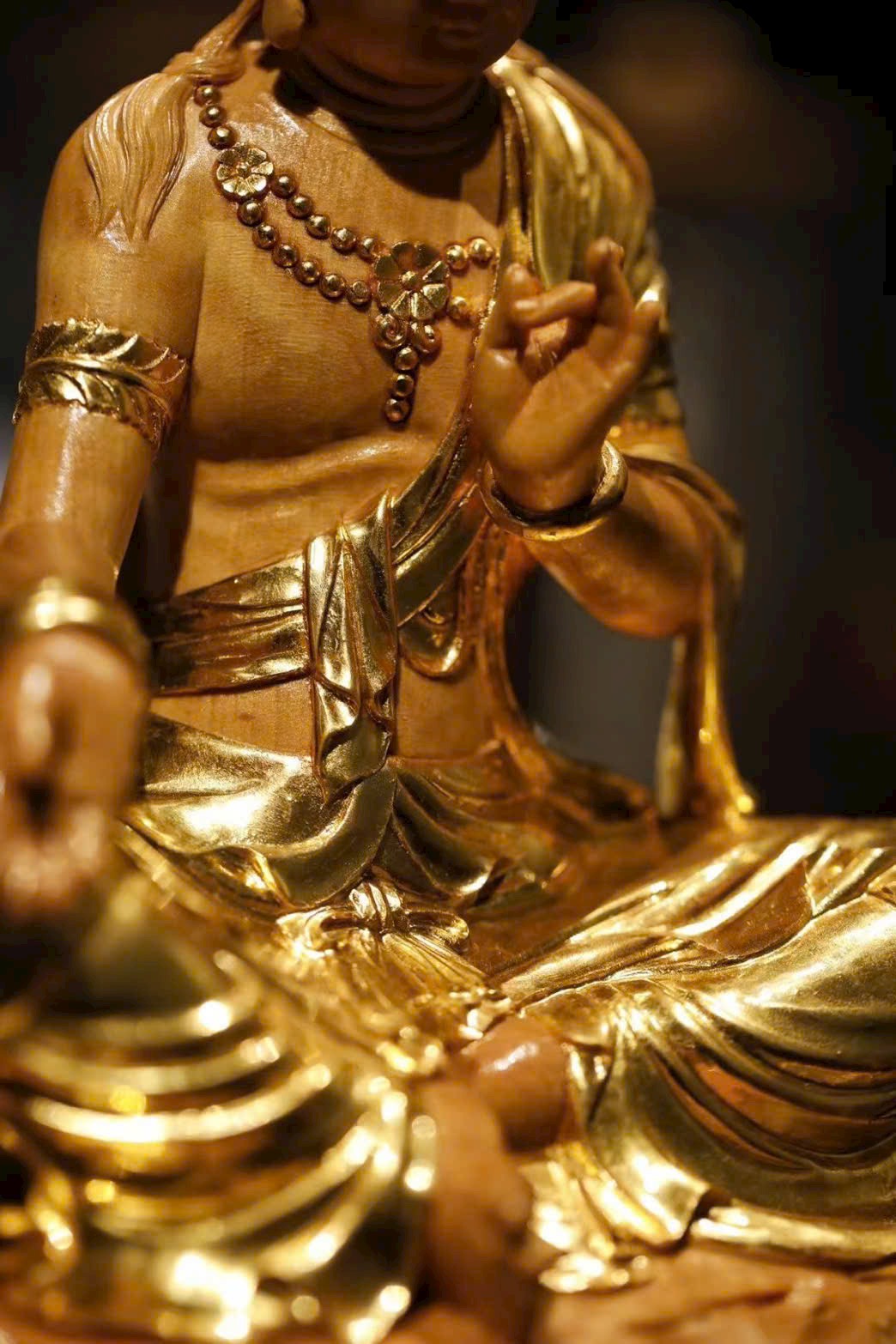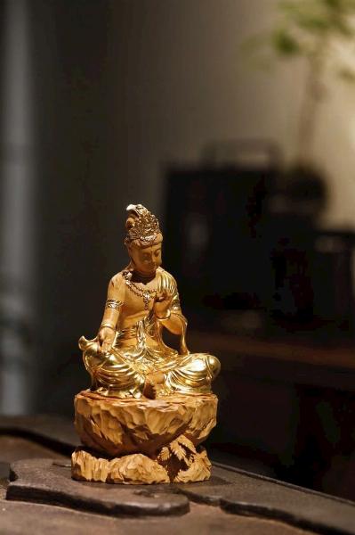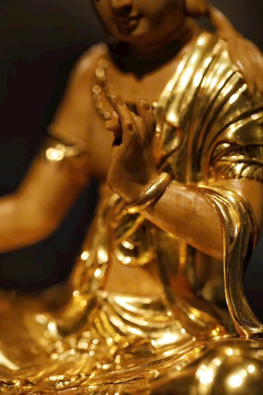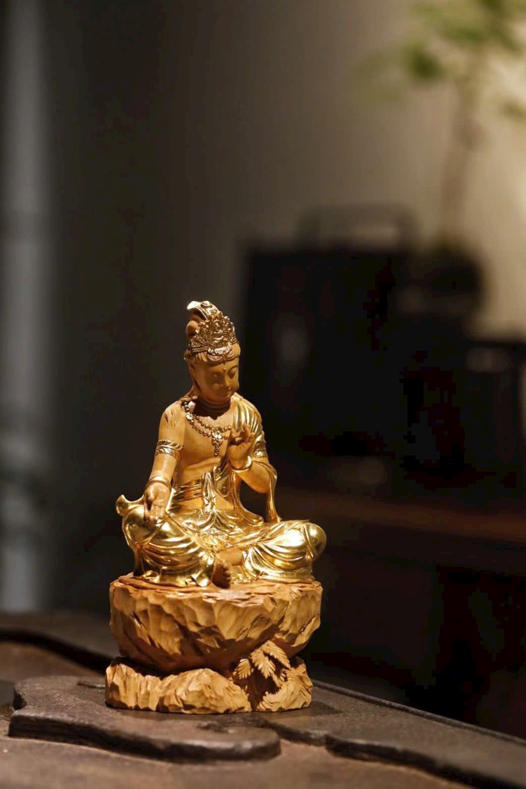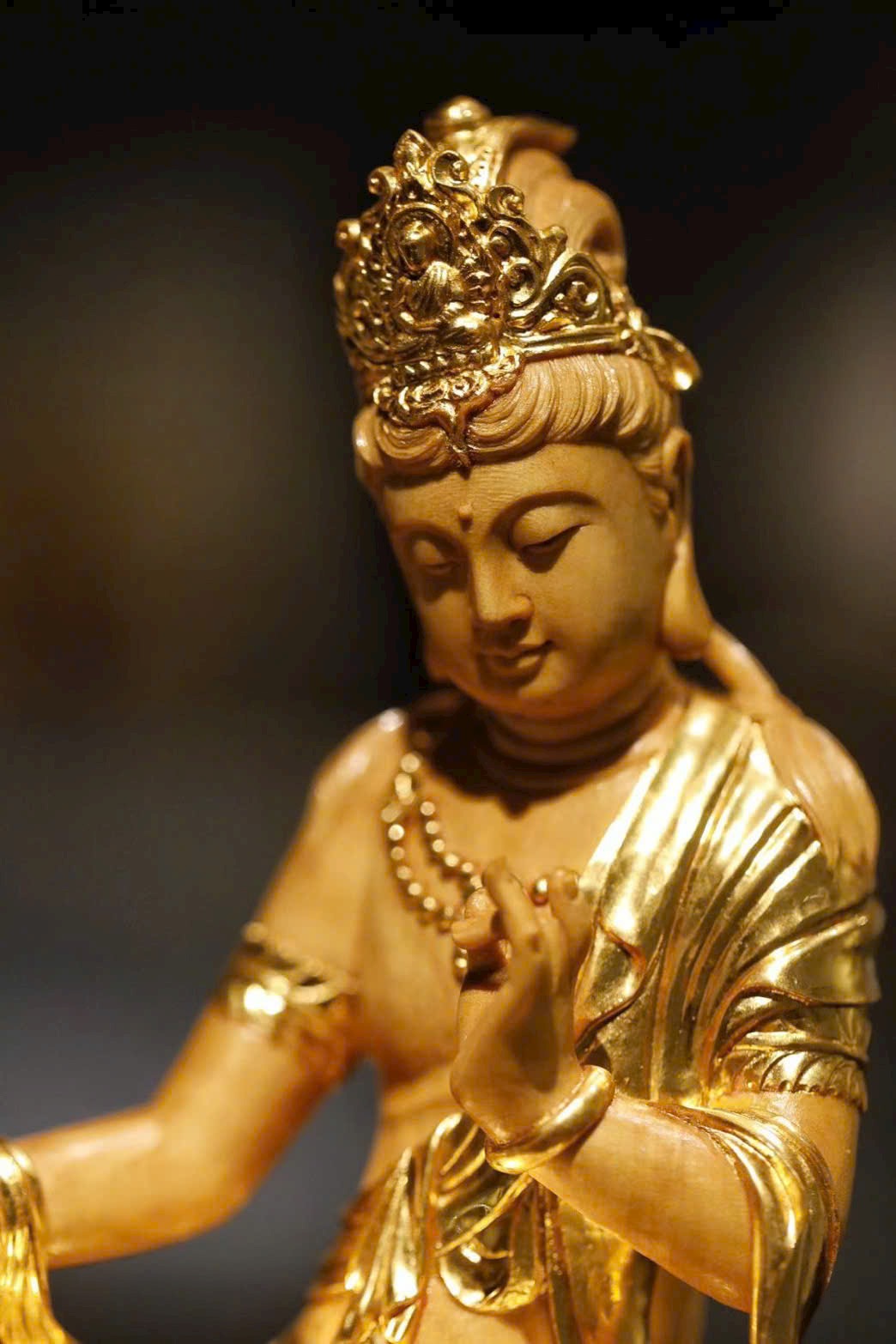 Tượng Quan Âm Tự Tại được tạc từ gỗ hoàng dương, phủ vàng tinh xảo. Từng đường nét chạm khắc bằng dao thô mộc mà tinh tế, thể hiện dung nhan hiền hòa, tư thế khoan thai, y phục uyển chuyển tự nhiên – toát lên vẻ từ bi và thanh tịnh.