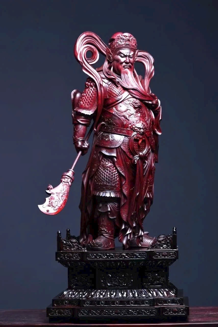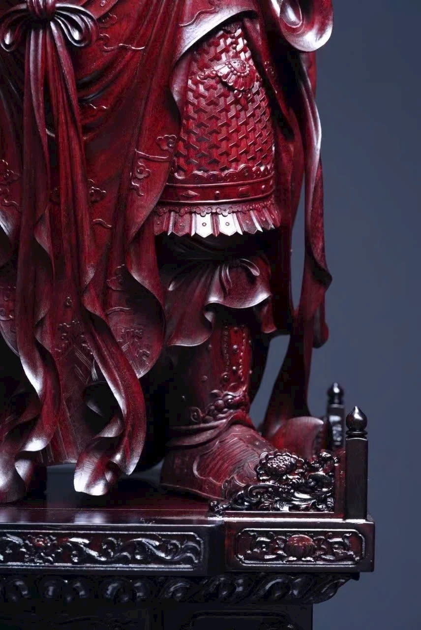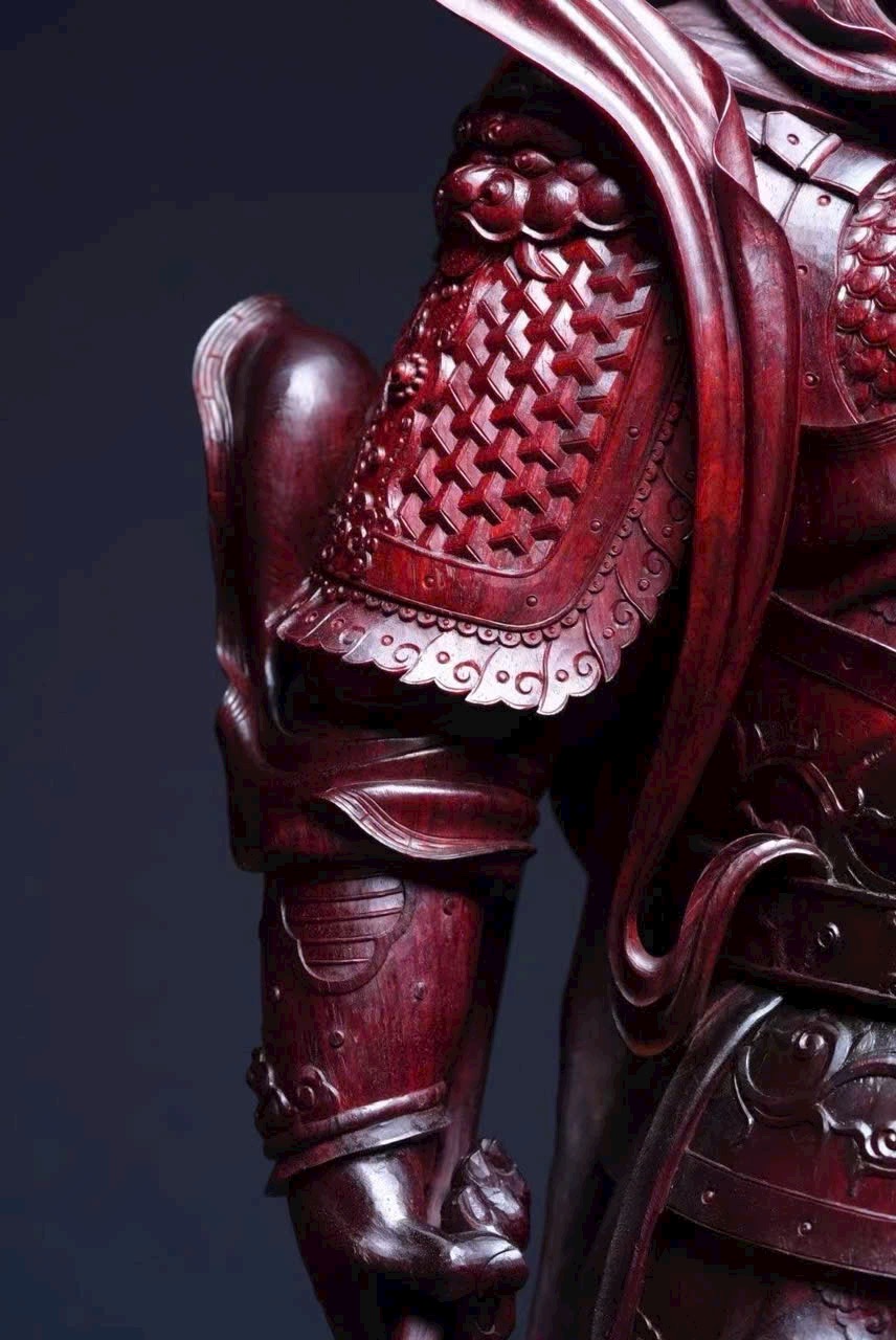 Chạm khắc nguyên khối từ gỗ tử đàn cao cấp, giáp trụ tinh xảo đến từng chi tiết: thú vai dữ tợn, áo giáp móc nối sinh động, vảy giáp xếp lớp như thật. Gương mặt đỏ như chà là, mắt phượng khép hờ sắc bén, râu dài bay nhẹ, thần thái uy nghi không giận mà vẫn nghiêm. Ánh gỗ trầm ấm kết hợp khí chất anh hùng, từng nét dao đều sắc lạnh đầy khí phách.