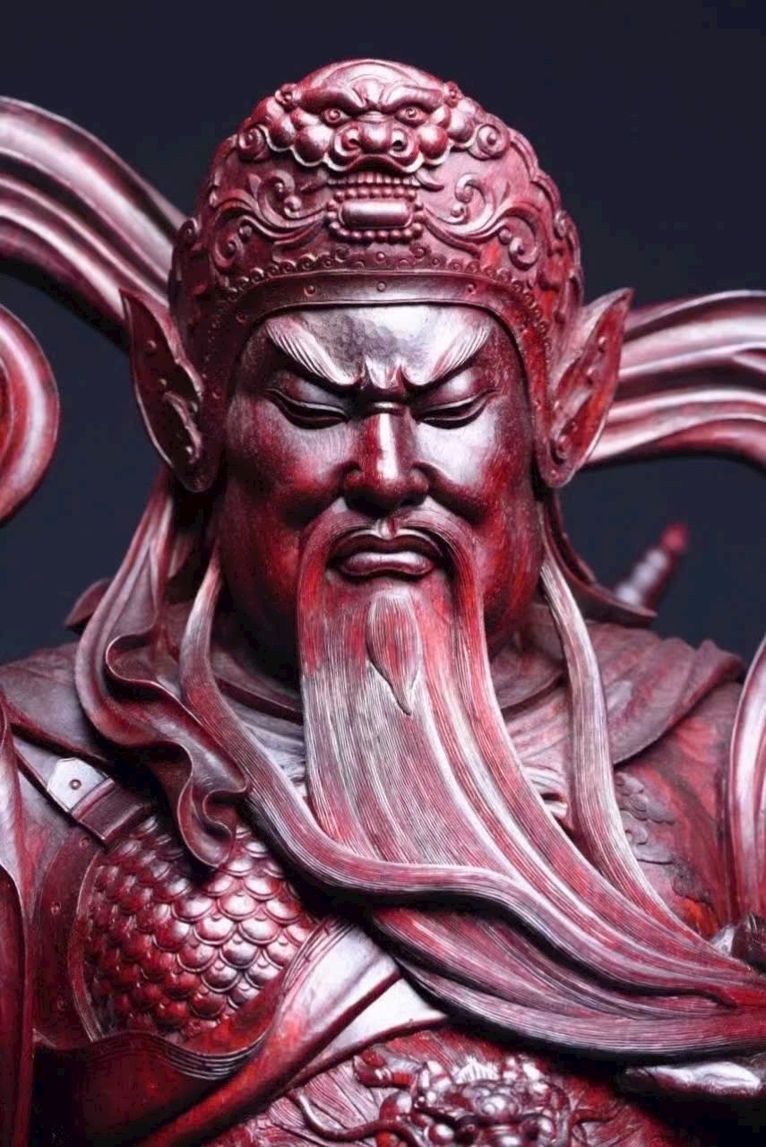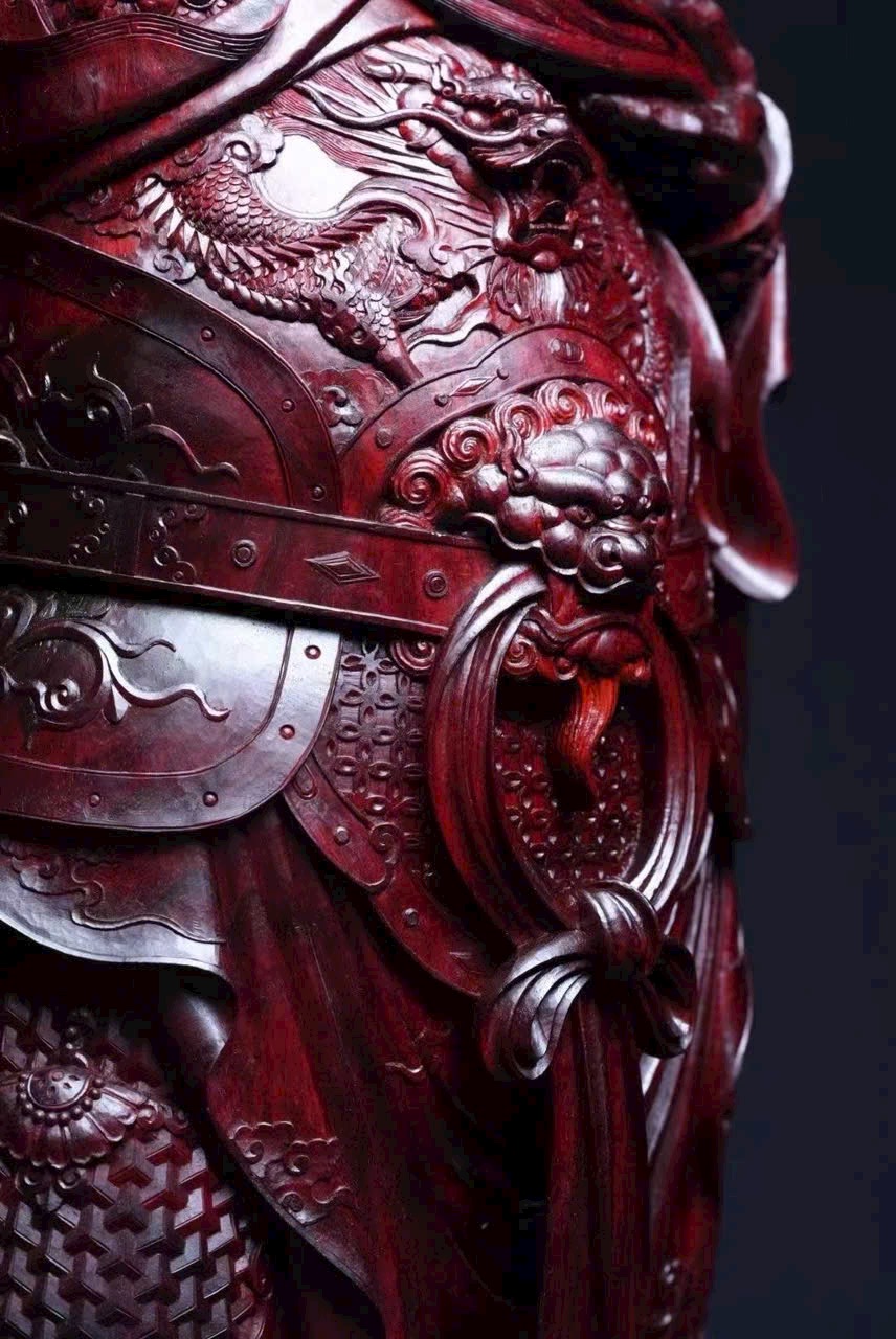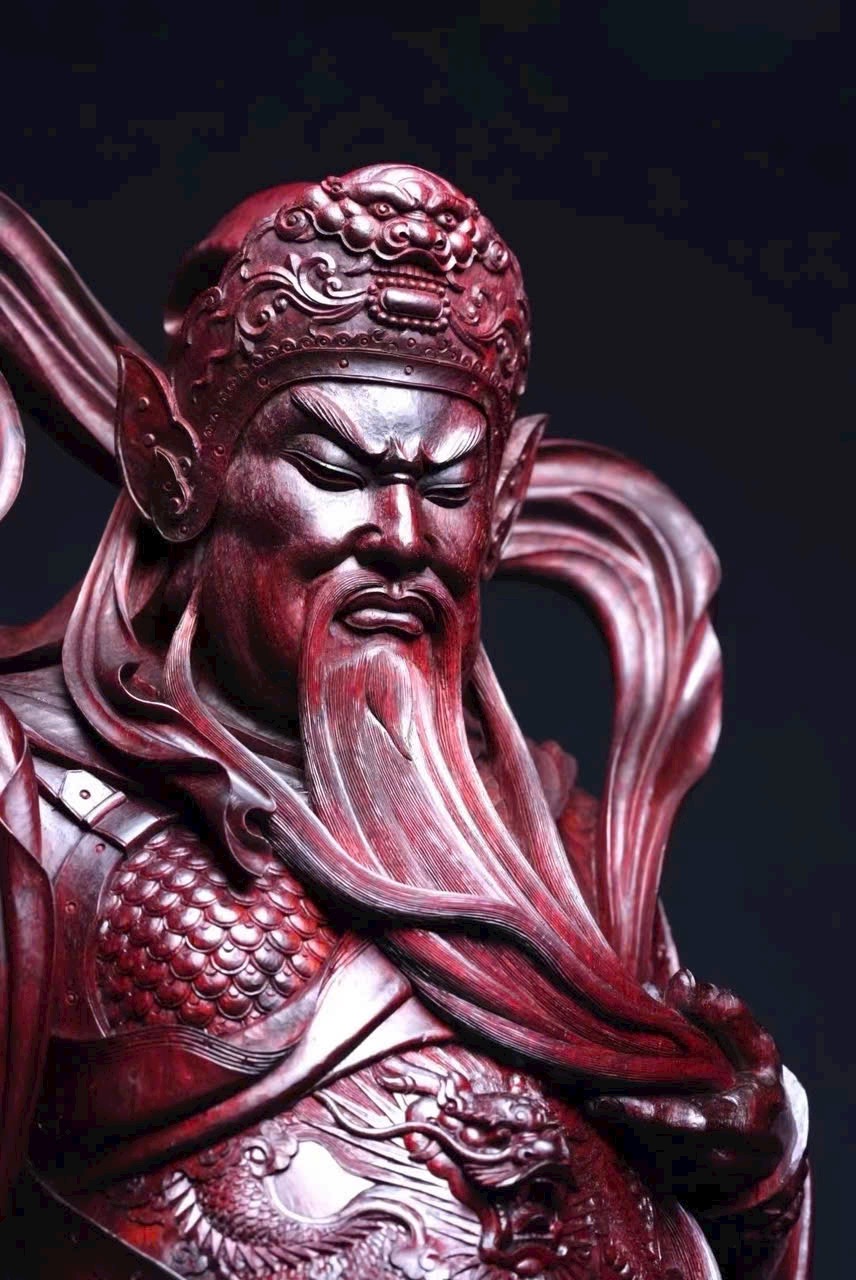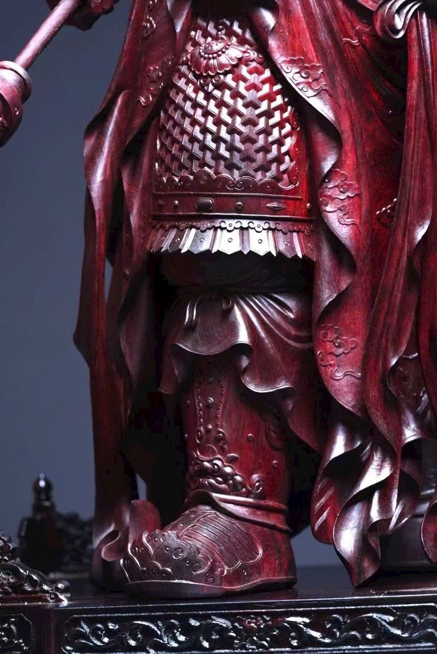 Chạm khắc nguyên khối từ gỗ tử đàn cao cấp, giáp trụ tinh xảo đến từng chi tiết: thú vai dữ tợn, áo giáp móc nối sinh động, vảy giáp xếp lớp như thật. Gương mặt đỏ như chà là, mắt phượng khép hờ sắc bén, râu dài bay nhẹ, thần thái uy nghi không giận mà vẫn nghiêm. Ánh gỗ trầm ấm kết hợp khí chất anh hùng, từng nét dao đều sắc lạnh đầy khí phách.