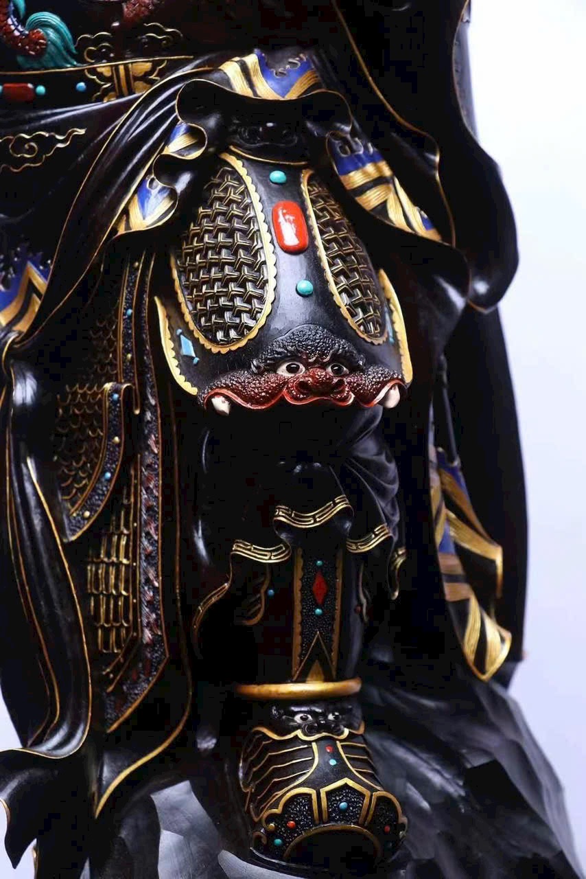 Áo giáp rồng, phong thái oai nghiêm; đứng trên đá tùng vững chãi, tượng trưng cho trung dũng trấn trạch, sự nghiệp bền vững