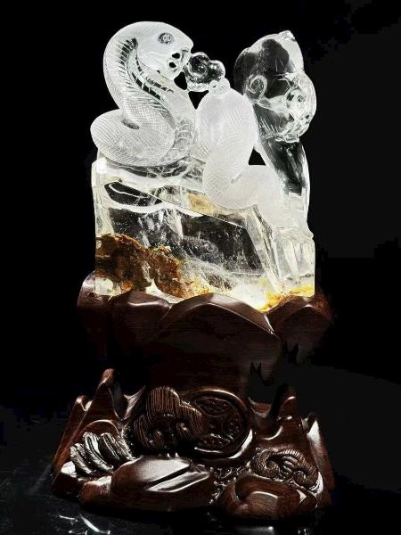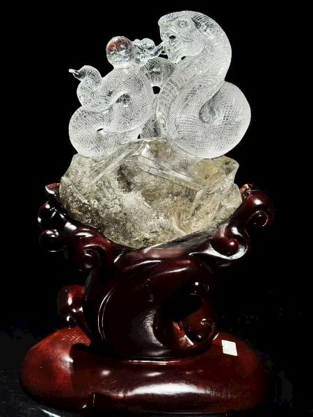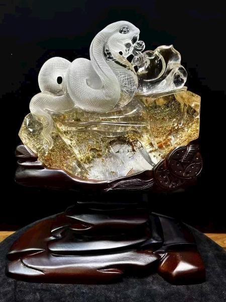 Tượng Rắn (tuổi Tỵ) chạm khắc từ thạch anh ưu linh màu + thạch anh keo đỏ thiên nhiên, tinh thể sạch, trong sáng, điêu khắc tinh xảo, sống động và rất có “linh khí”. Hàng hiếm đẹp, mang ý nghĩa bình an vô sự, cải thiện quan hệ – tăng nhân duyên, duyên làm ăn, đồng thời trấn trạch – trừ tà, thích hợp làm bày phong thủy.