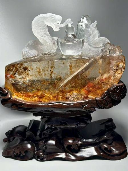 Tượng Rắn (tuổi Tỵ) chạm khắc từ thạch anh ưu linh màu + thạch anh keo đỏ thiên nhiên, tinh thể sạch, trong sáng, điêu khắc tinh xảo, sống động và rất có “linh khí”. Hàng hiếm đẹp, mang ý nghĩa bình an vô sự, cải thiện quan hệ – tăng nhân duyên, duyên làm ăn, đồng thời trấn trạch – trừ tà, thích hợp làm bày phong thủy.