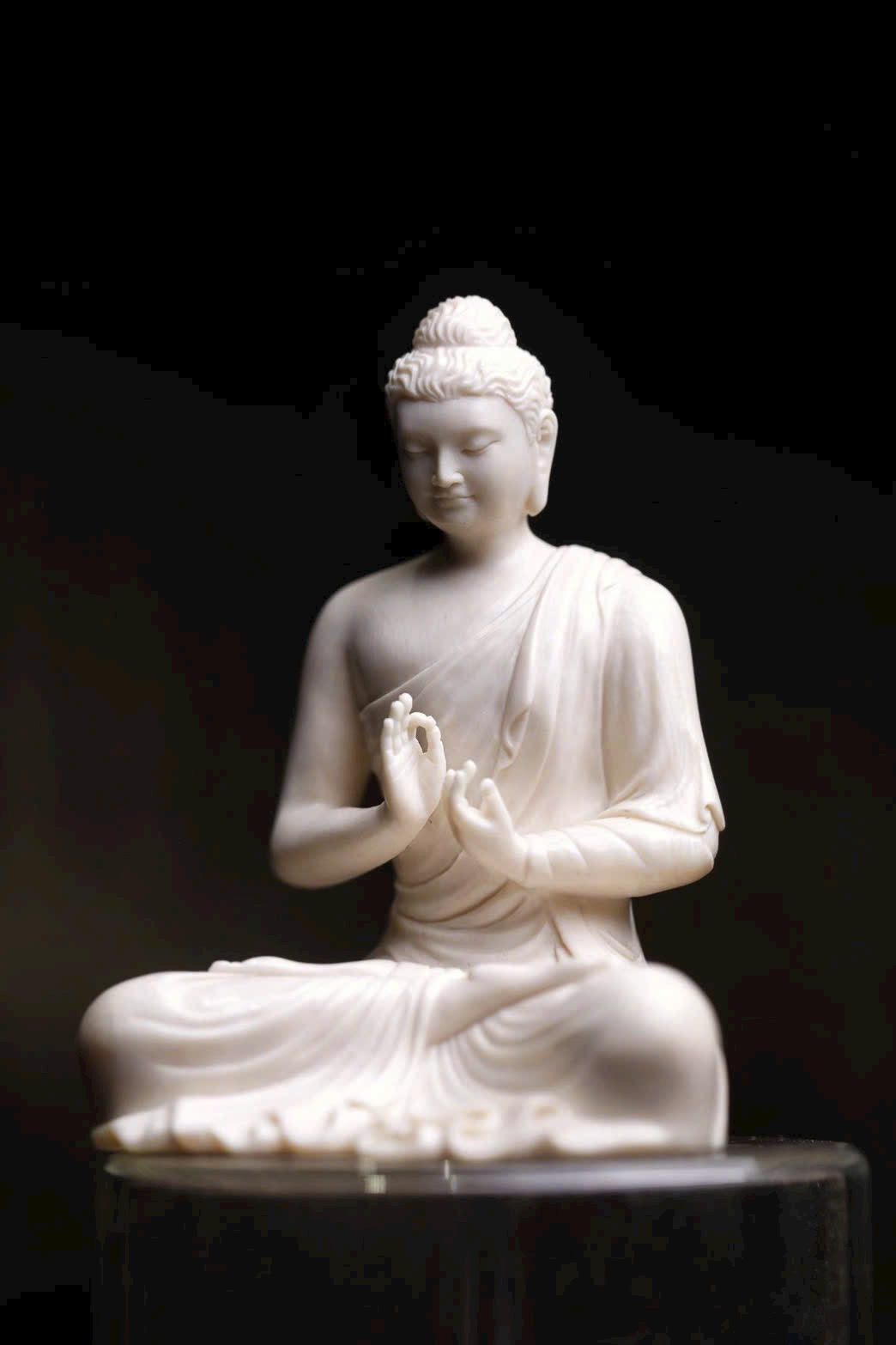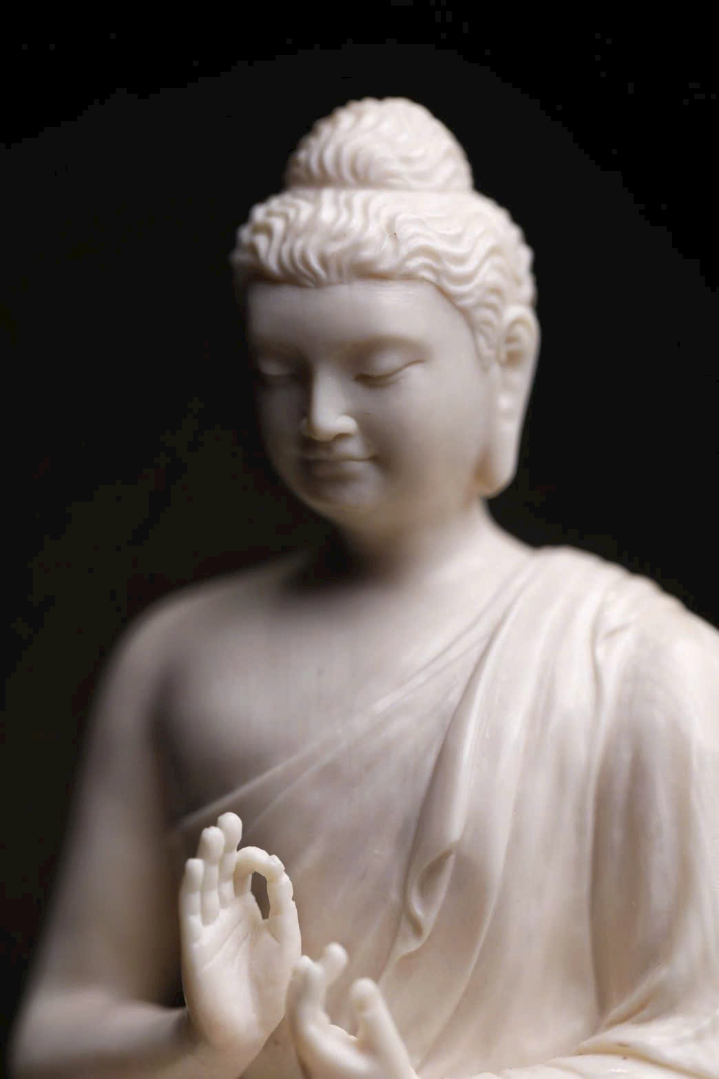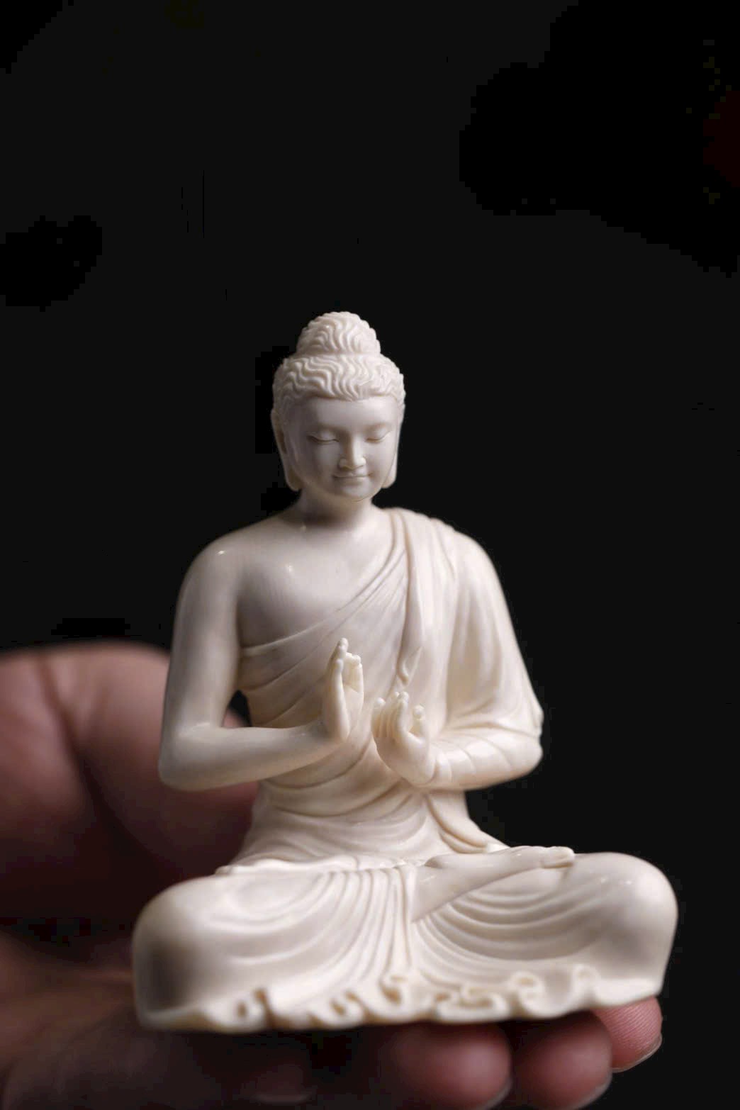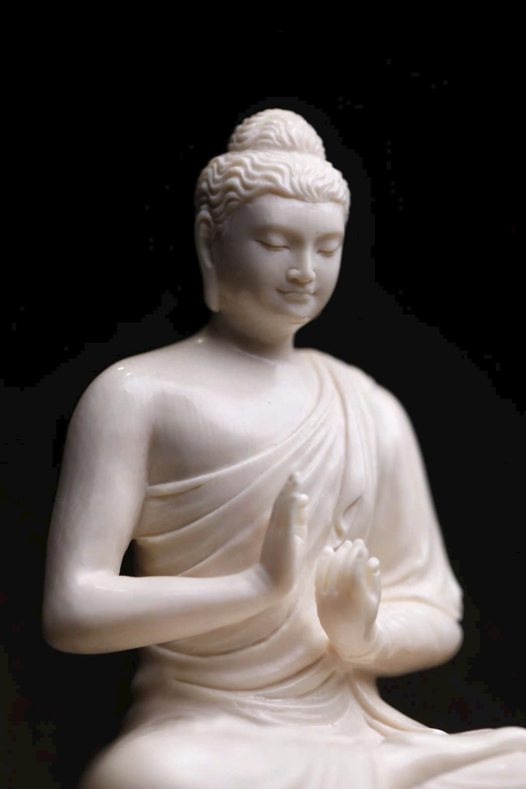 N.gà ma mút có chất ấm mịn như mỡ đông, được chạm khắc thành tôn tượng Thế Tôn truyền pháp. Khuôn mặt đầy đặn, từ bi; búi tóc xoắn ốc khắc tinh tế; hai tay kết ấn truyền pháp; y cà sa cổ chéo, nếp áo buông tự nhiên, ôm sát thân đầy linh động, trọn vẹn thể hiện vẻ trang nghiêm và thần thánh của Đức Phật khi truyền pháp.