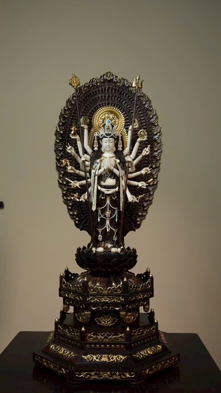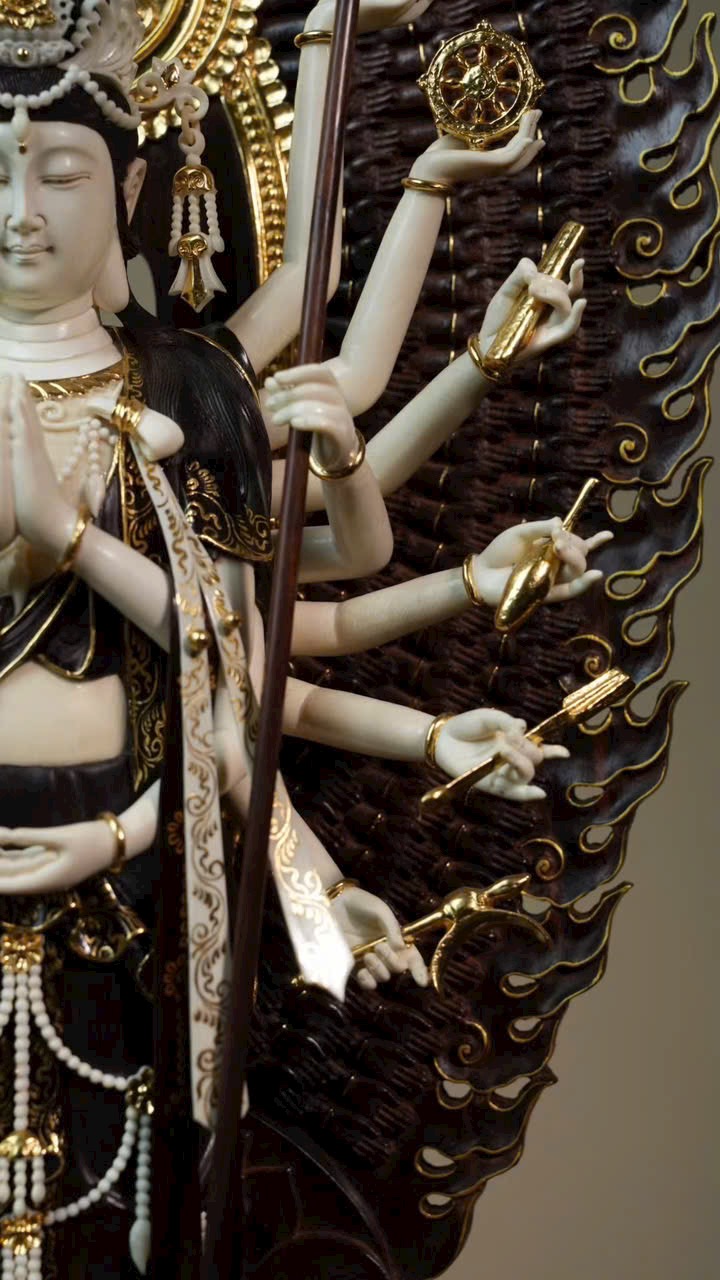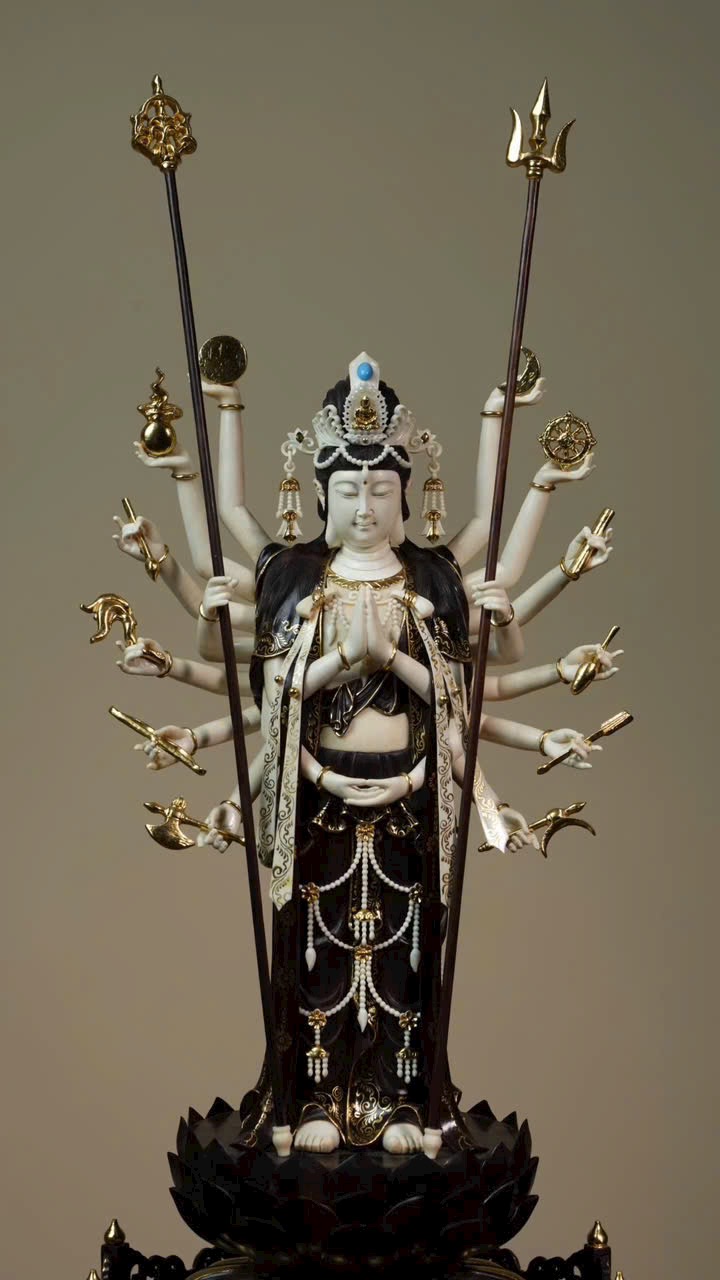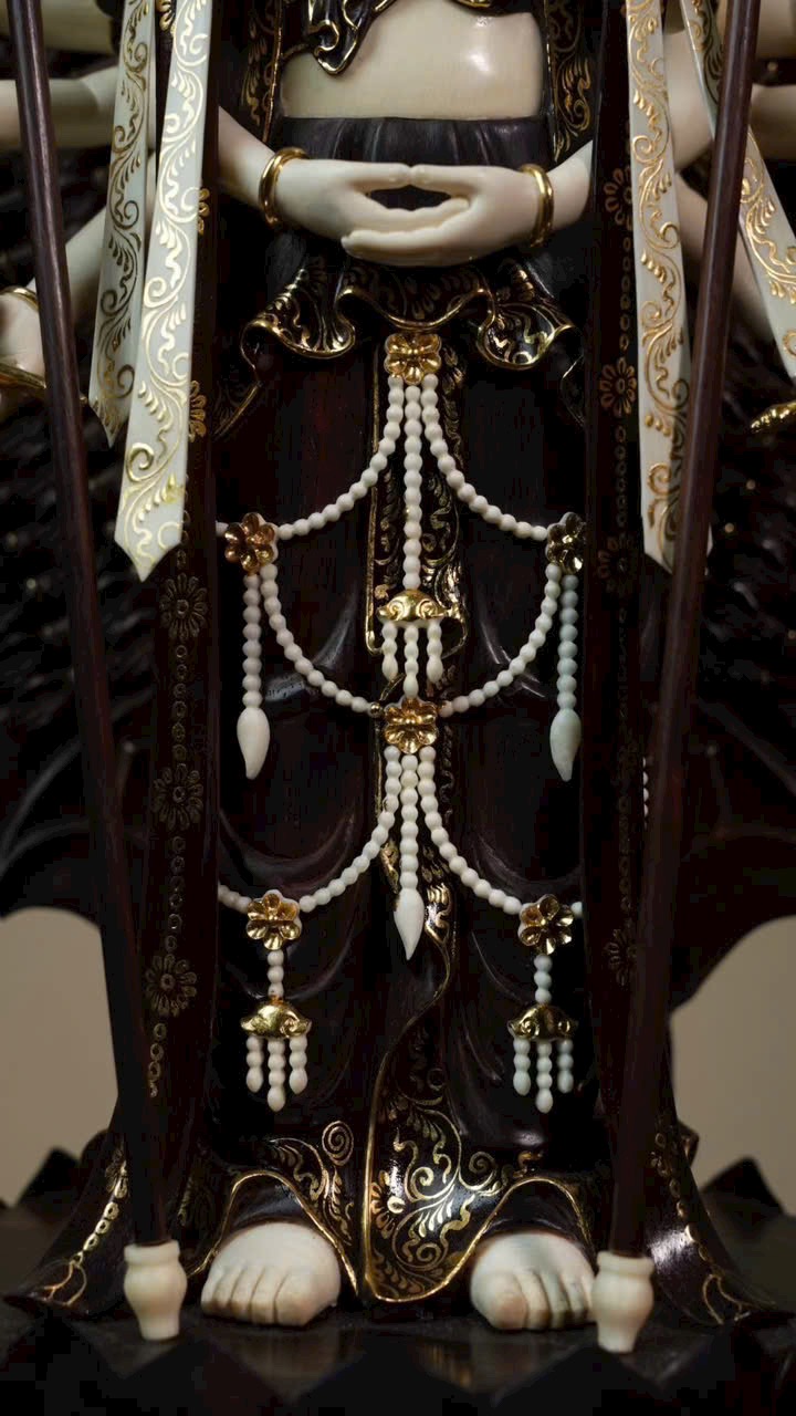 Tượng Thiên Thủ Quan Âm với phần y phục bằng gỗ tử đàn tiểu diệp, phần da thịt chế tác từ n.gà voi ma mút. Thân dưới mặc khố, thân trên hiện ngàn tay, đeo chuỗi anh lạc, tay mang dải lụa bay, đôi mắt khép hờ nhìn xuống, tóc búi cao vút. Tác phẩm thể hiện trình độ chế tác bậc thầy, khéo léo tinh xảo!
