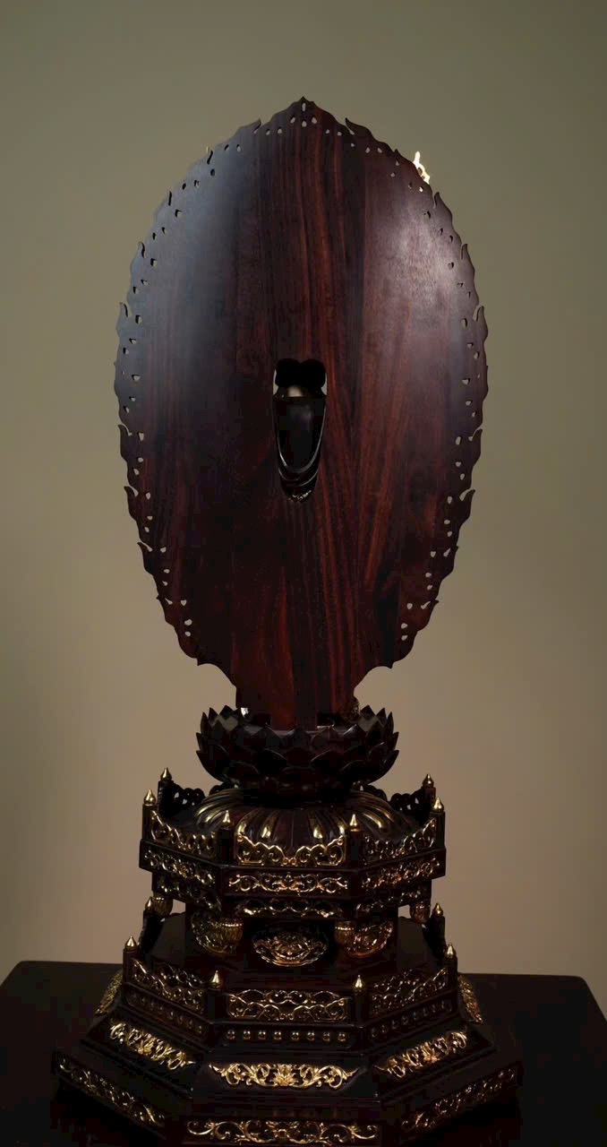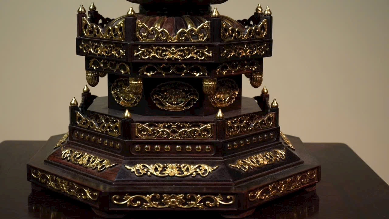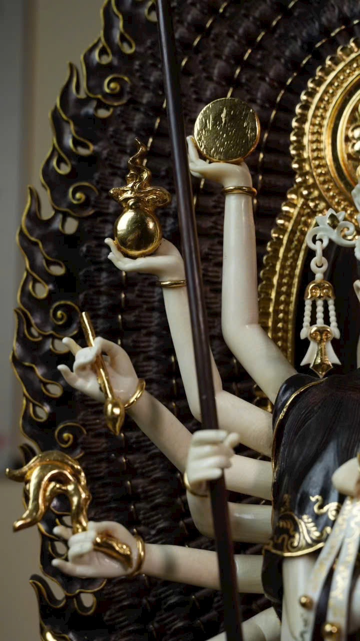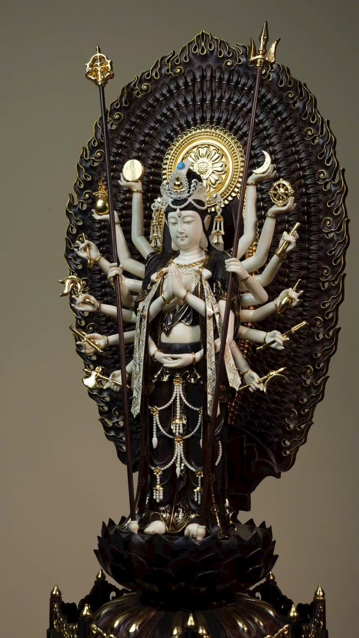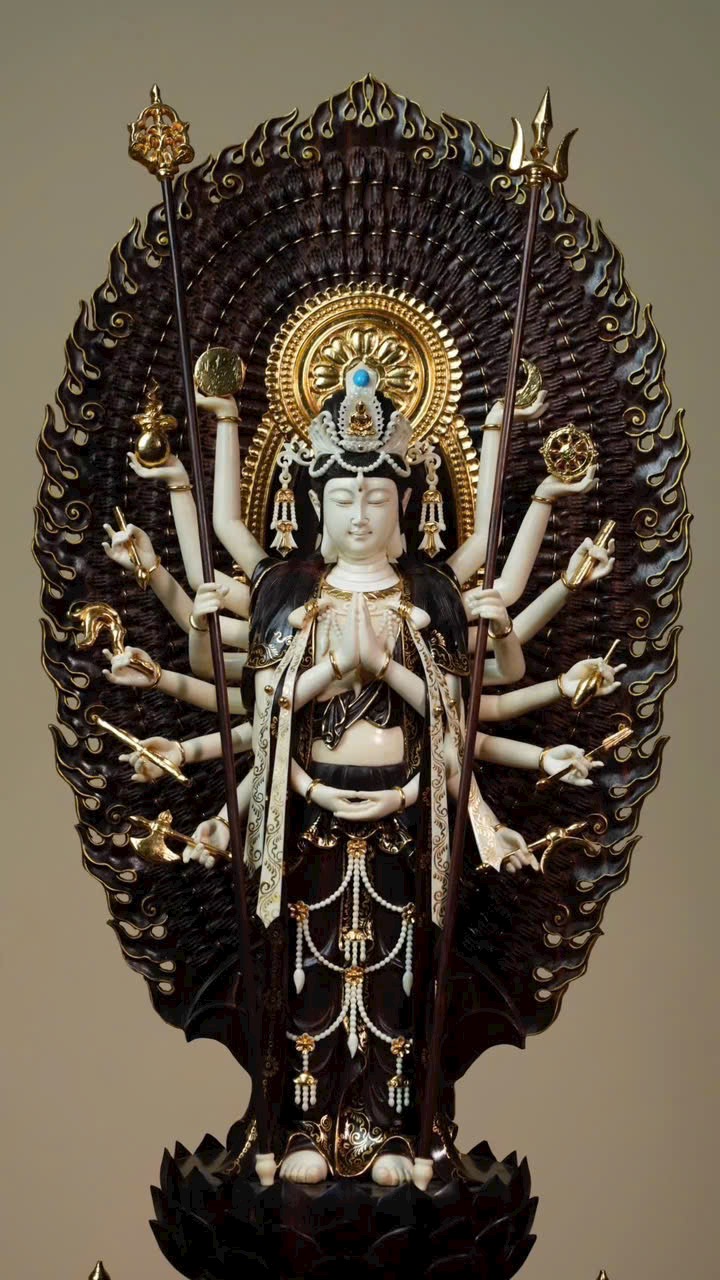 Tượng Thiên Thủ Quan Âm với phần y phục bằng gỗ tử đàn tiểu diệp, phần da thịt chế tác từ n.gà voi ma mút. Thân dưới mặc khố, thân trên hiện ngàn tay, đeo chuỗi anh lạc, tay mang dải lụa bay, đôi mắt khép hờ nhìn xuống, tóc búi cao vút. Tác phẩm thể hiện trình độ chế tác bậc thầy, khéo léo tinh xảo!