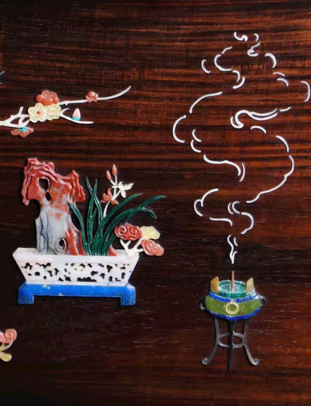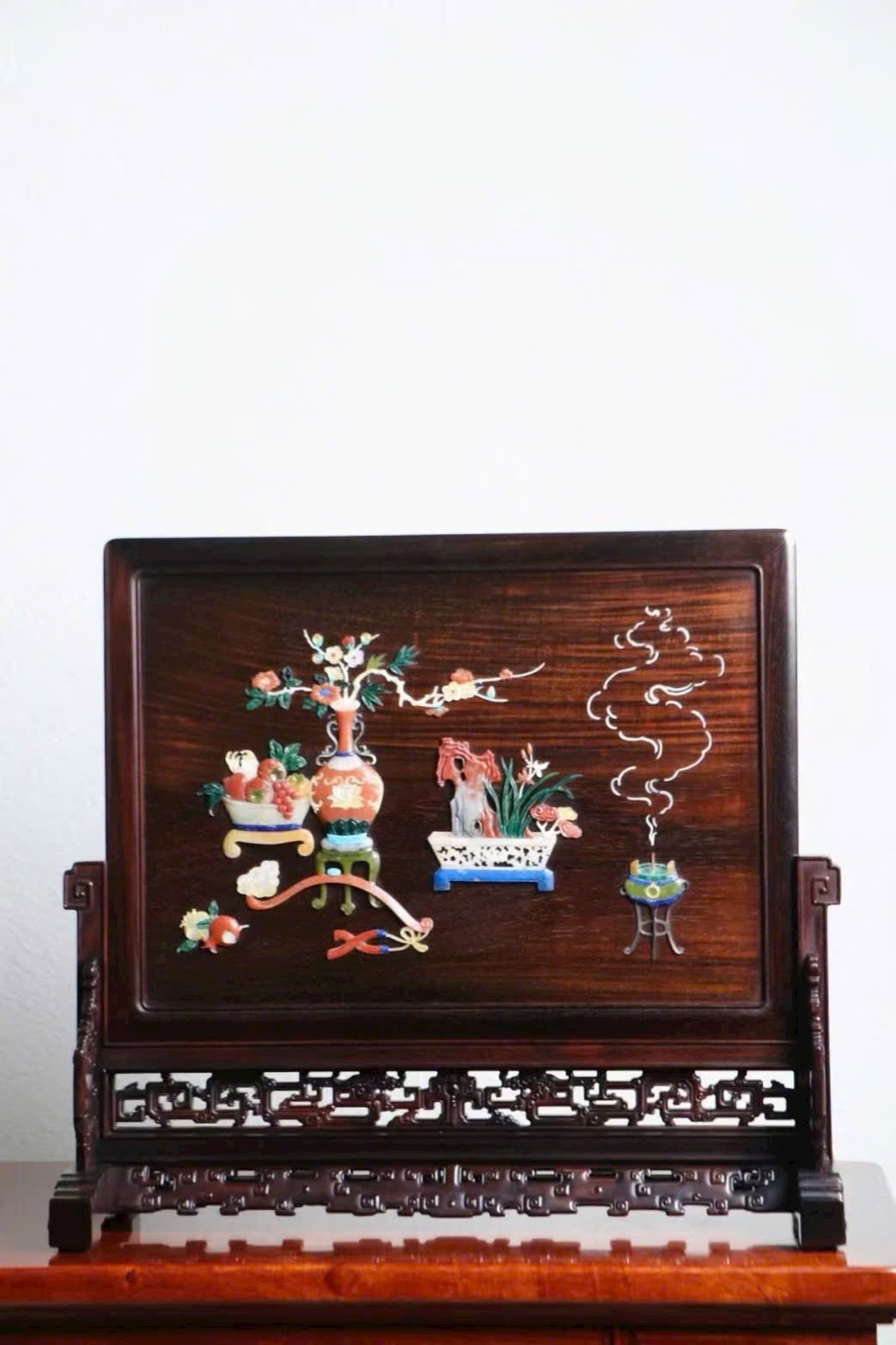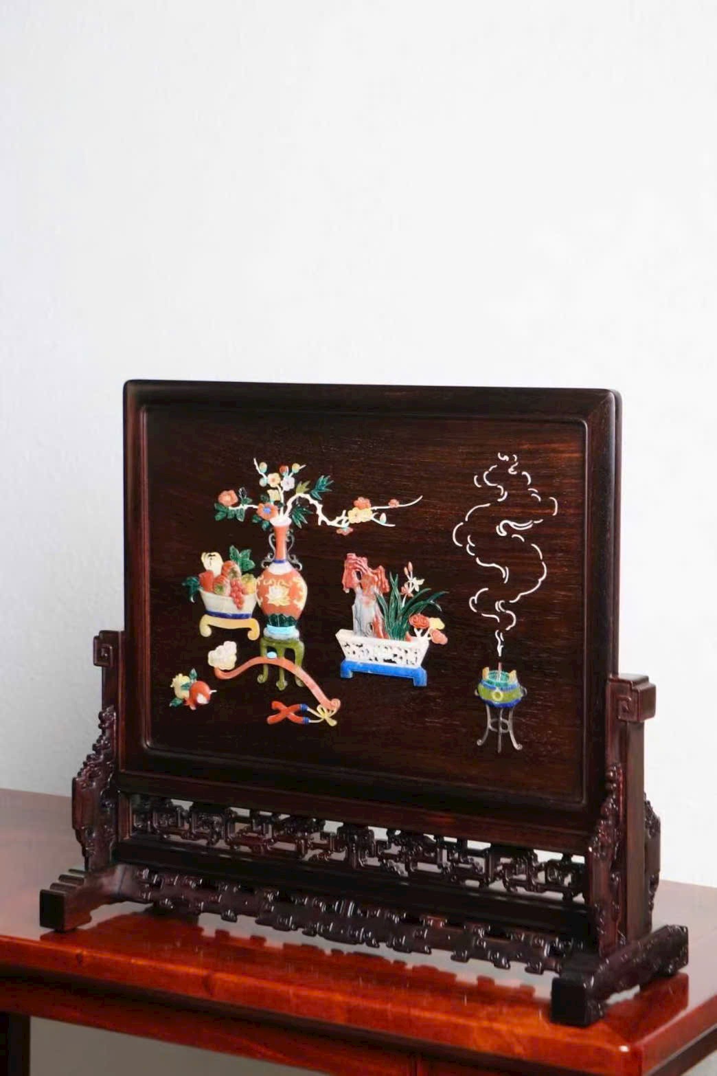 Phần tâm bình phong cẩn bách bảo tỉ mỉ, tạo thành tổ hợp thanh cung: bình hoa, lư hương, cổ ngoạn… tràn đầy sinh khí và văn nhã. Bày trong thư phòng hay trà thất đều đẹp mắt, mang ý nghĩa cát tường, phong nhã.