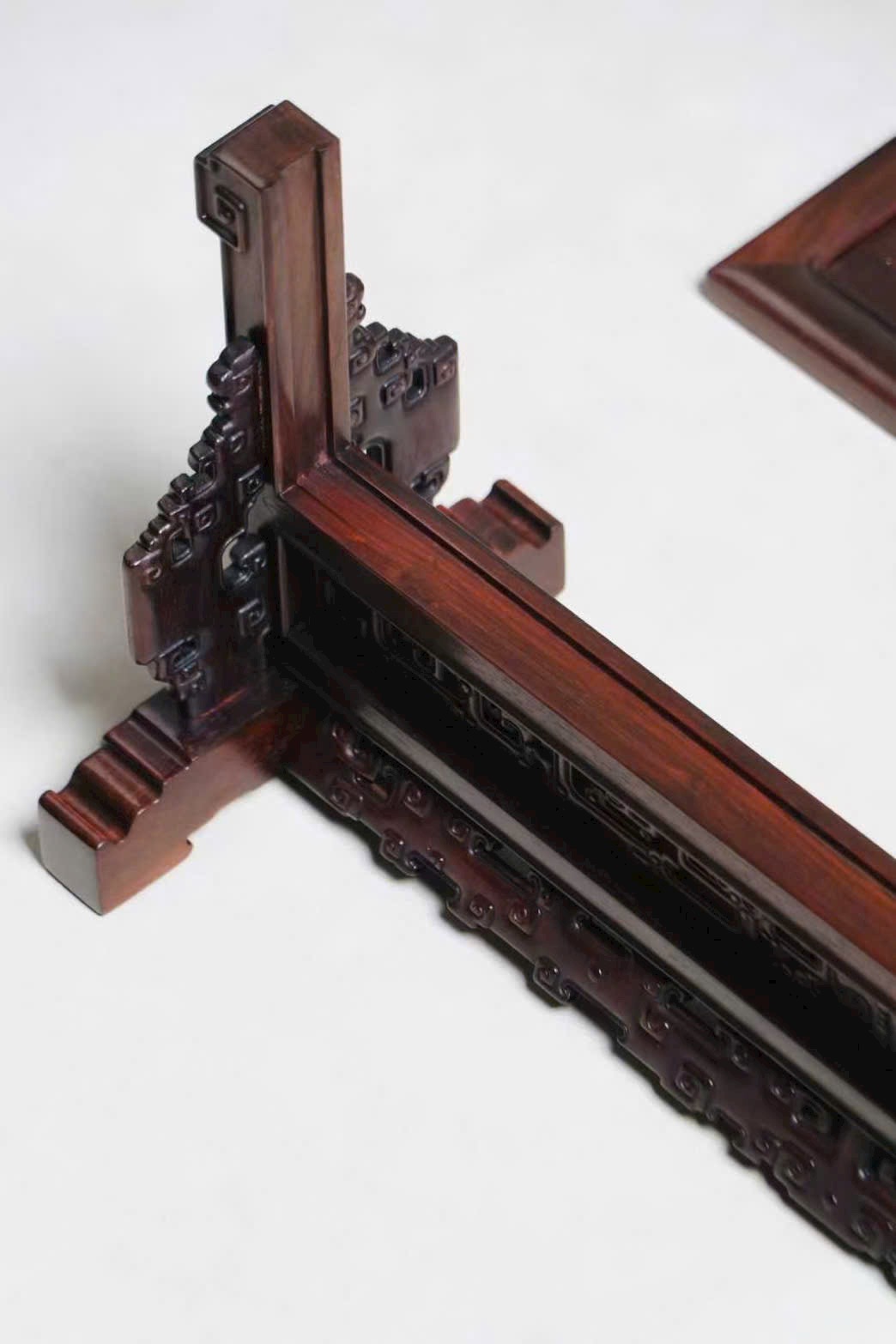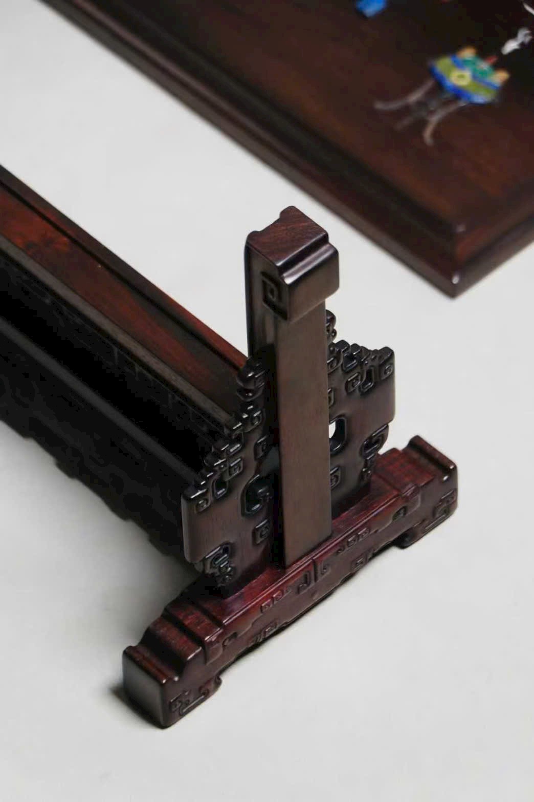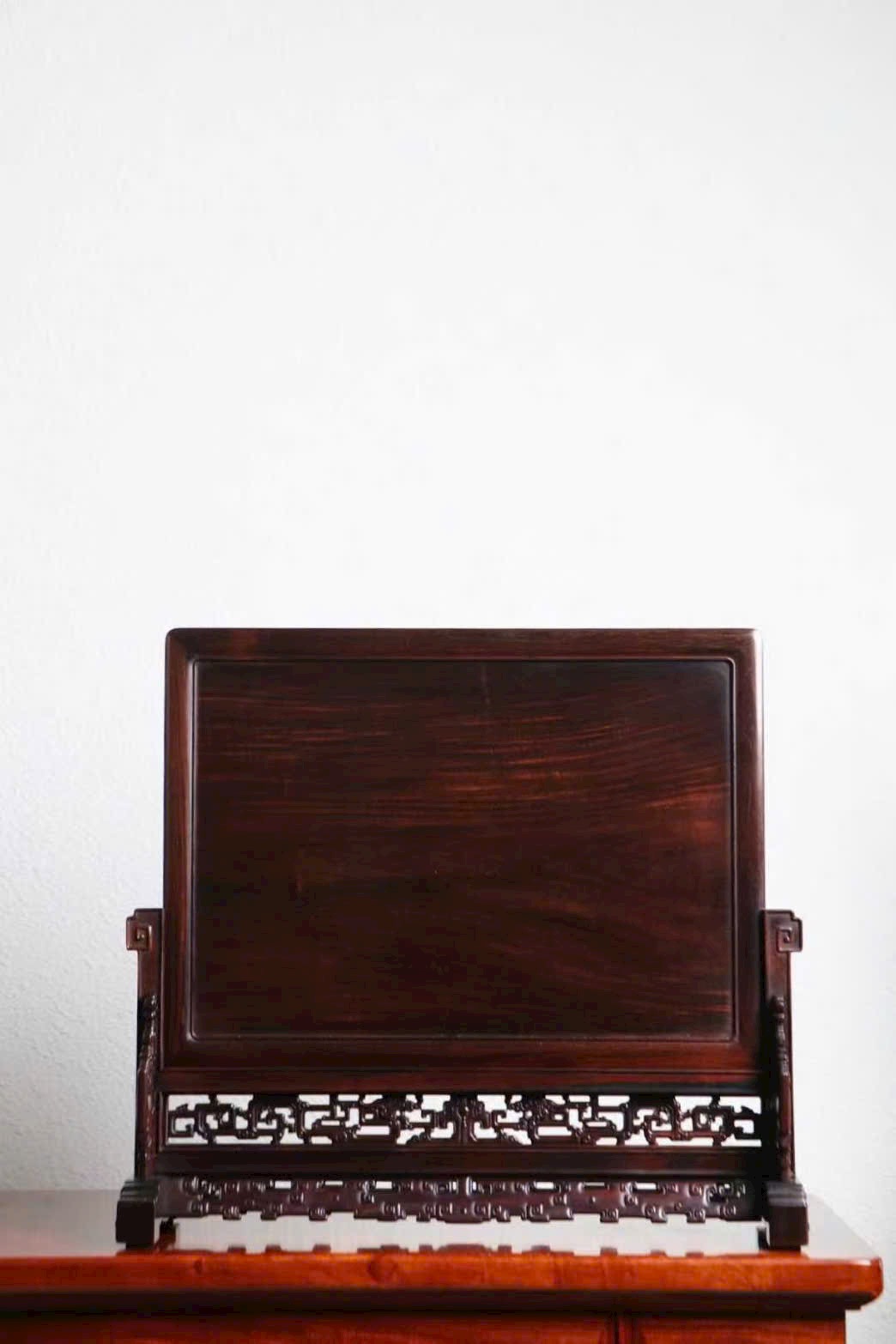 Chế tác tinh công từ gỗ Trắc Lào, thớ gỗ đều, màu sắc ấm nhuận. Đế bình phong đường nét thanh thoát, chạm nổi tinh tế, bố cục hài hòa vừa đủ.